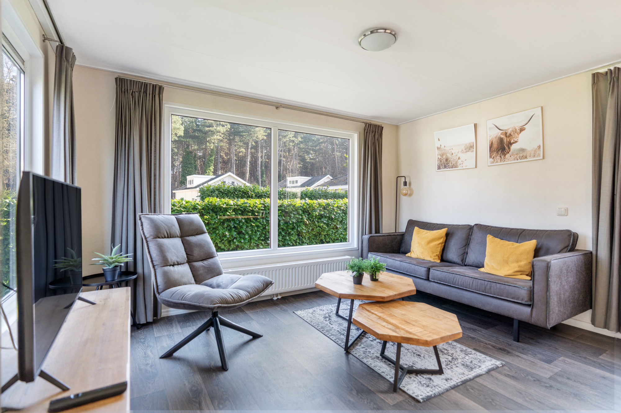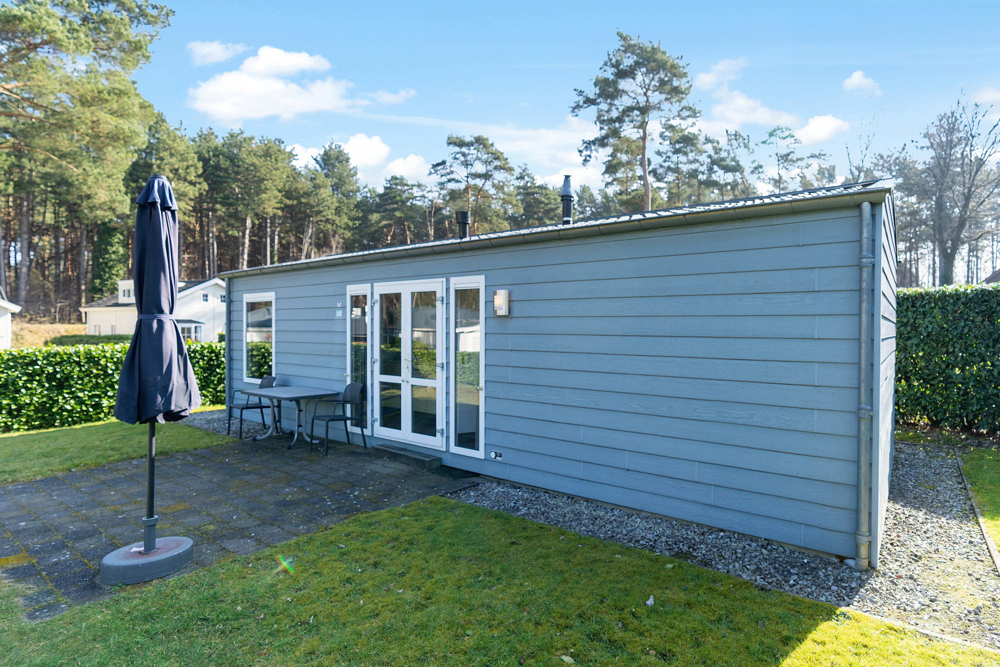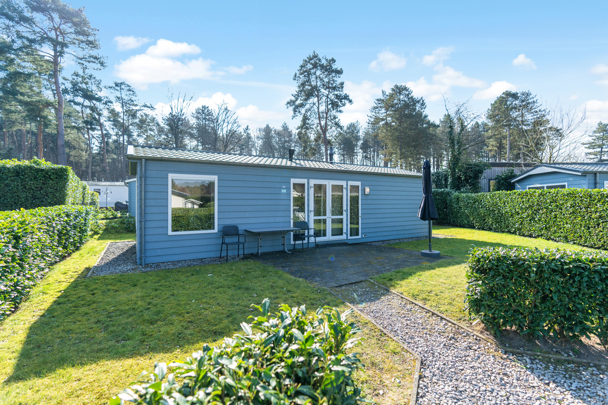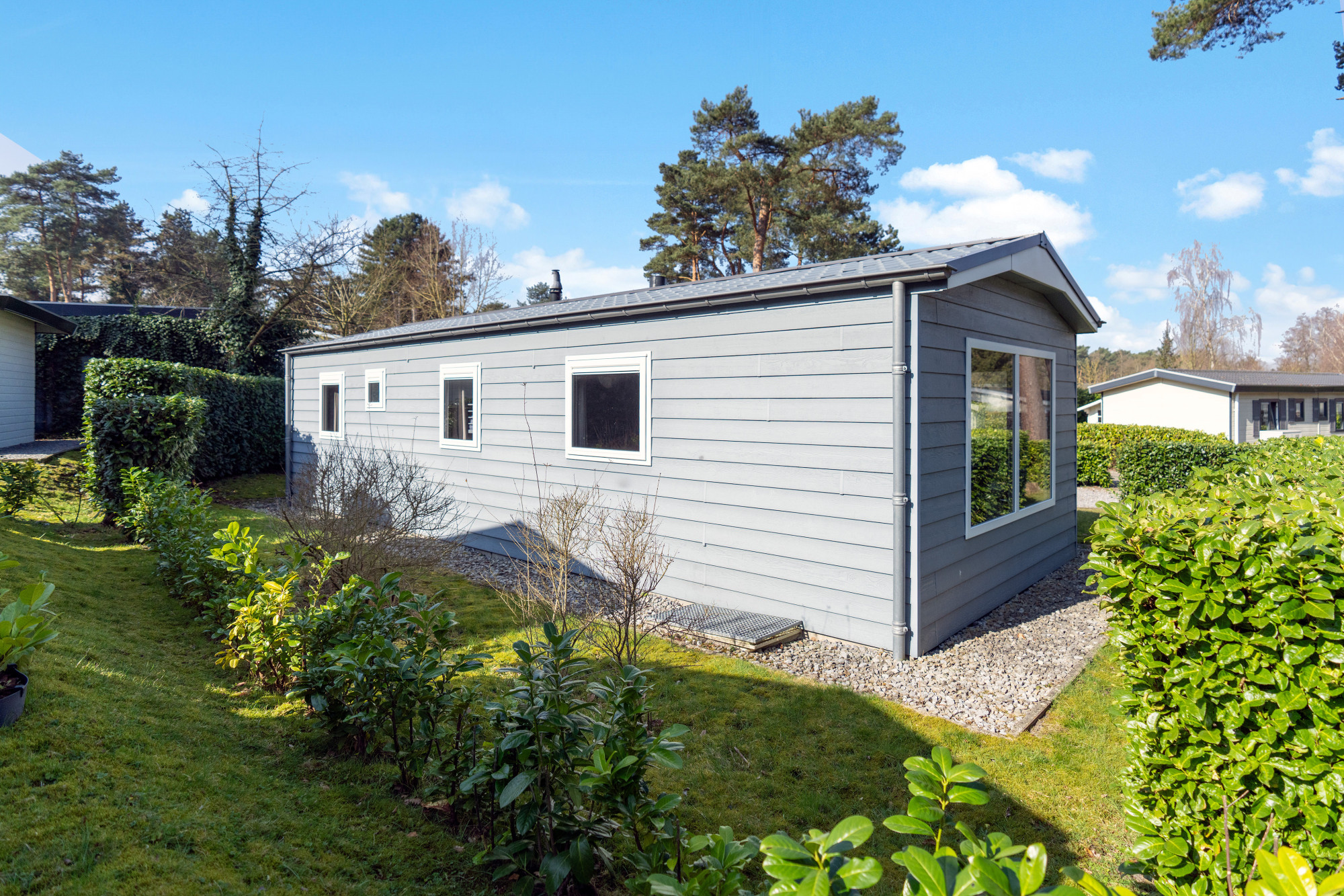 De woning heeft een royale, zonnige buitenruimte waar je in alle rust kunt genieten van de natuurlijke omgeving van het vakantiepark.