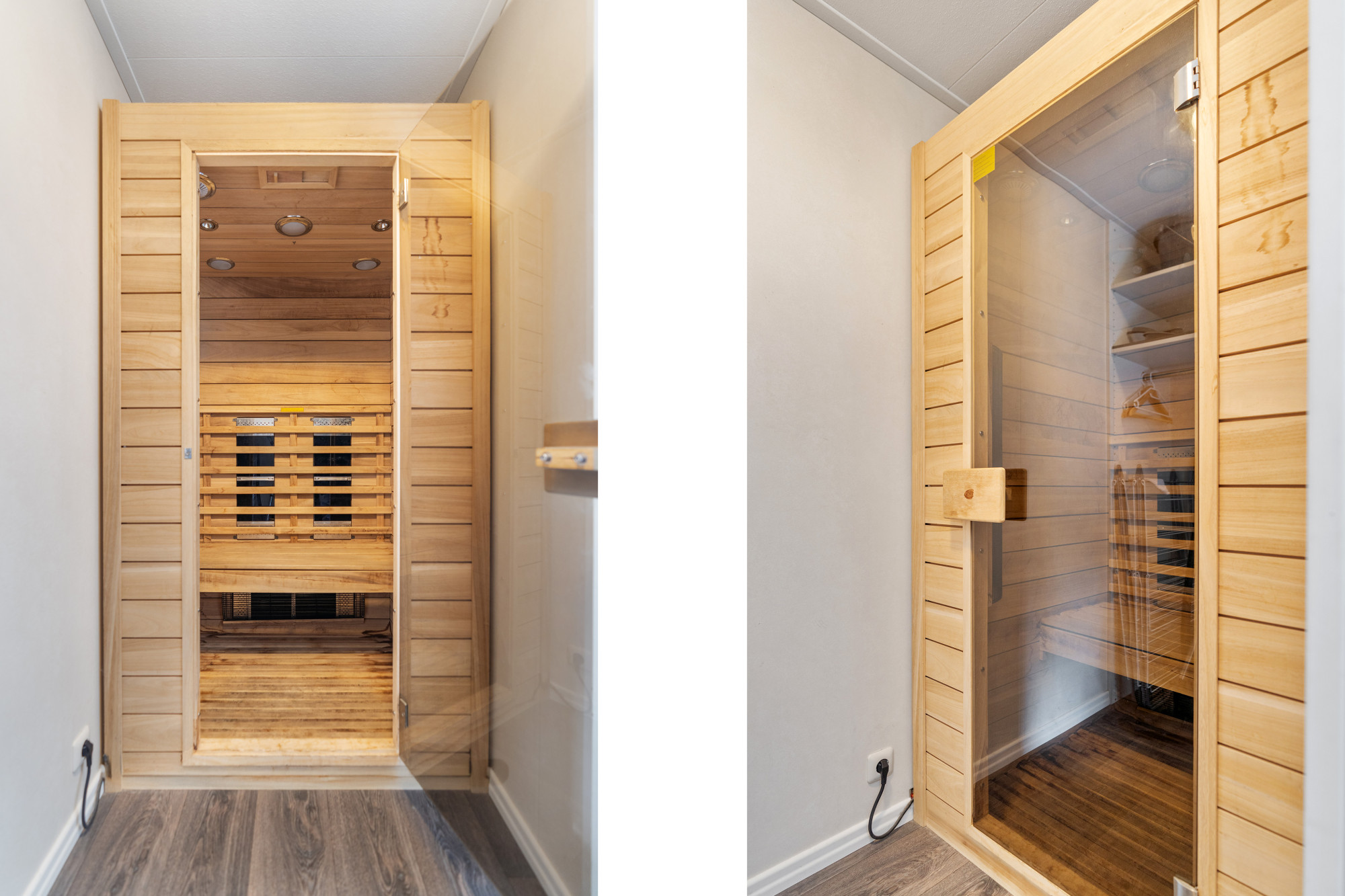 De compacte maar complete badkamer beschikt over een douche, wastafel en toilet. De woning beschikt ook over een infaroodsauna.