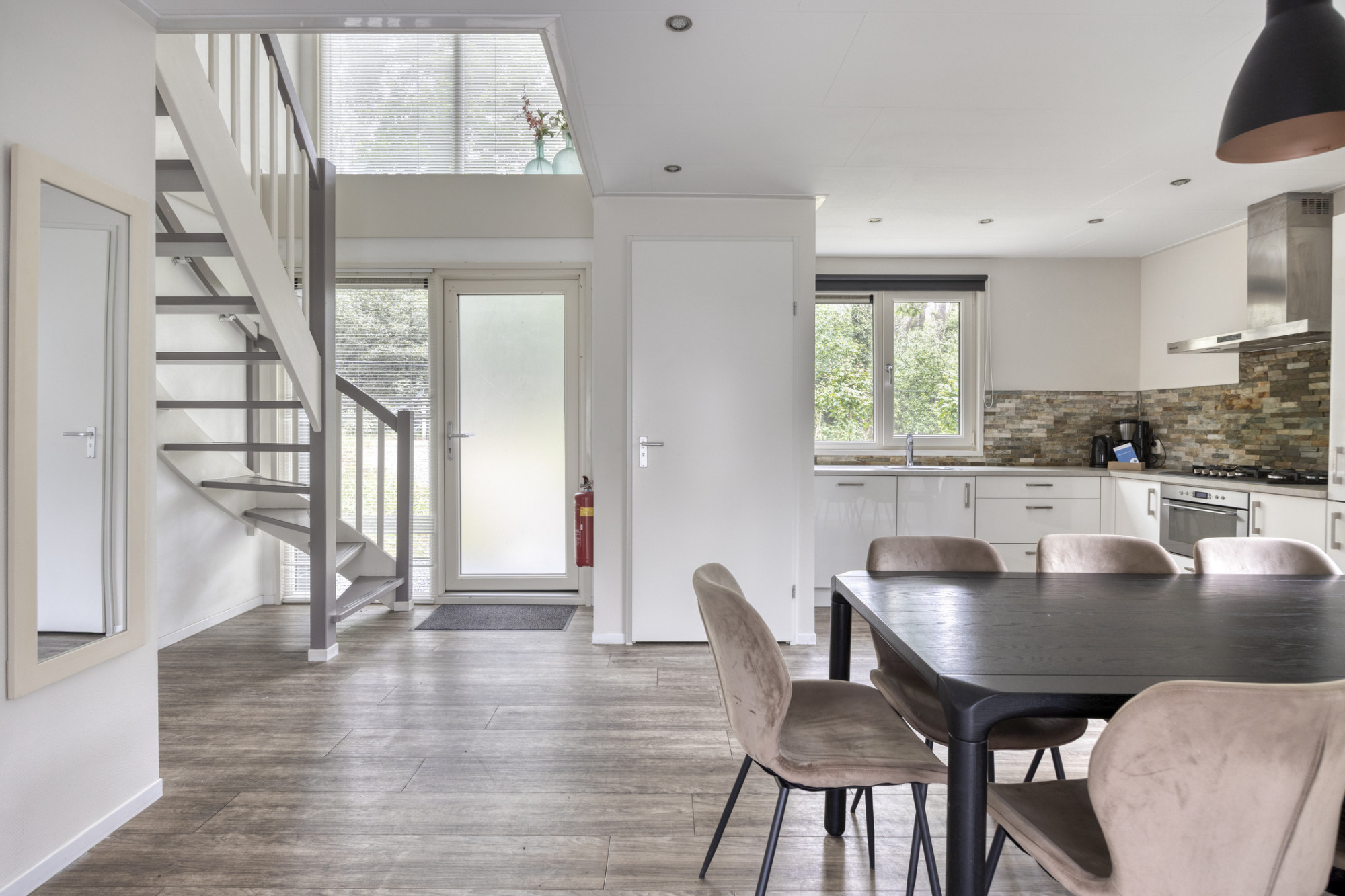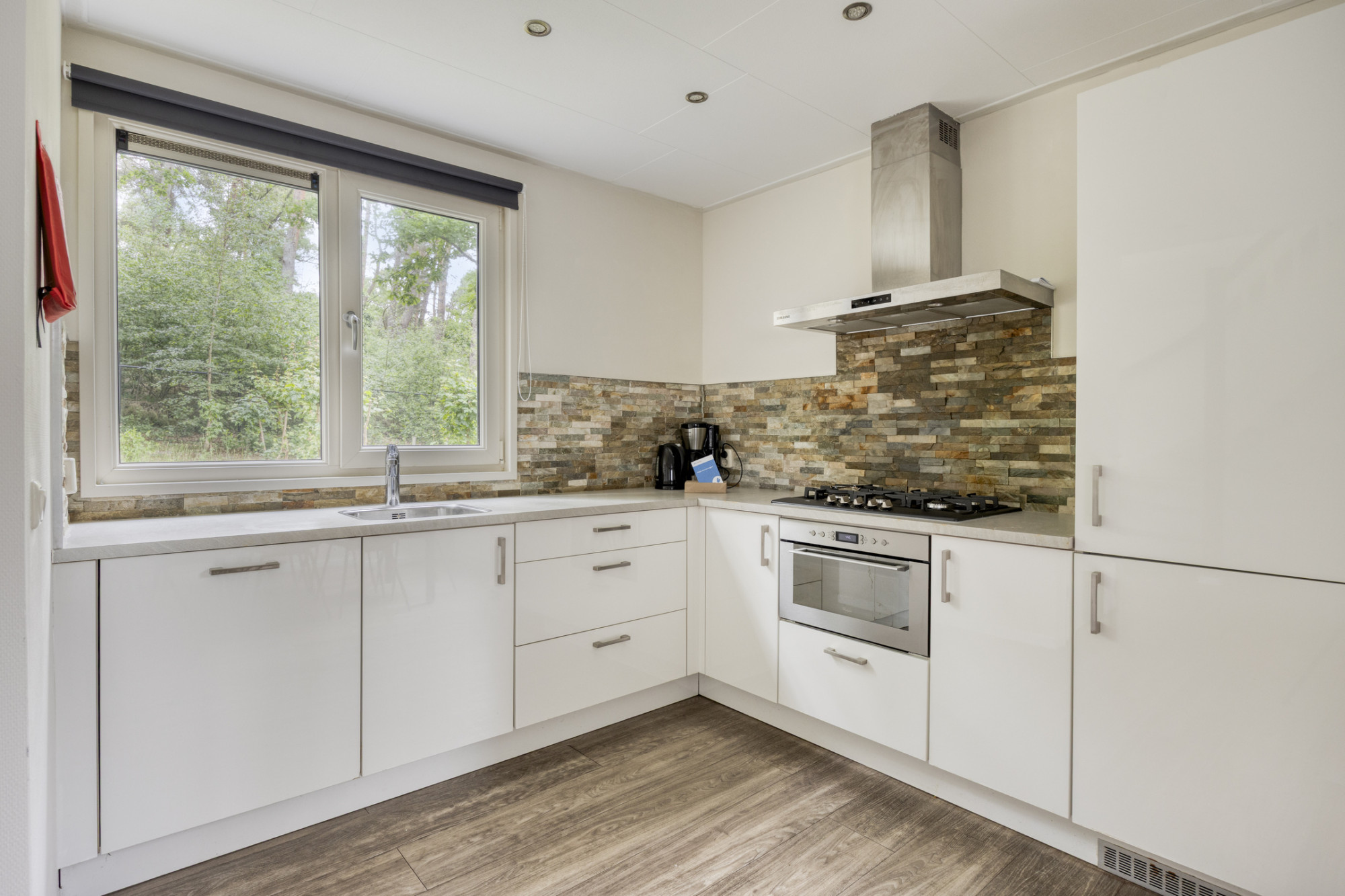 De open keuken is in een lichte kleurstelling uitgevoerd en van vele gemakken voorzien. Zo zit er een gaskomfoor, afzuigkap, koelkast met vriesvak, combi-oven en een afwasmachine. Daarnaast is er in de hal een kast voor de CV -ketel.