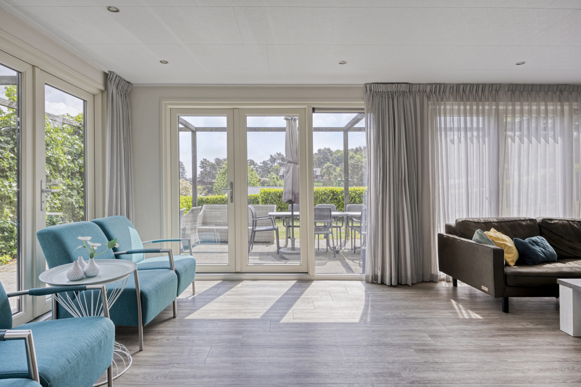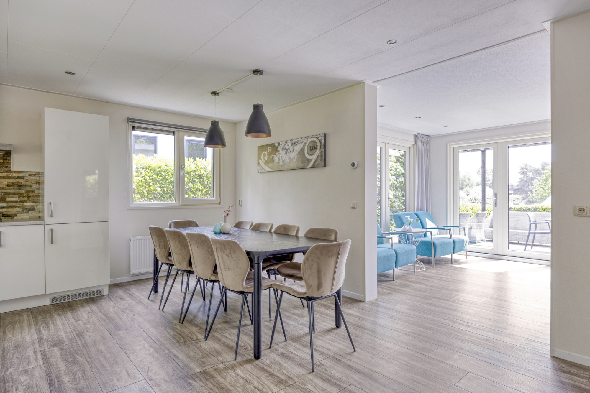 Bij aankomst bij de recreatiewoning kan er op eigen perceel worden geparkeerd. Via de deur aan de voorkant is de recreatiewoning te betreden. Aan de voorzijde is de royale woonkamer gelegen, deze ruimte is heerlijk licht door de grote raampartijen. Door de dubbele openslaande deur is het terras direct te bereiken, daardoor loopt binnen en buiten ook aangenaam in elkaar over. In de woonkamer is er naast de gezellige zithoek ook voldoende ruimte over gehouden voor een mooie tienpersoons eettafel bij de keuken.