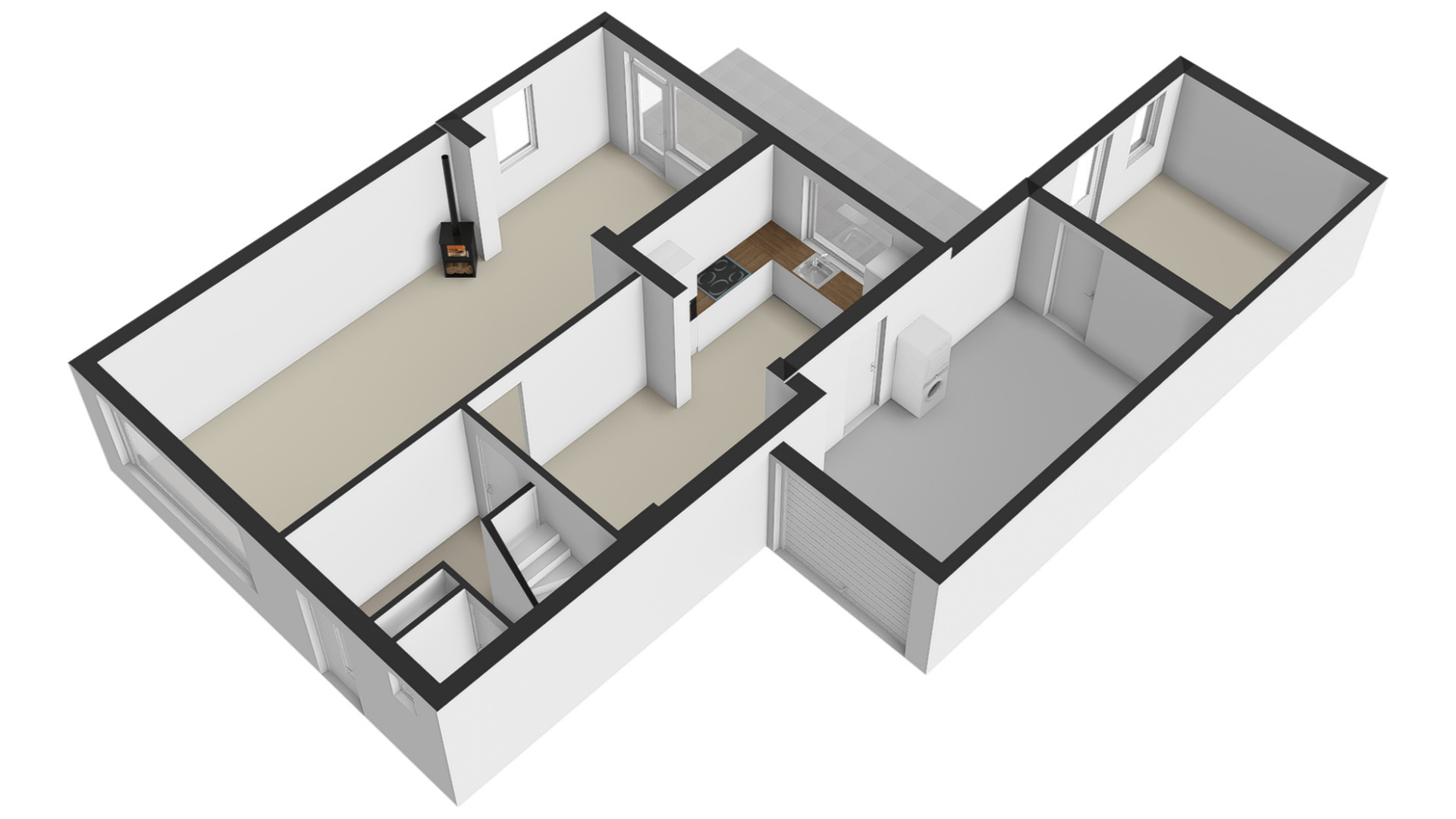 Naastgelegen, inpandig bereikbare garage voorzien van een elektrische sectionaalpoort, waar geplaatst de witgoedaansluitingen voor wasmachine/droger en extra opslagmogelijkheden.