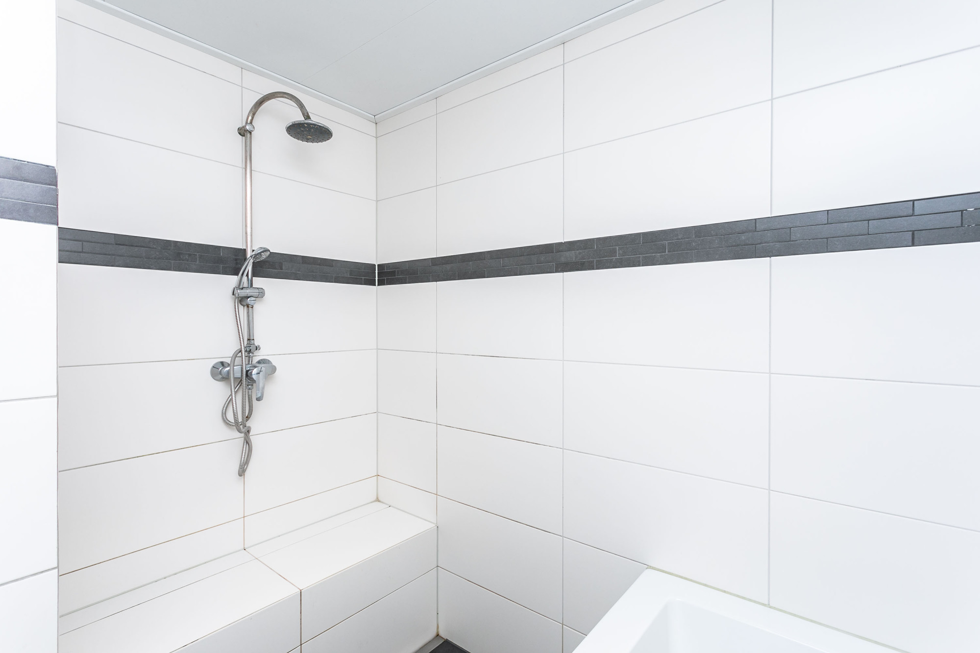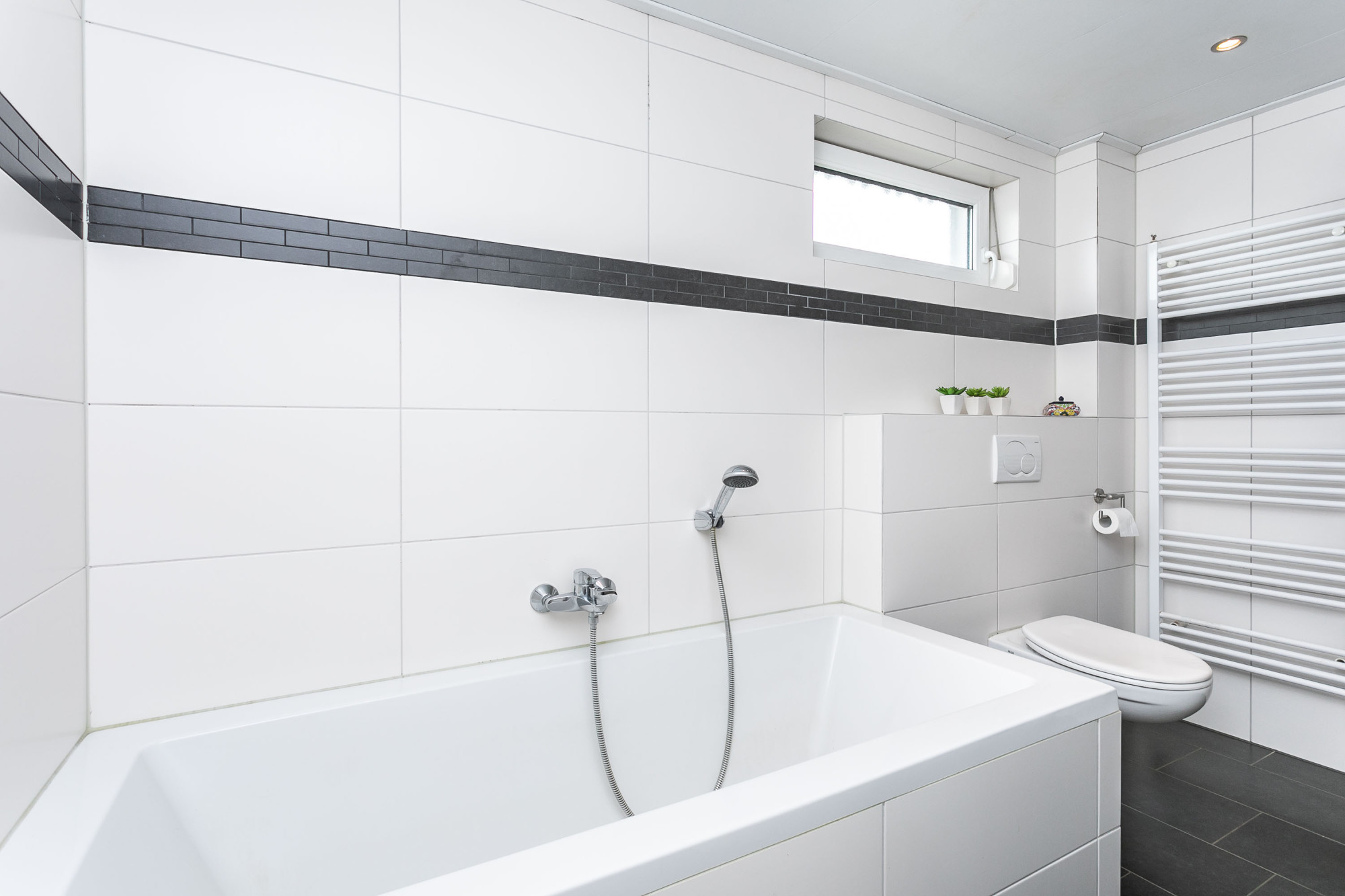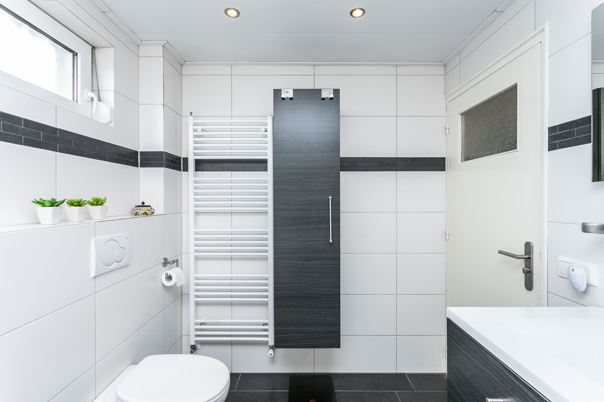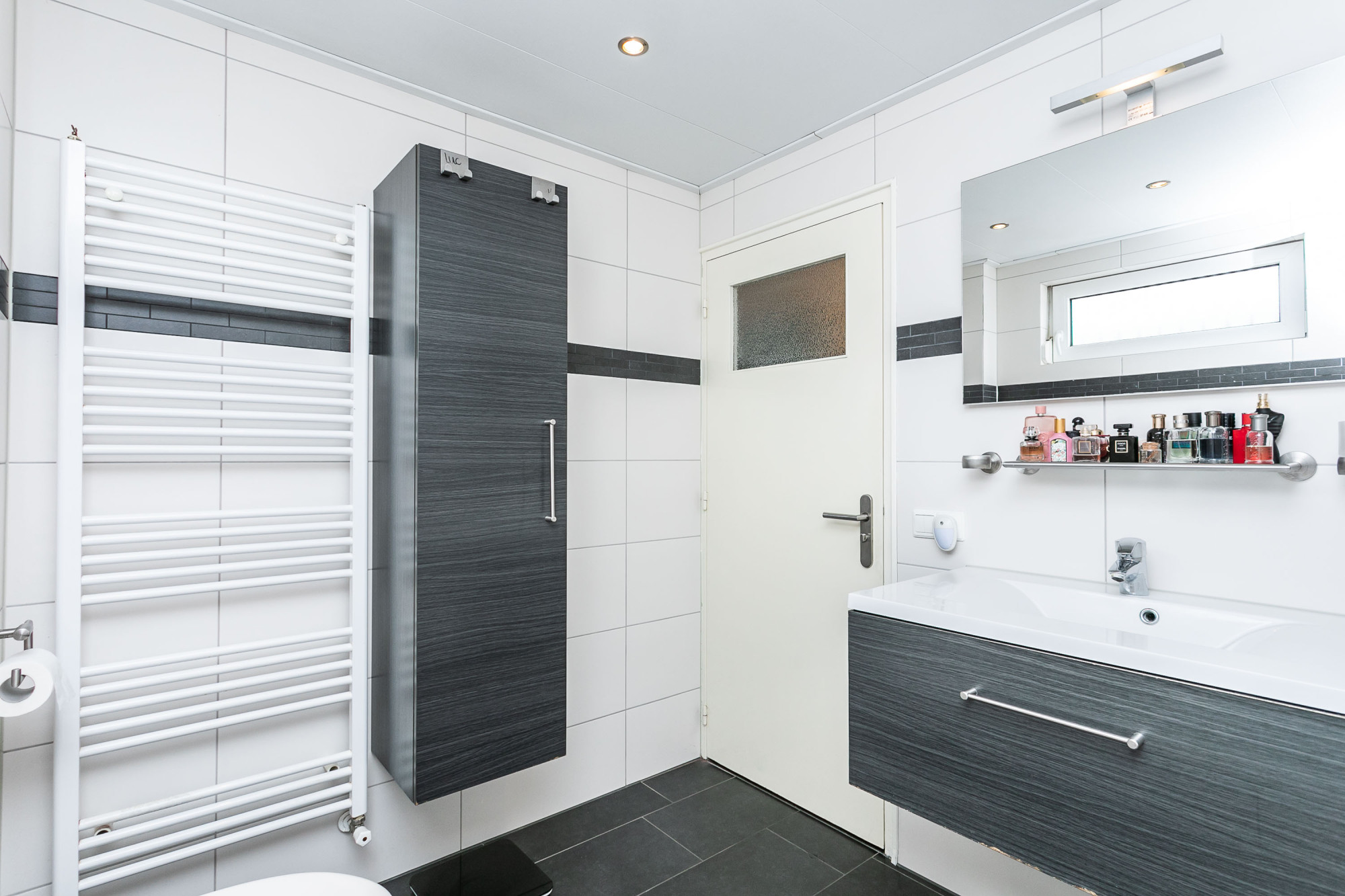 De strakke geheel betegelde badkamer is voorzien van een inloopdouche / ligbad / een wastafel in een badkamermeubel / handdoekradiator en tweede toilet.
