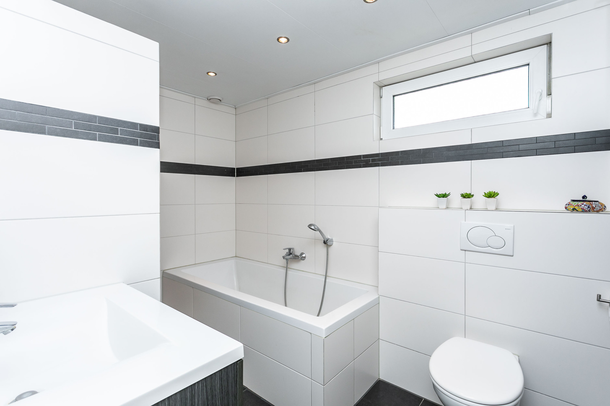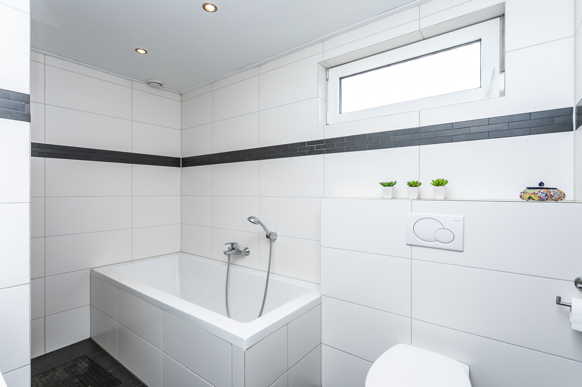 * STRAKKE BADKAMER MET INLOOPDOUCHE, LIGBAD, WASTAFEL IN EEN MEUBEL EN TWEEDE TOILET