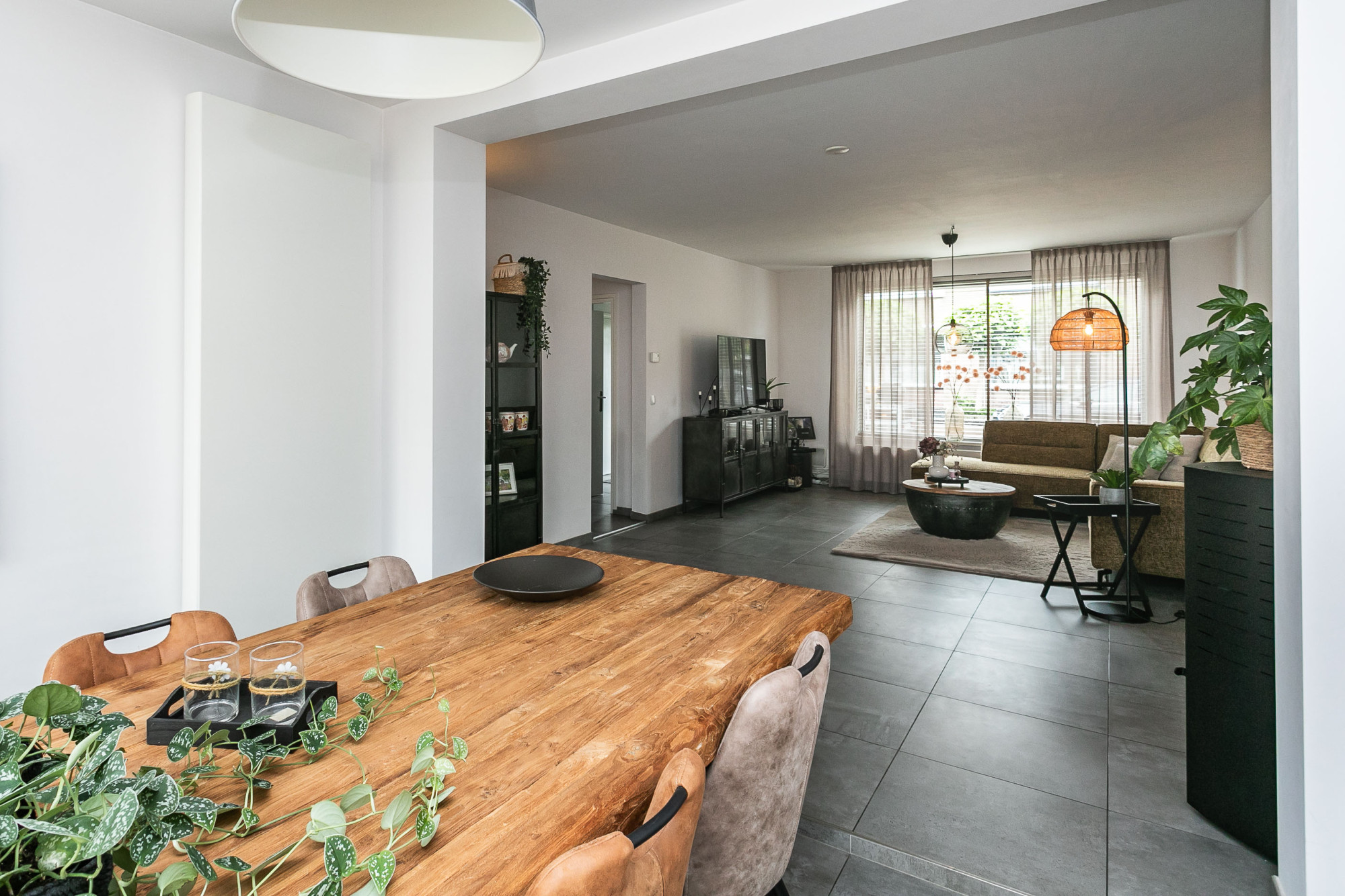 Ruime eetkamer en keuken, voorzien van een eigentijdse matzwarte inbouwkeuken in hoekopstelling, uitgerust met apparatuur, te weten: 4 zones inductiekookplaat / RVS wandschouwafzuigkap / combimagnetron / koelkast / wasbak / vaatwasmachine en veel opbergruimte. Loopdeur naar de garage.