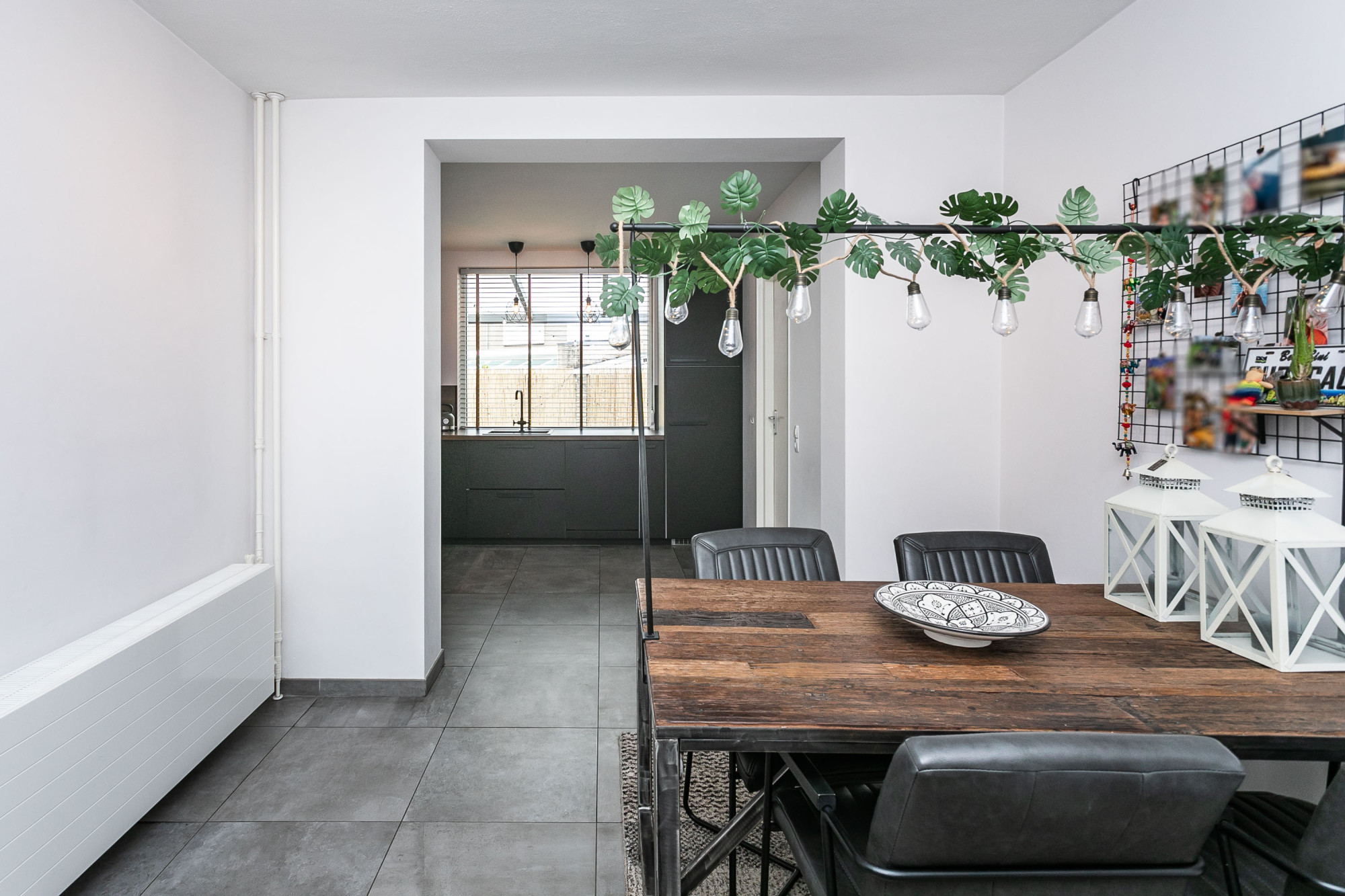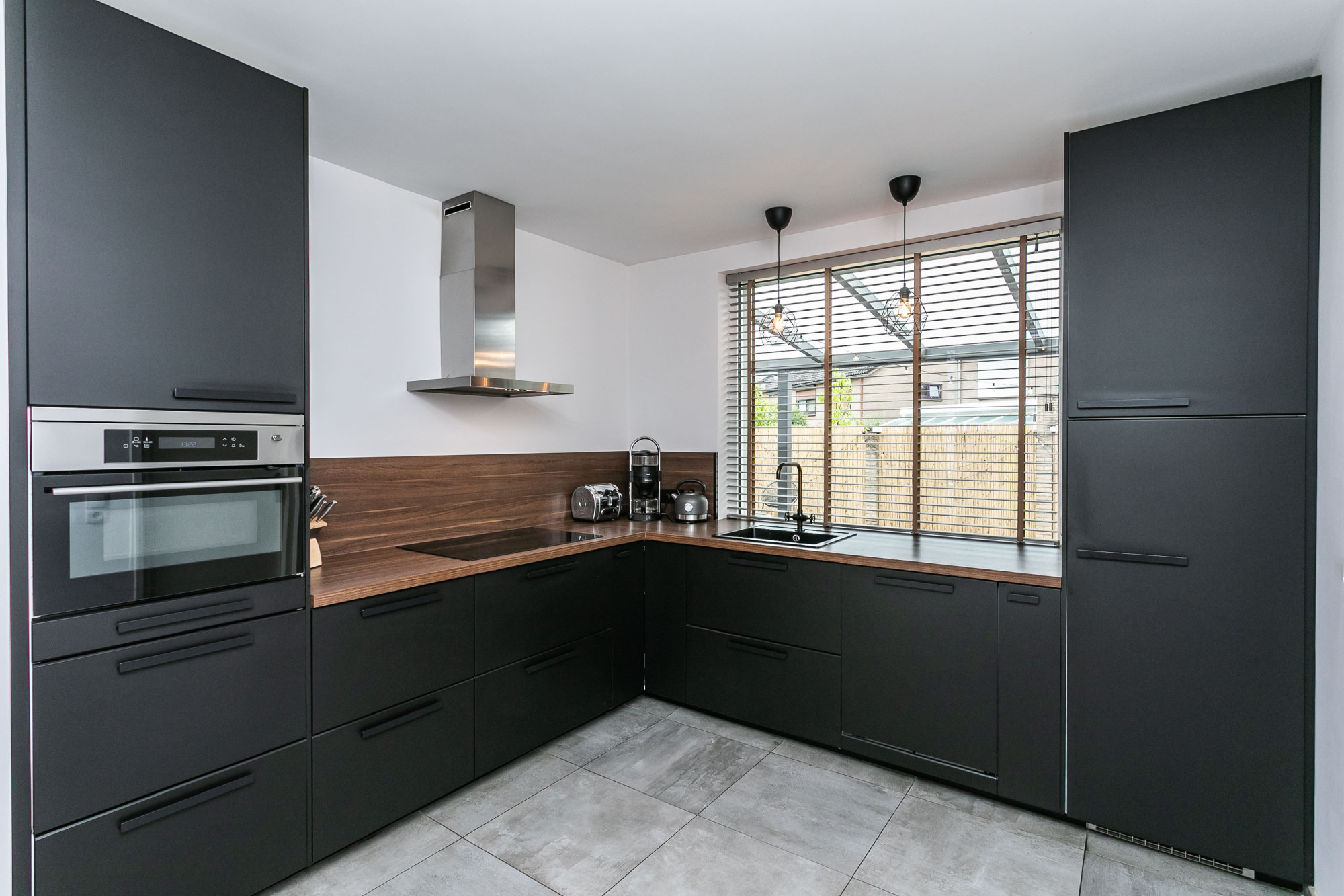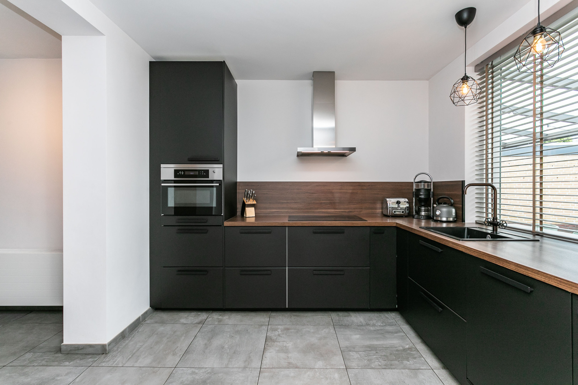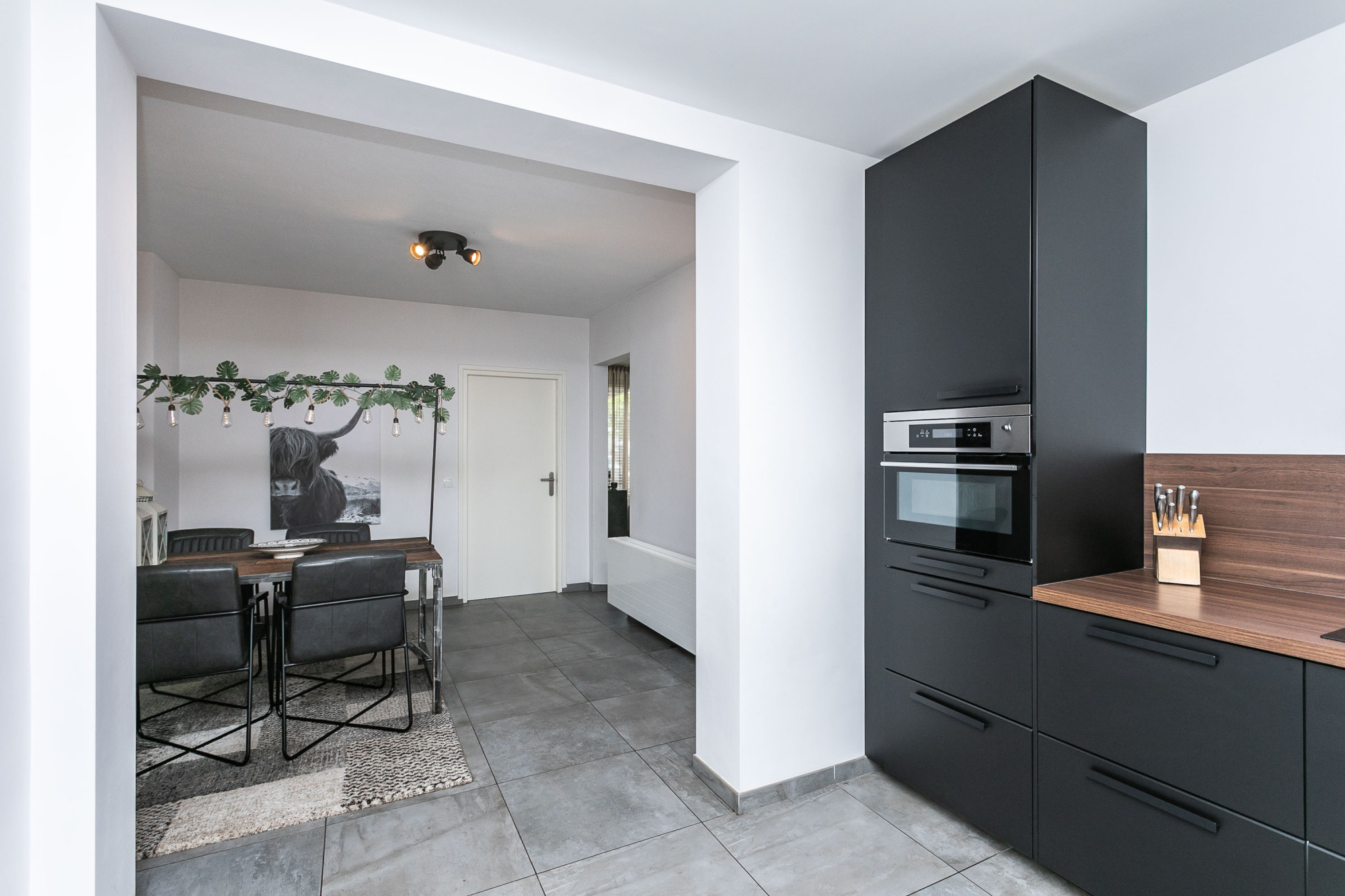 * EETKAMER MET EIGENTIJDSE INBOUWKEUKEN IN MATZWART VOORZIEN VAN APPARATUUR