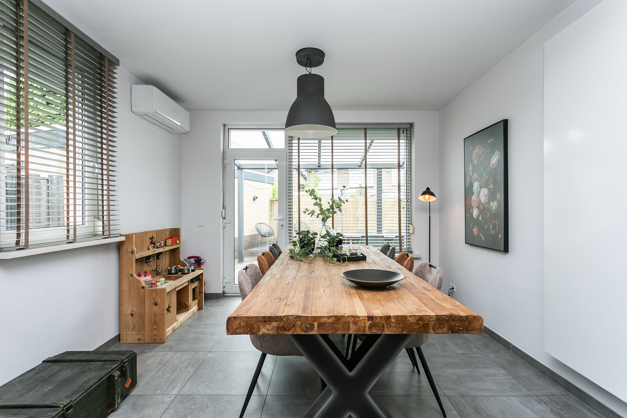 In de aanbouw gelegen tuinkamer met veel lichtinval door de grote raampartijen, waar geplaatst een eethoek en airconditioningsinstallatie. Via een loopdeur is er direct toegang tot het overdekte terras.