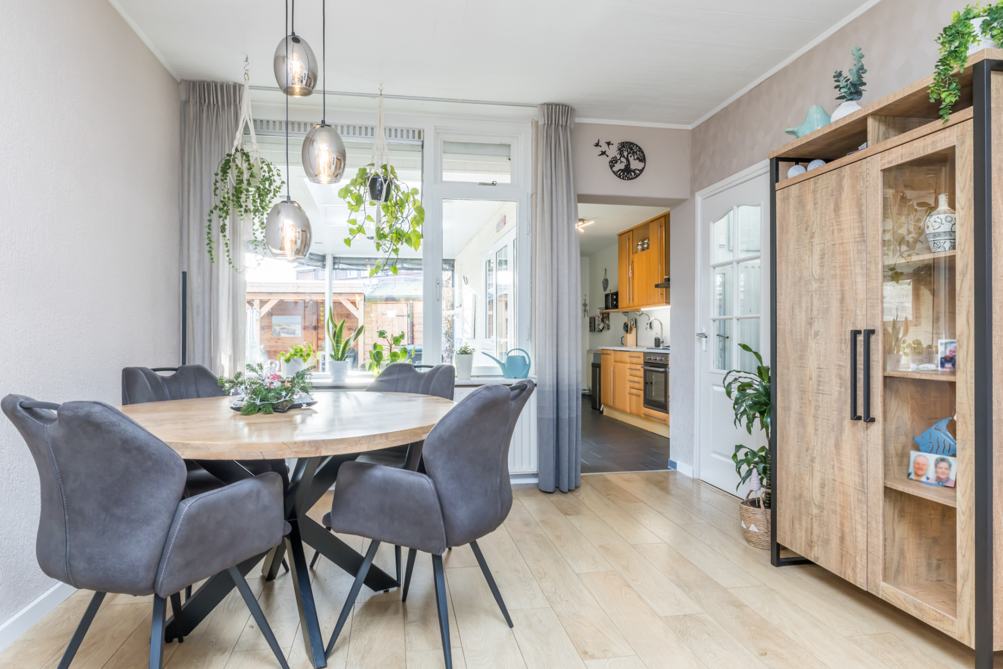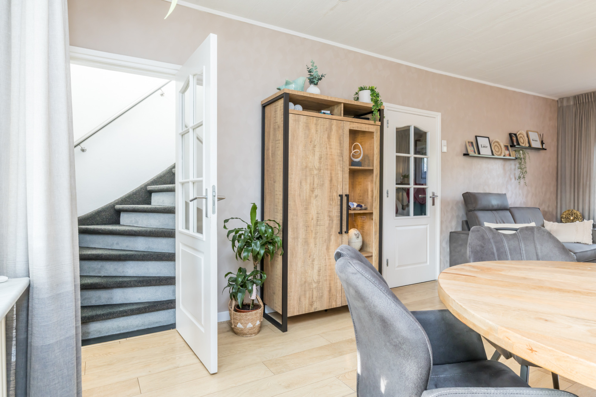 Centraal in de woning bevindt zich de eetkamer met airconditioning en de opgang naar de verdieping, wat zorgt voor een prettige en logische indeling.