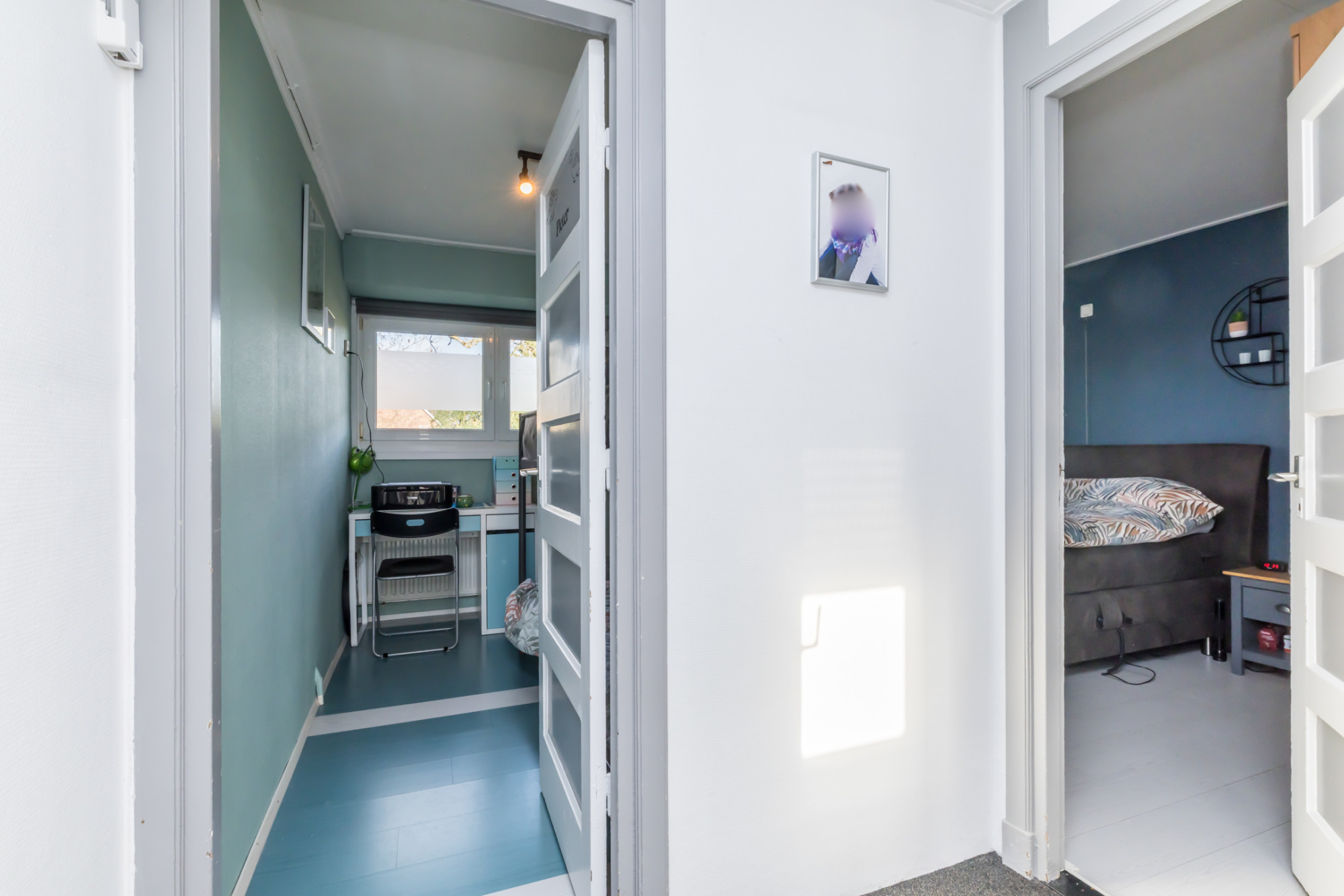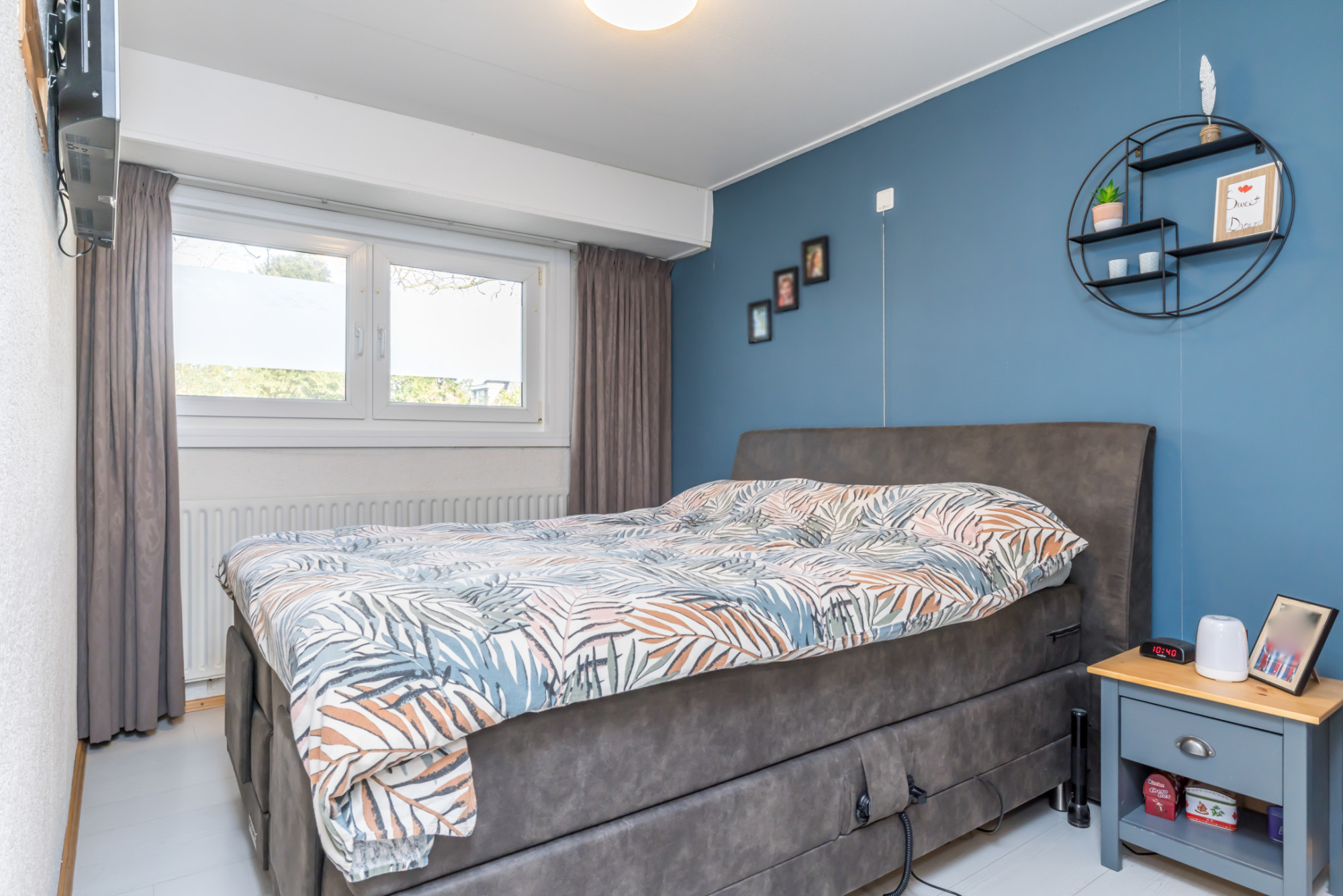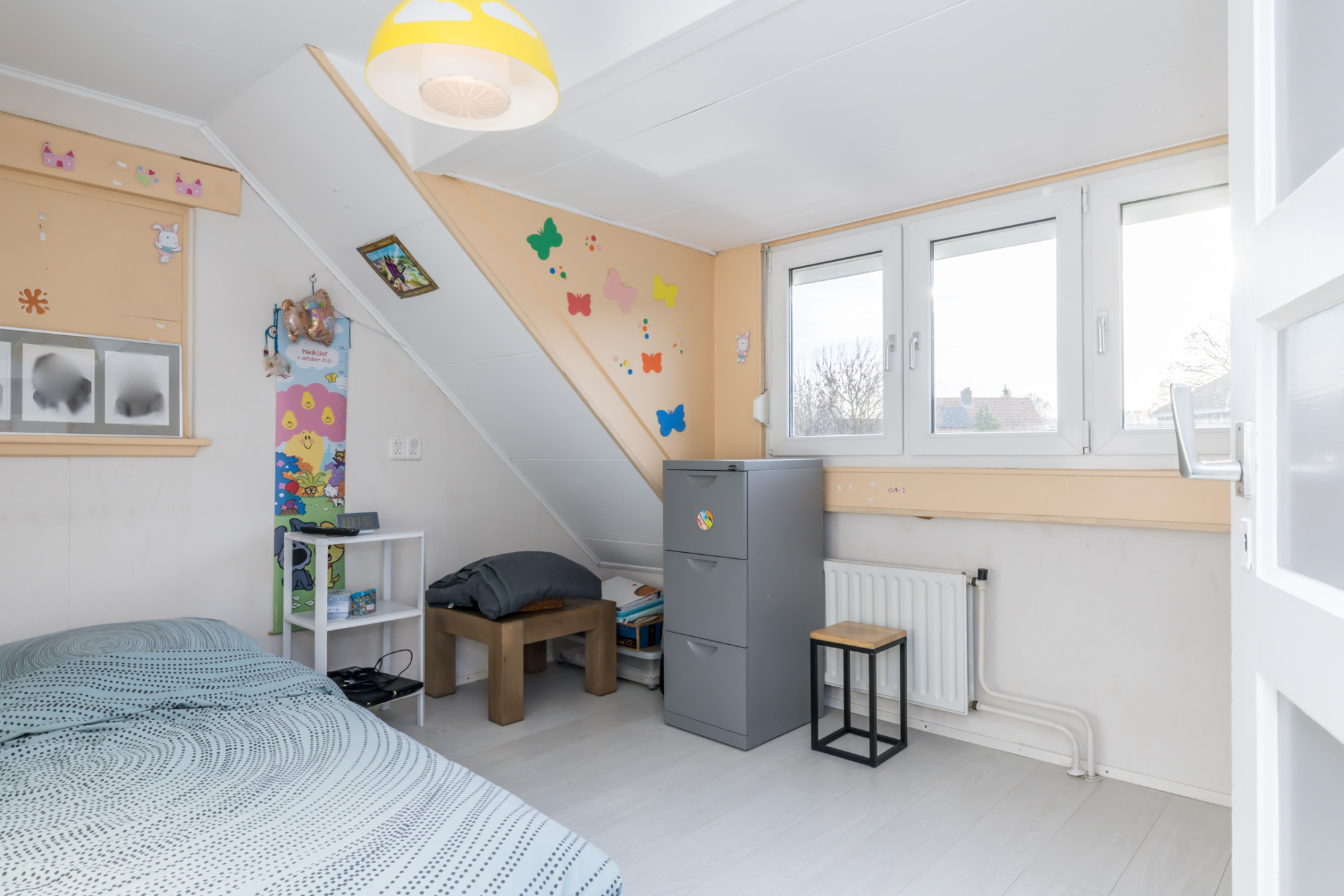 Aan de rechter voorzijde gelegen slaapkamer doet dienst als logeerkamer.