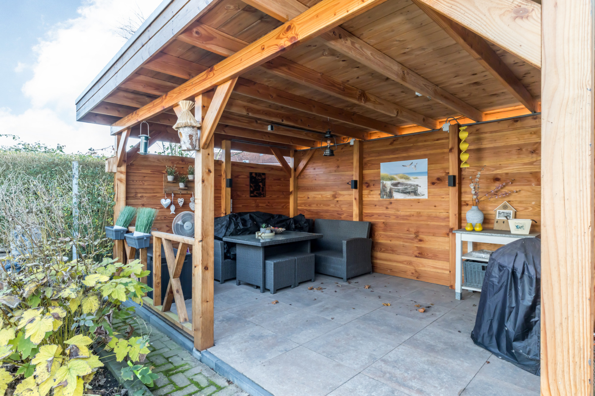 De geheel omsloten achtertuin is een echte plus: een ruim terras met overkapping voorzien van lichtkoepel en verandazeilen, borders met aanplanting, een stenen berging met standplaats voor de cv-combiketel, een extra berging én een houten prieel met gezellige zithoek.