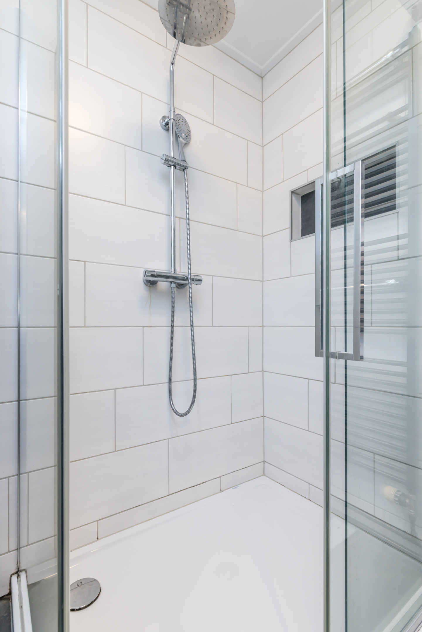 Op de begane grond is tevens een apart, geheel betegeld gastentoilet aanwezig met zwevend wandcloset en fonteintje. De strak afgewerkte badkamer is modern uitgevoerd en voorzien van een inloop-regendouche, vaste wastafel in badkamermeubel, mechanische ventilatie en een design radiator.