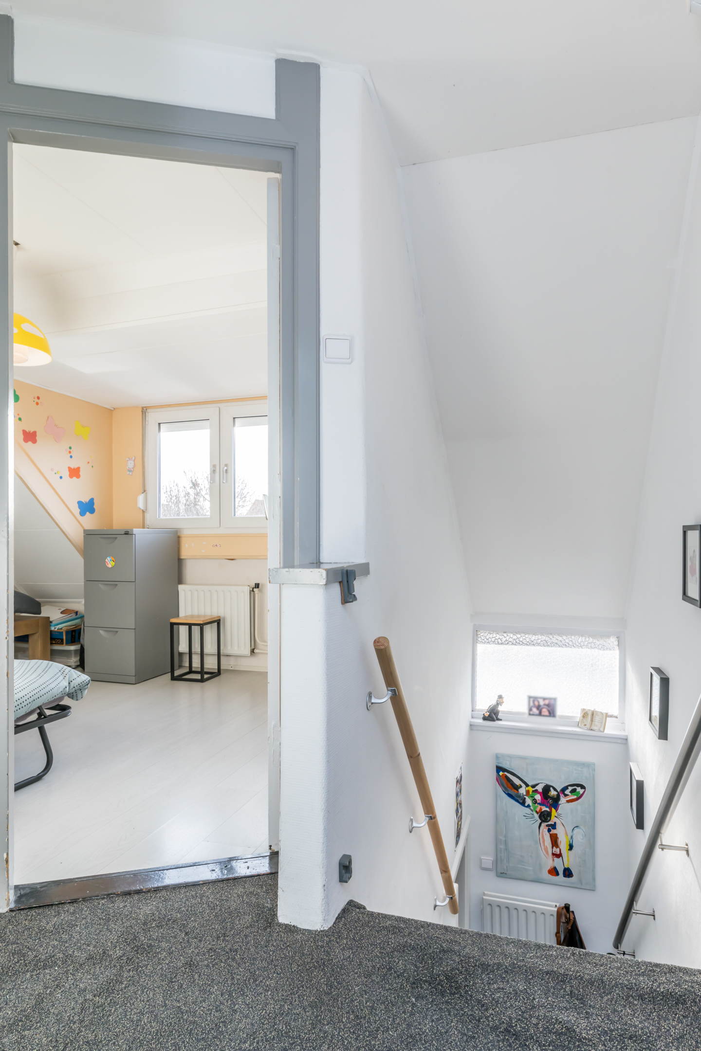 De slaapkamer aan de achterzijde is voorzien van een dakkapel en is eveneens in gebruik als logeerkamer.