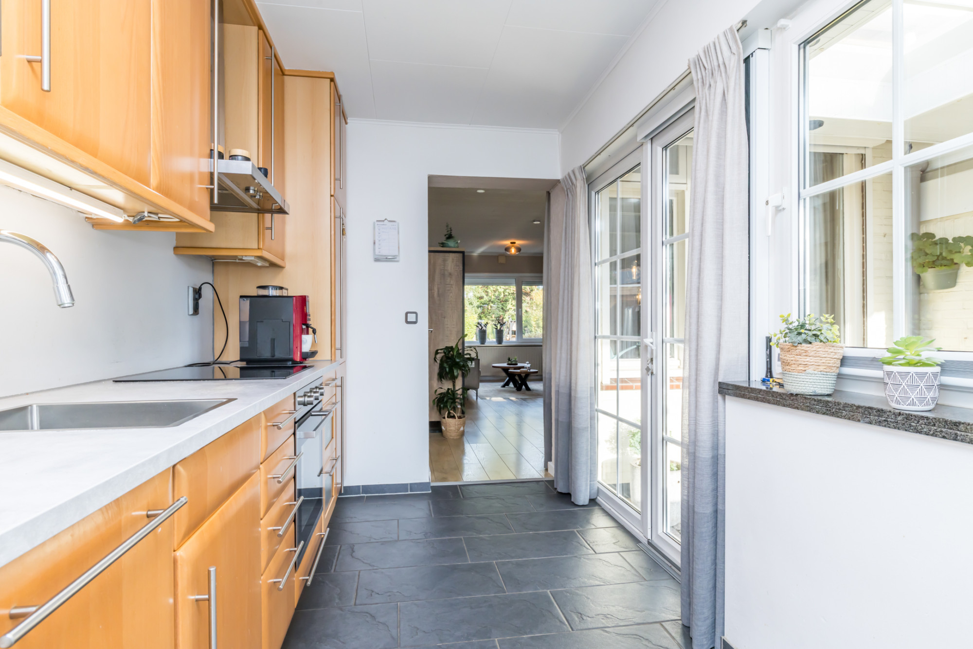 In achterbouw geplaatste keukenruimte, met plavuizenvloer en veel lichtinval, voorzien van een eigentijdse inbouwkeuken met apparatuur, te weten: 4 zones inductie kookplaat / RVS-wandschouw afzuigkap / elektrische oven / lady-vaatwasmachine / wasbak met close-in boiler / koelkast / veel bergruimte en dubbele openslaande tuideuren naar het overdekte terras.