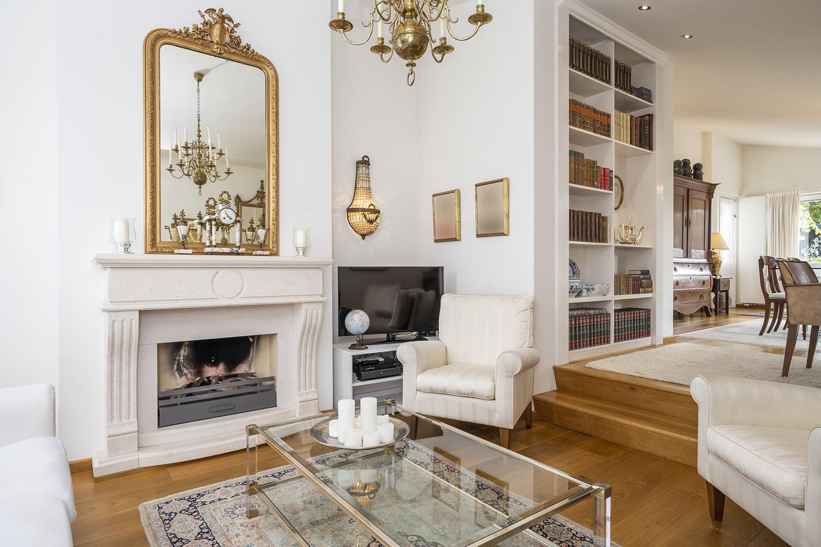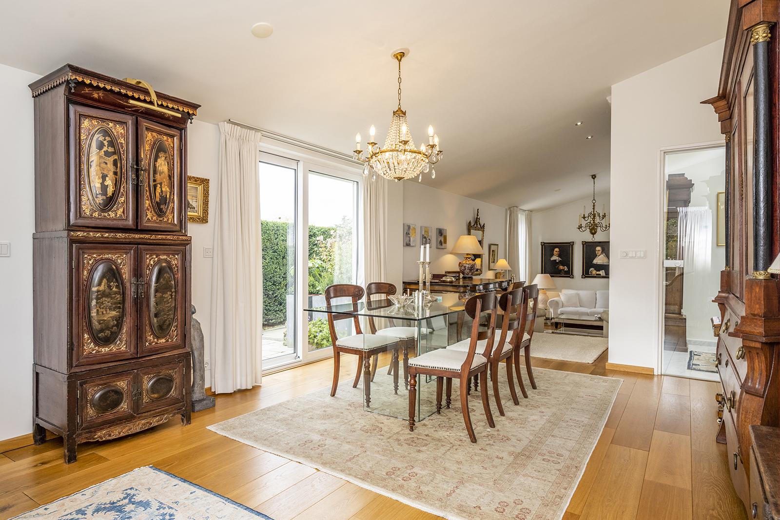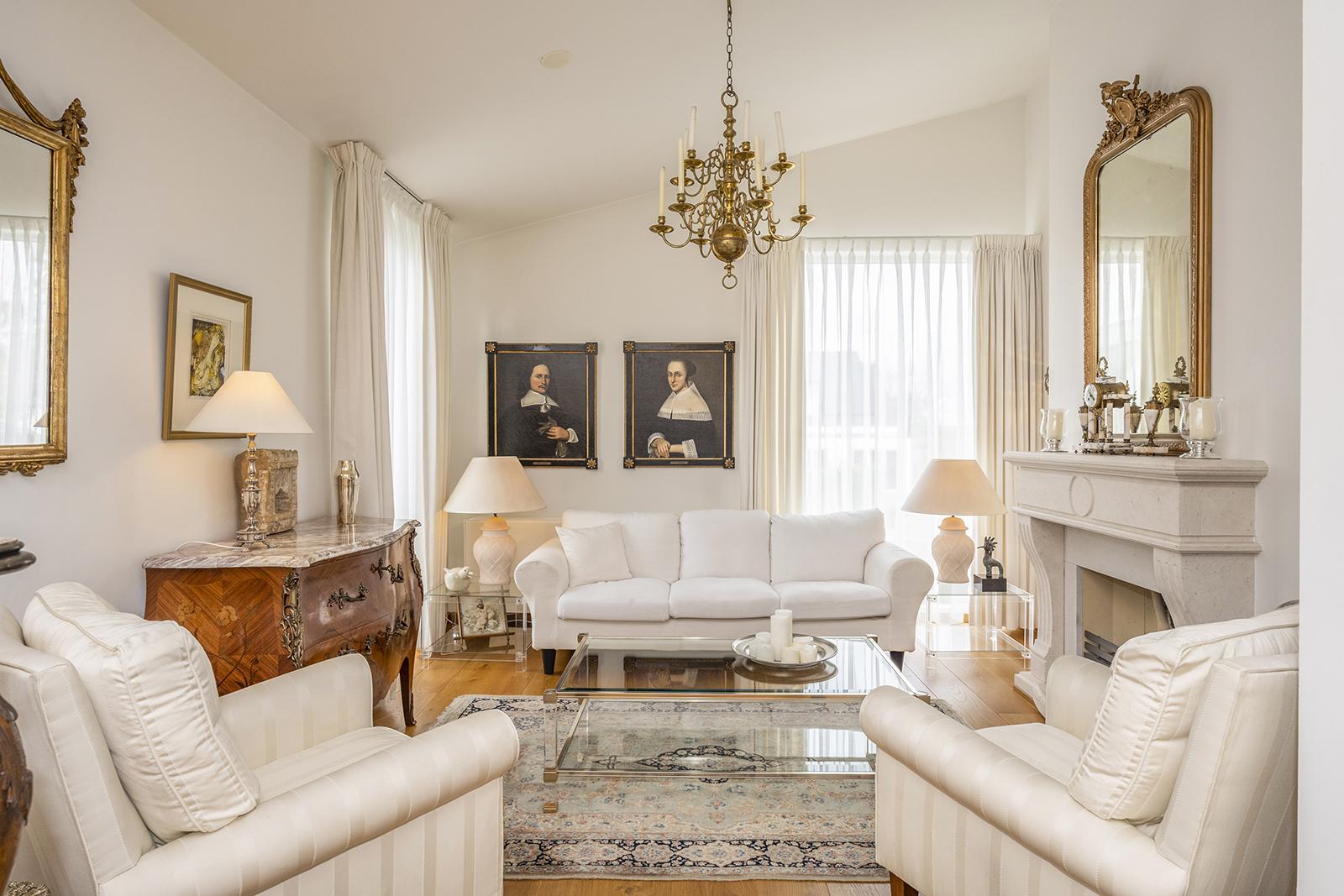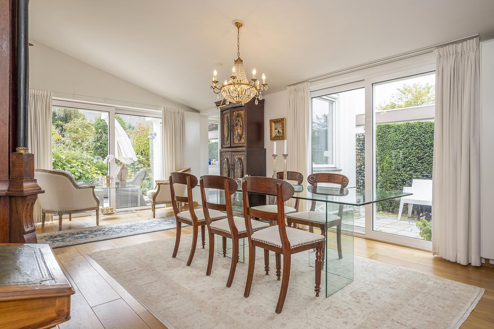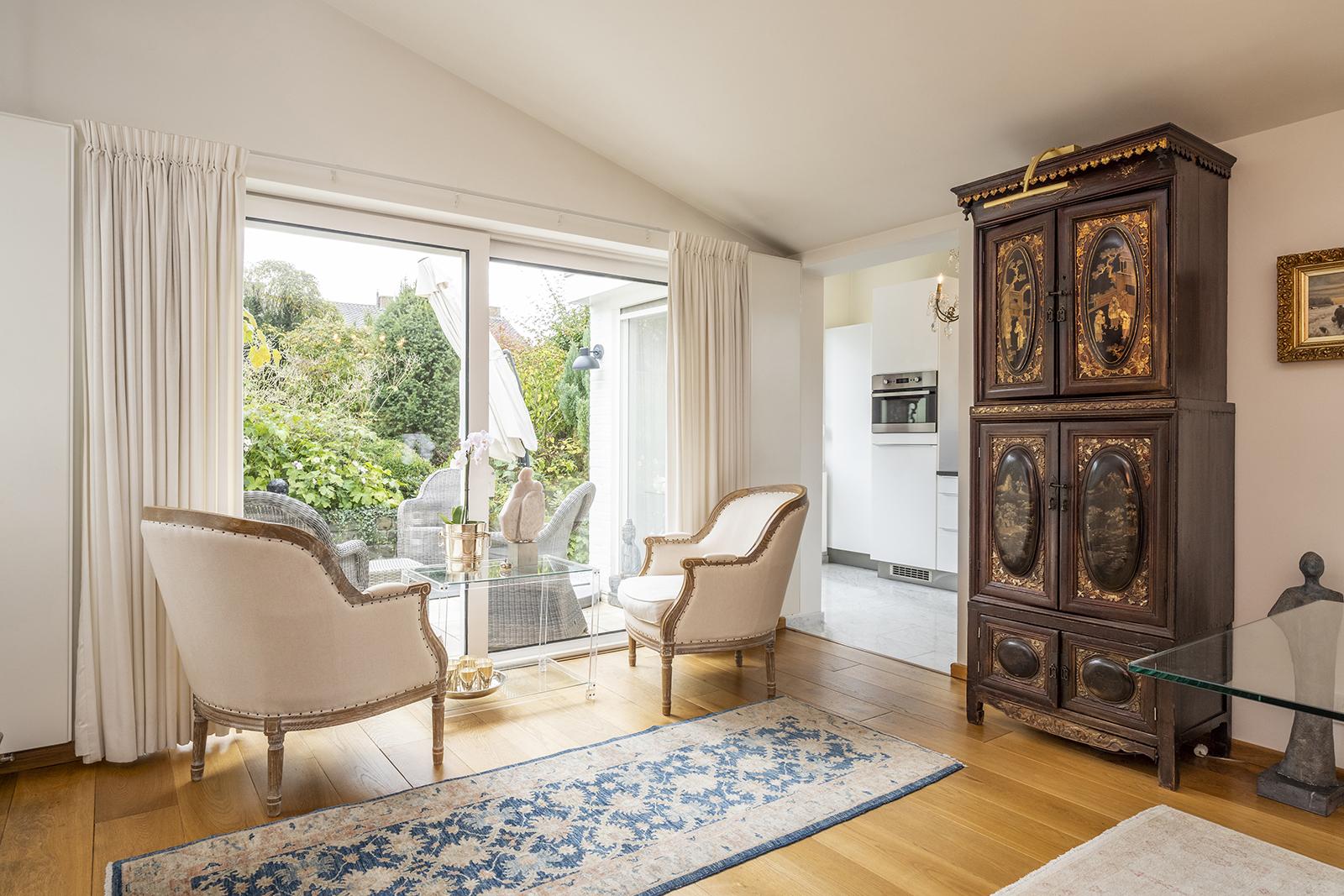 Halverwege de bordestrap ziet u een glazen deur naar de verrassend ruime woonkamer. Mooie elementen zijn het schuine dak, de dubbele schuifpui naar de tuin en de eiken parketvloer. Aan de voorzijde is het zitgedeelte met open gashaard en bij de eerste schuifpui is ruimte voor een grote eettafel. Aan de achterzijde, bij de schuifpui aan de zuidkant, kunt u een tweede zithoek plaatsen.