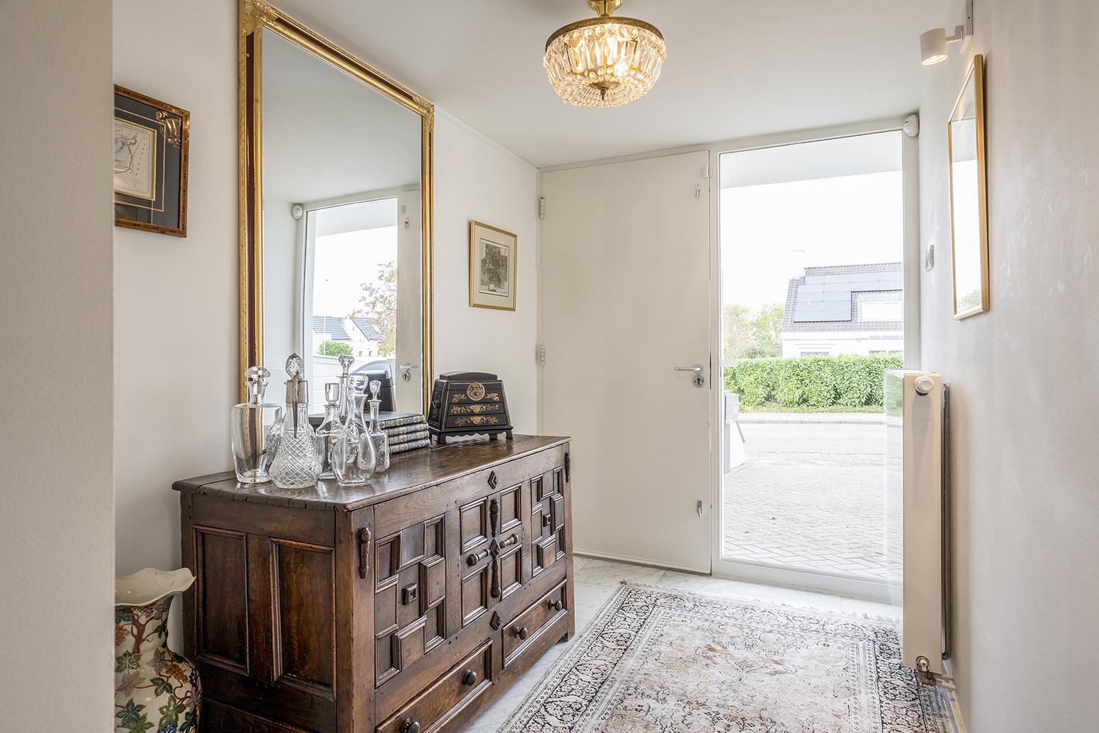 Vanaf de oprit loopt u naar de entree van waaruit de ruime ontvangsthal met marmeren vloer te bereiken is. Aan de rechterzijde is de open, witte trap naar de woon- en slaapverdieping. De verwarmde voormalige garage met tegelvloer is in gebruik als hobbyruimte. De toiletruimte is, net als de doucheruimte, grotendeels in marmer uitgevoerd.