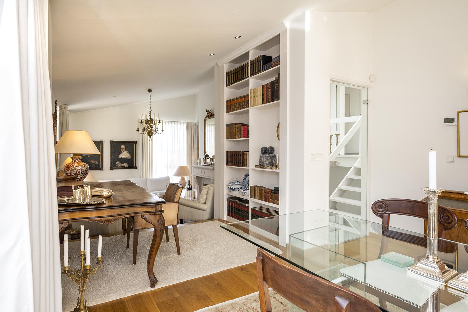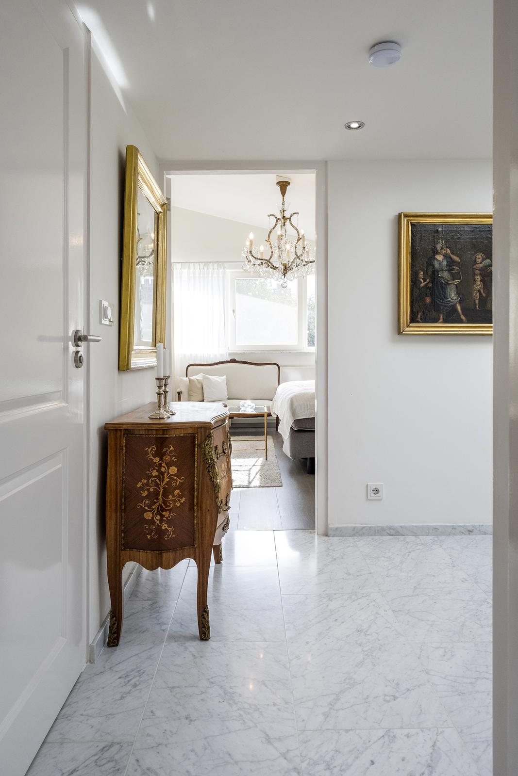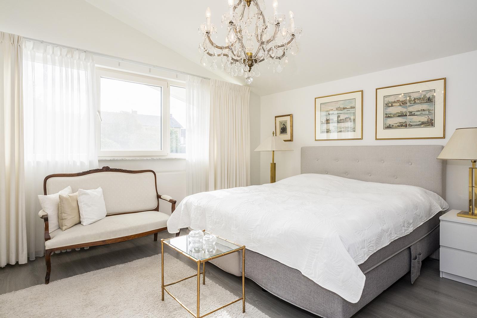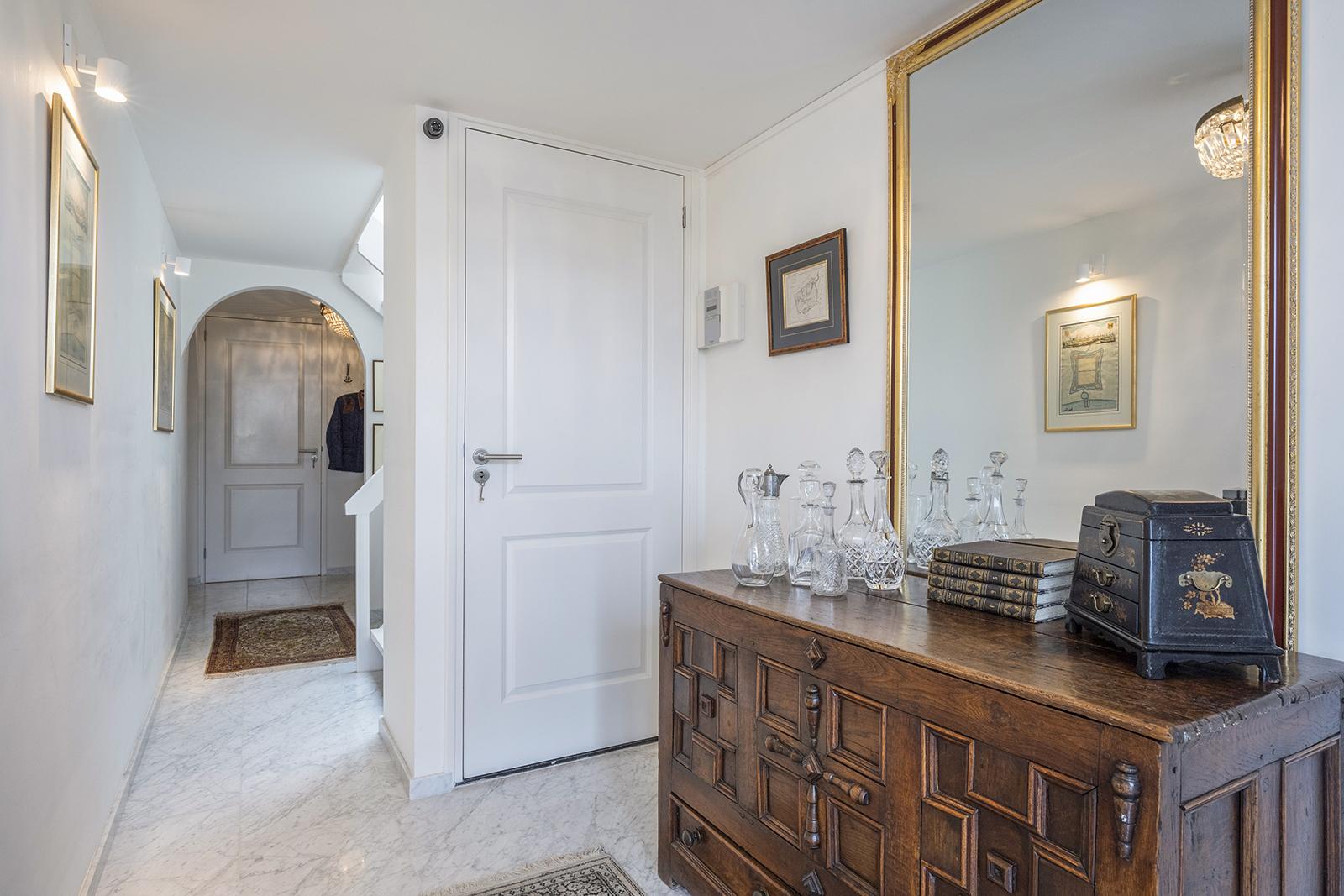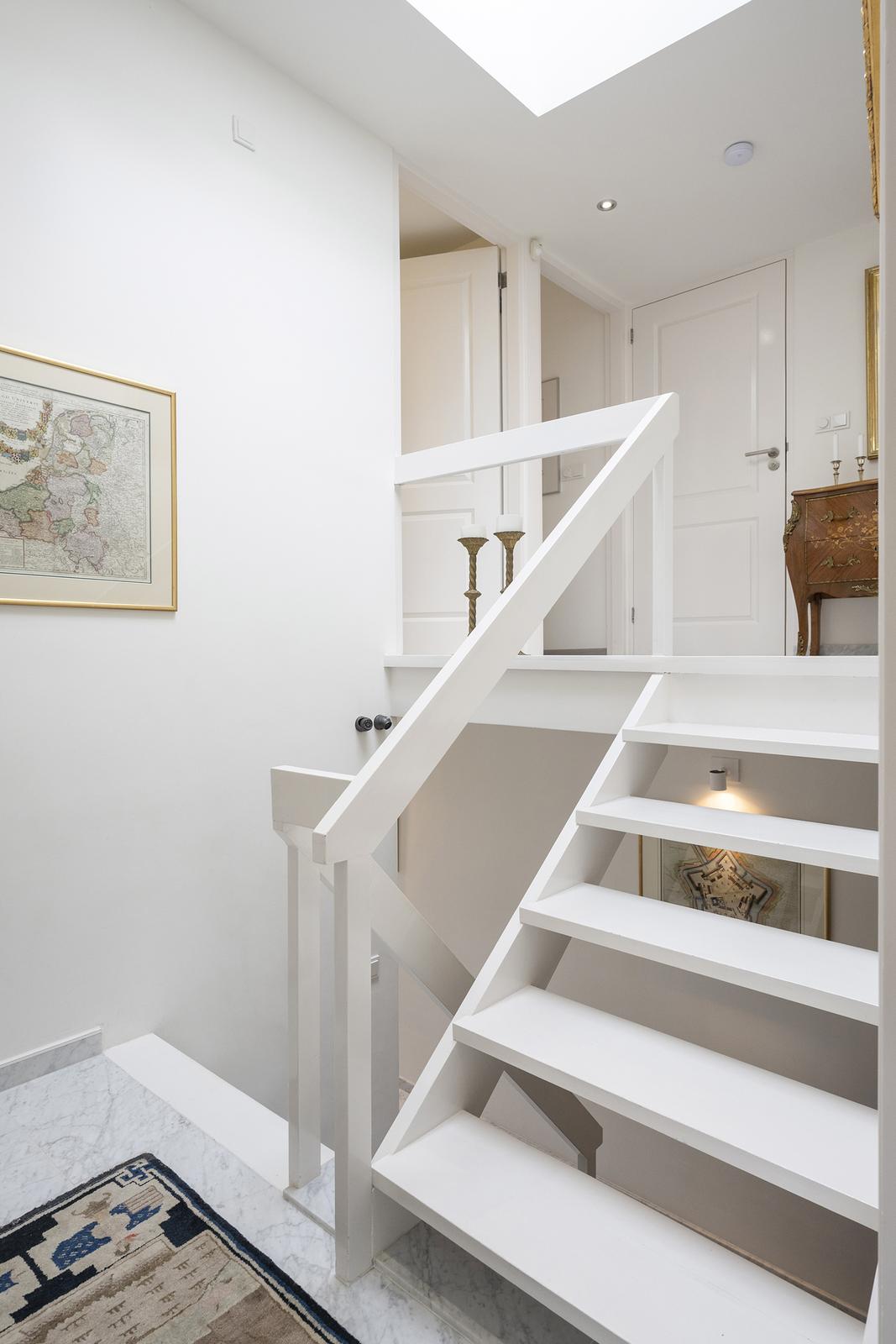 Terug in de hal volgt u de trap naar de bovenste etage. Een groot dakraam zorgt voor prettig lichtinval in het trappenhuis. Vanaf de grote overloop met marmeren vloer zijn twee slaapkamers, de badkamer en een toiletruimte te bereiken.