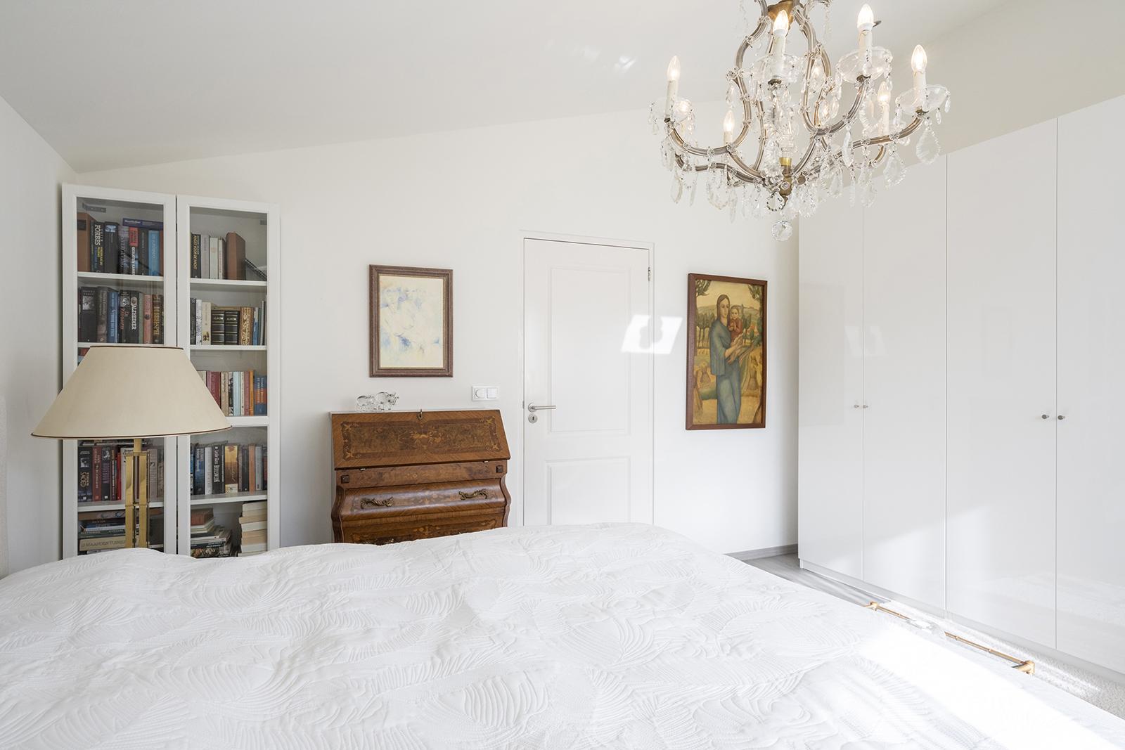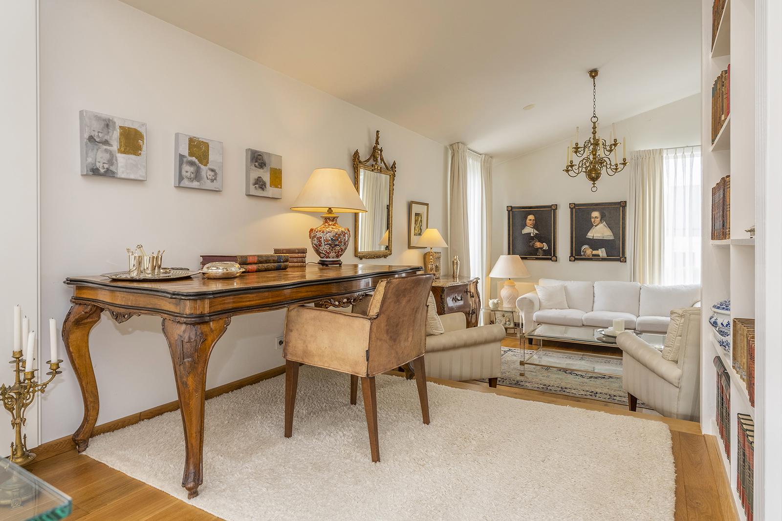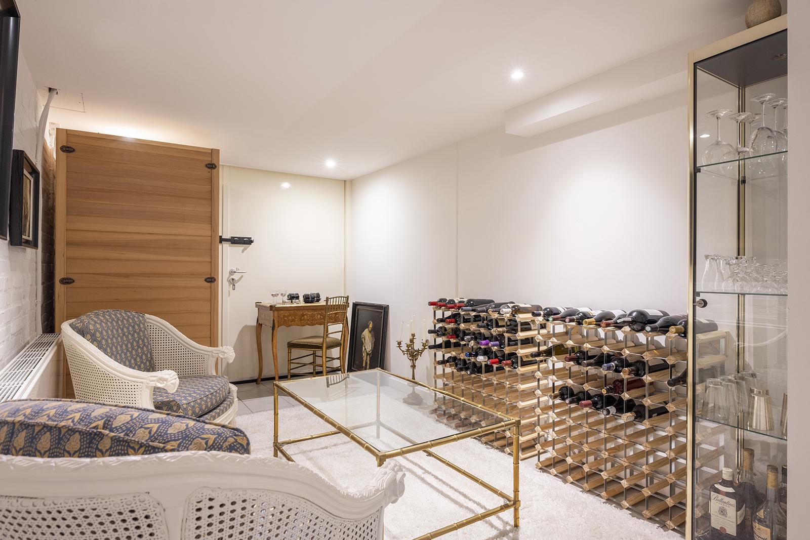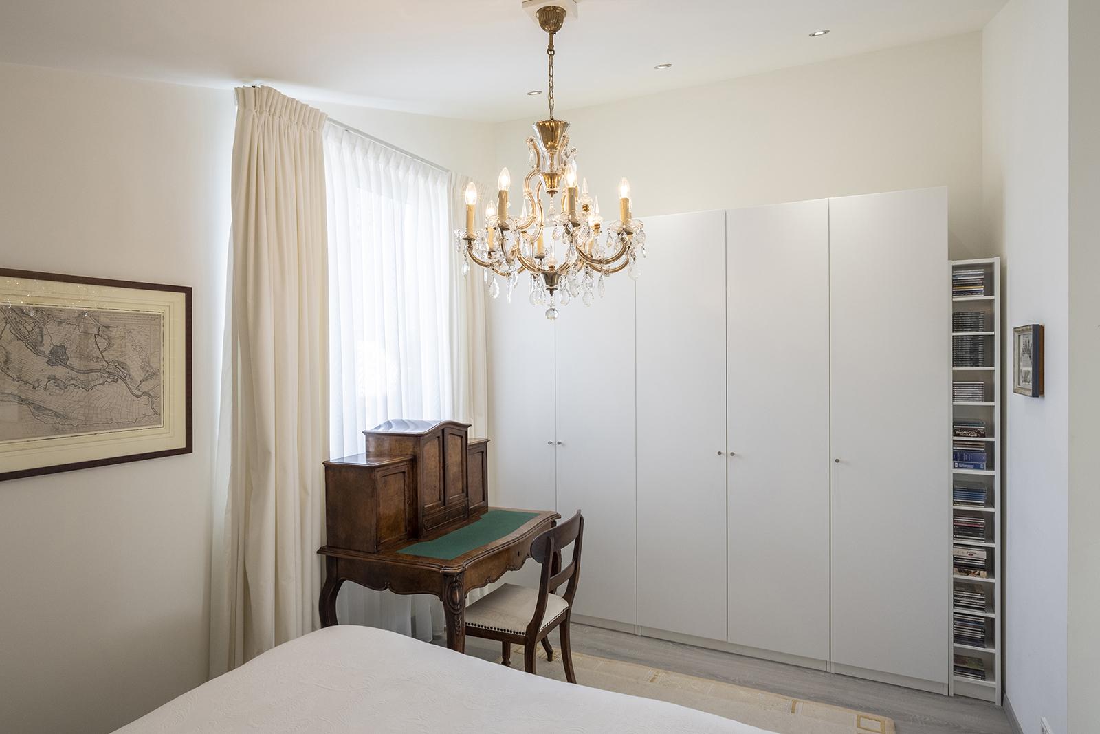 Aan de achterzijde zijn de bijkeuken en een slaap-/werkkamer. Beide ruimtes zijn voorzien van een marmeren vloer en vanuit de bijkeuken kunt u met een trap de tuin bereiken. Dankzij de ligging naast de doucheruimte en een toiletruimte is het een overweging om de voormalige garage te verbouwen tot slaapkamer.