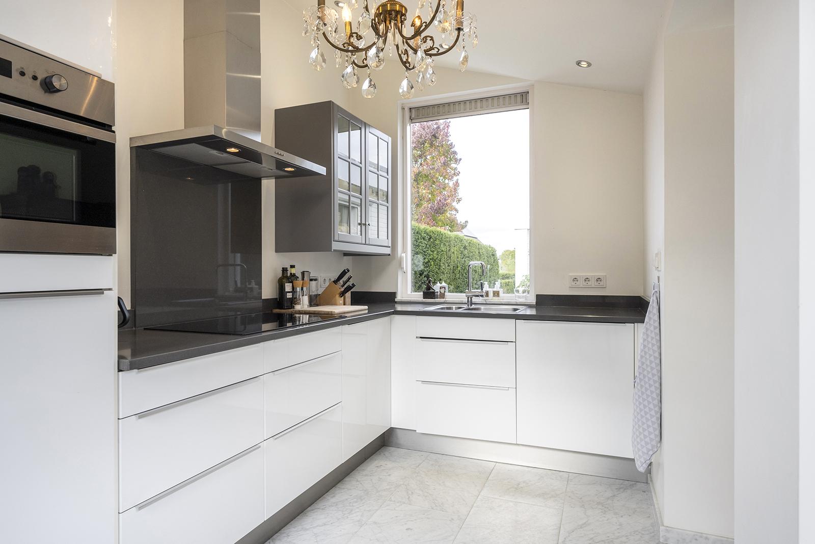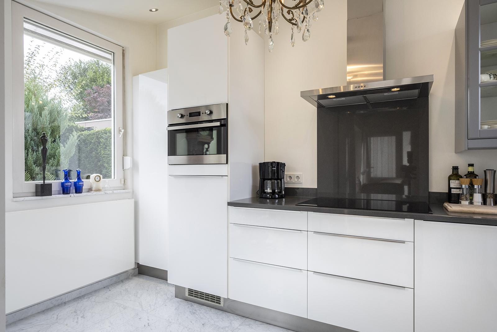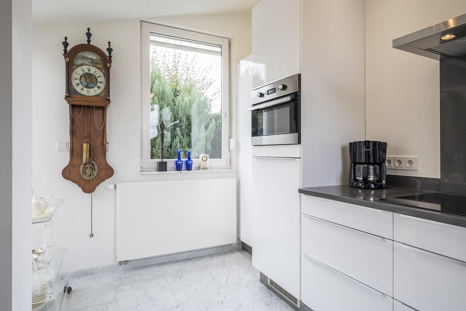 In de hoek van de woonkamer is een doorgang naar de lichte, moderne keuken. De marmeren vloer past goed bij de hoekopstelling met granieten blad en granieten achterwand, die beiden een prachtige kleurstelling hebben. Alle benodigde apparatuur is ingebouwd: een inductie kookplaat, afzuigkap, koelkast, vaatwasser en een combi-magnetron.