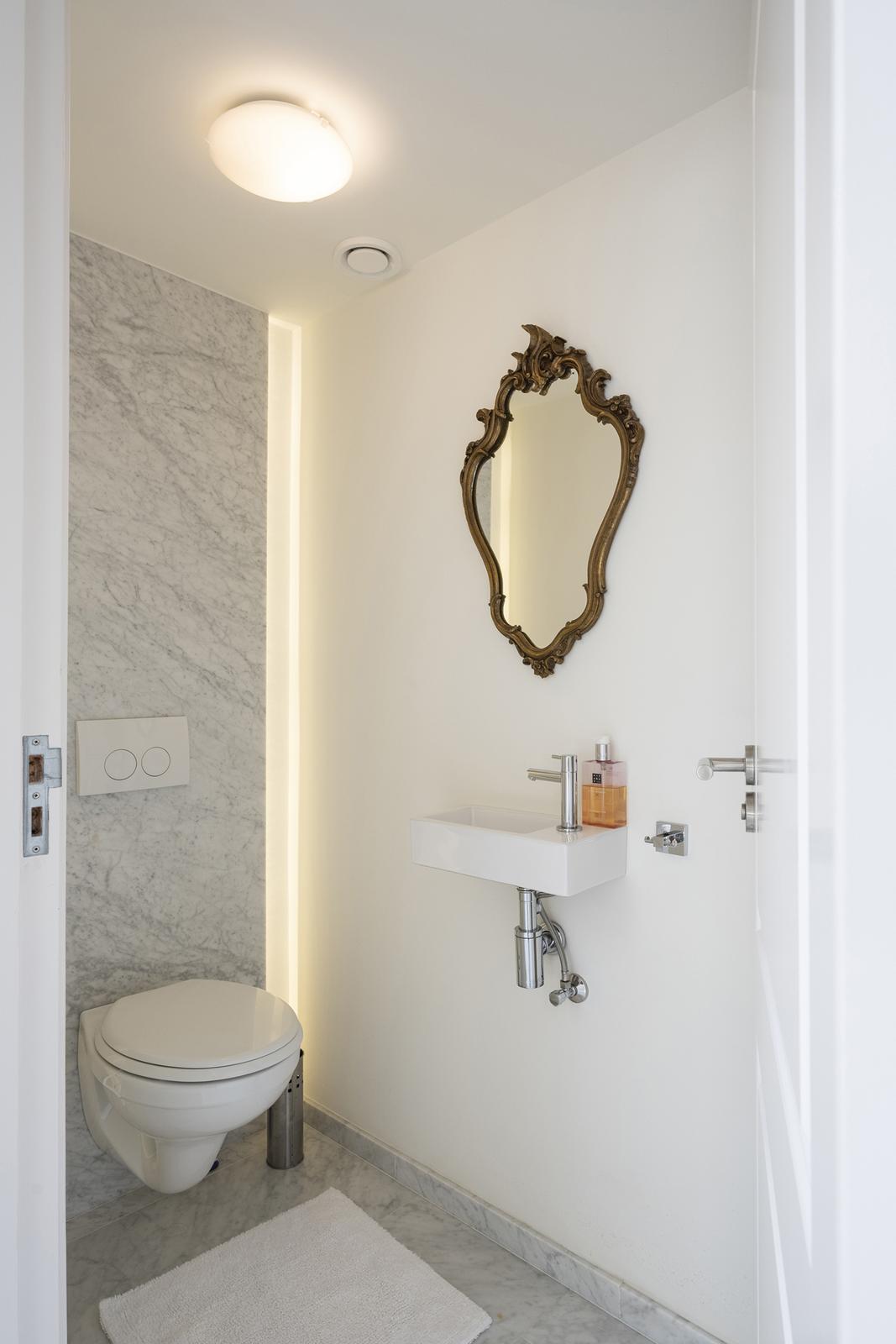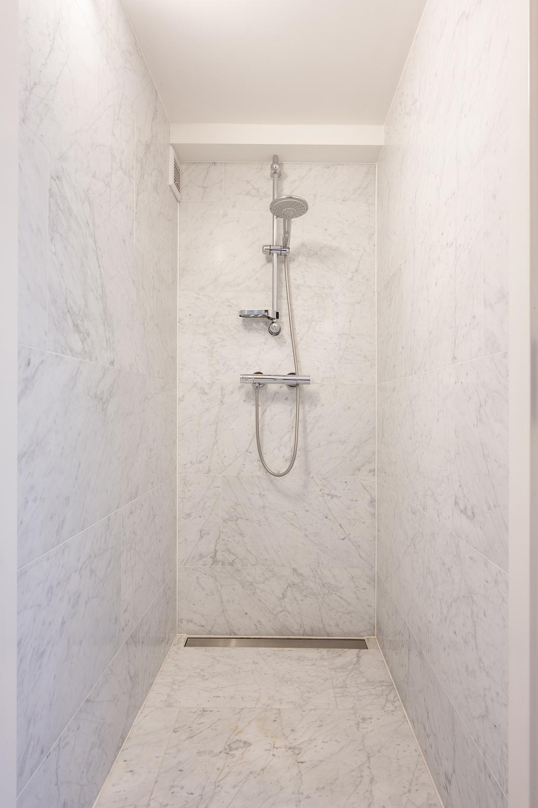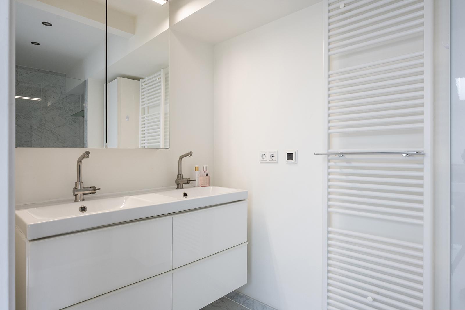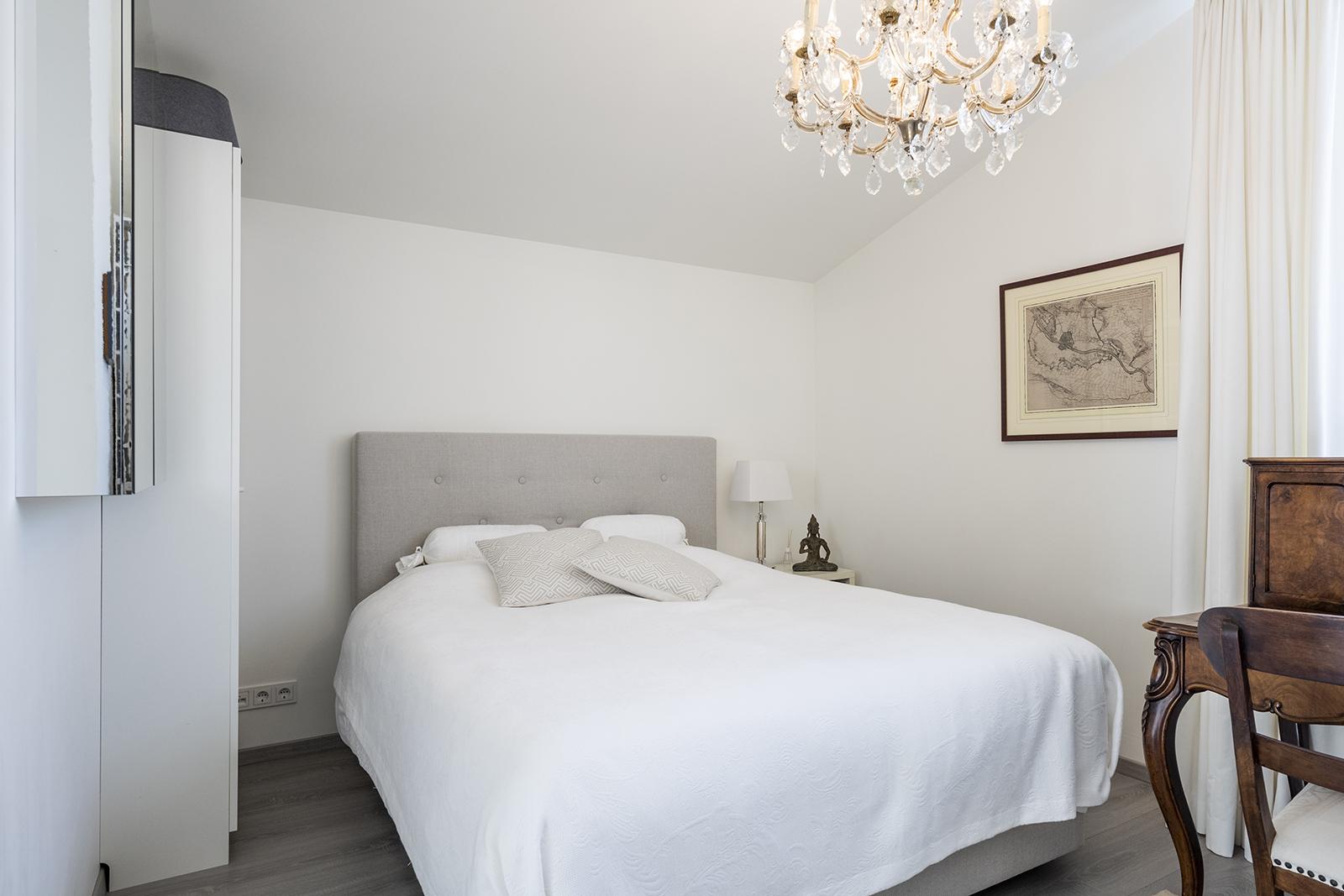 Beide slaapkamers hebben een schuin dak, laminaatvloer en genoeg ruimte om in te delen als tweepersoons slaapkamer. In de stijlvolle badkamer is, net als in de rest van de woning, veel gebruikgemaakt van marmer. De ruimte is ingedeeld met een grote douche, designradiator en een dubbel wastafelmeubel. Vloerverwarming zorgt voor een aangename temperatuur en in het plafond zijn inbouwverlichting en mechanische ventilatie aangebracht. Aan de andere zijde van de overloop is de toiletruimte met fonteintje.