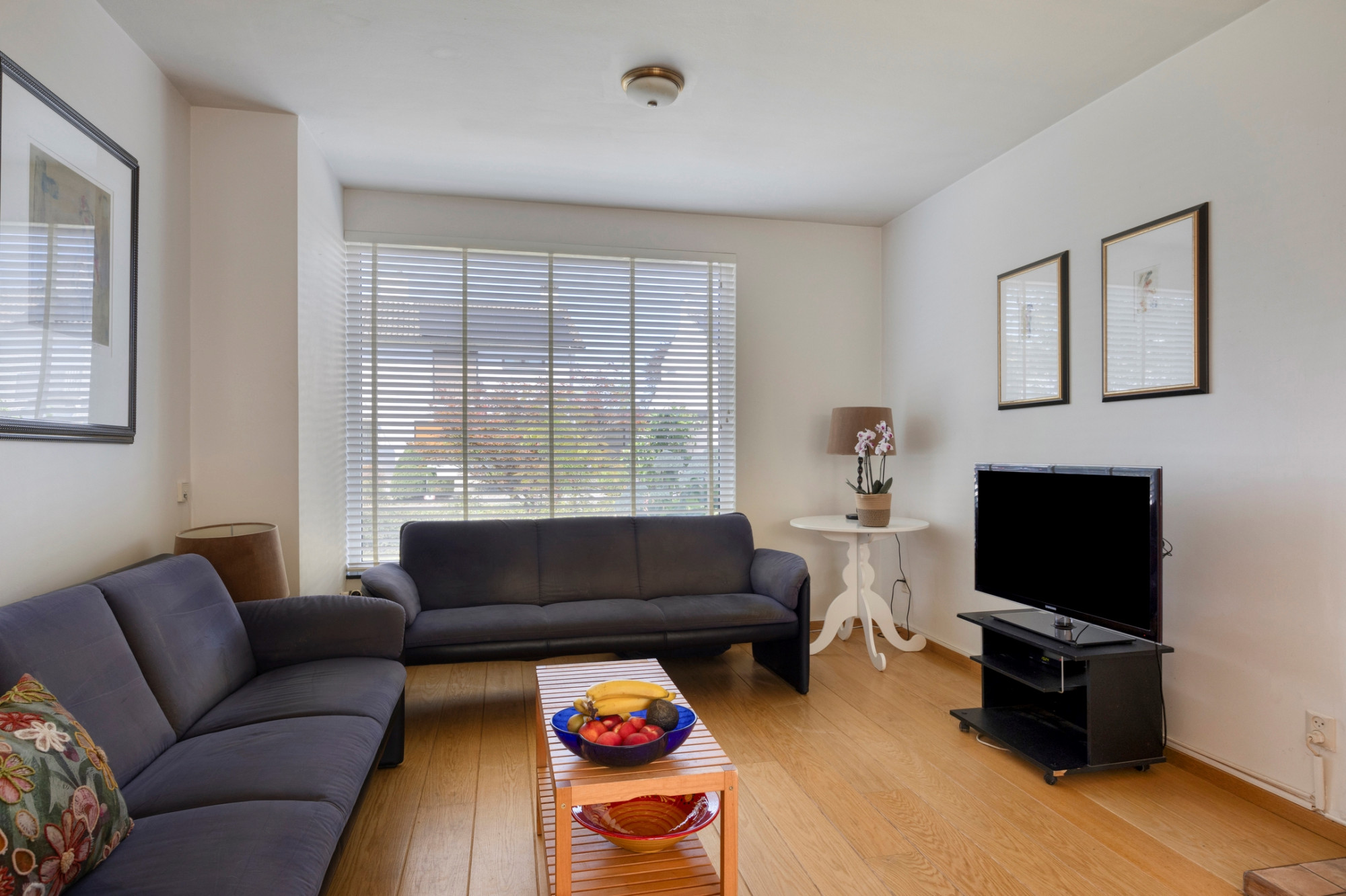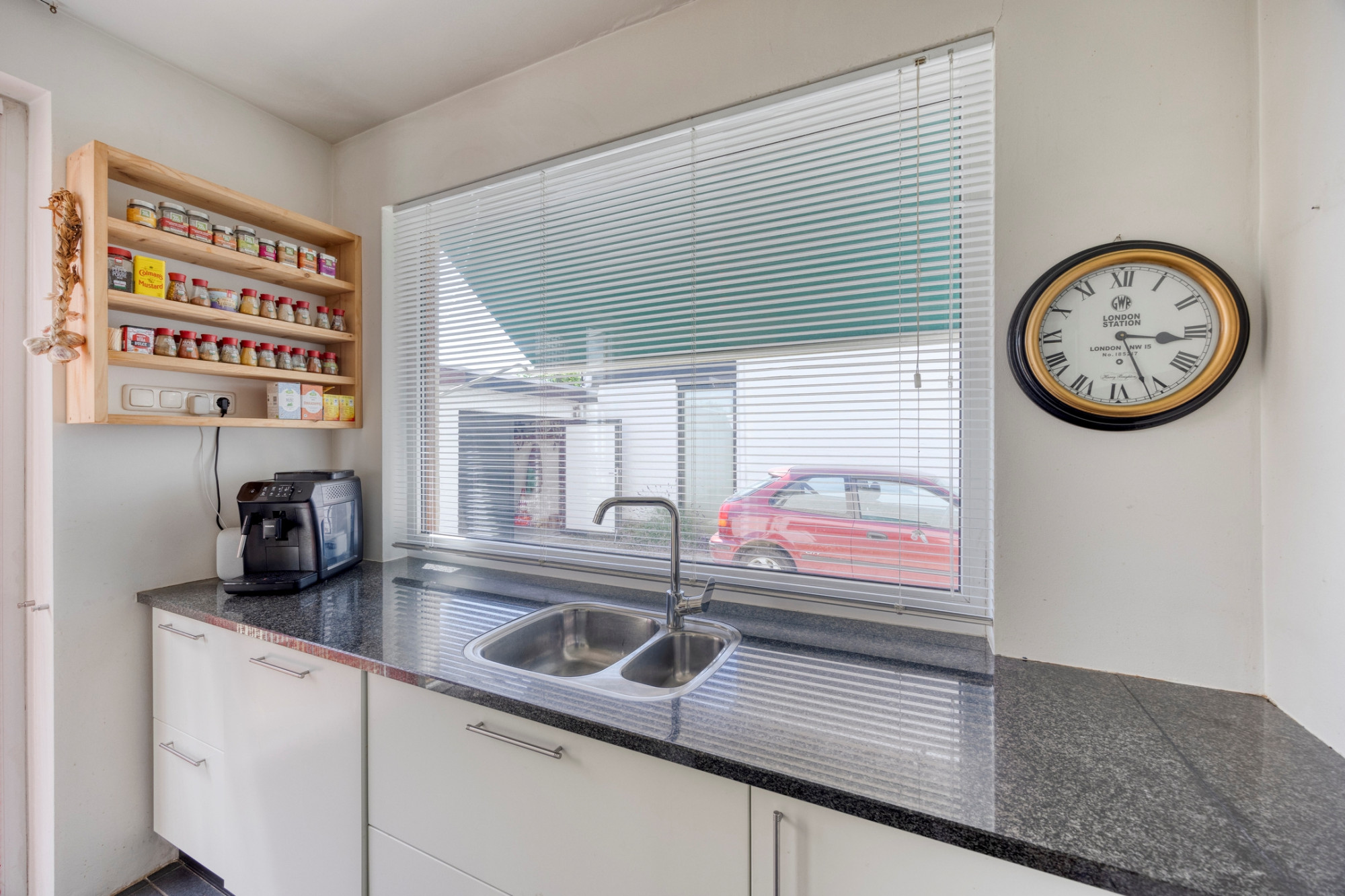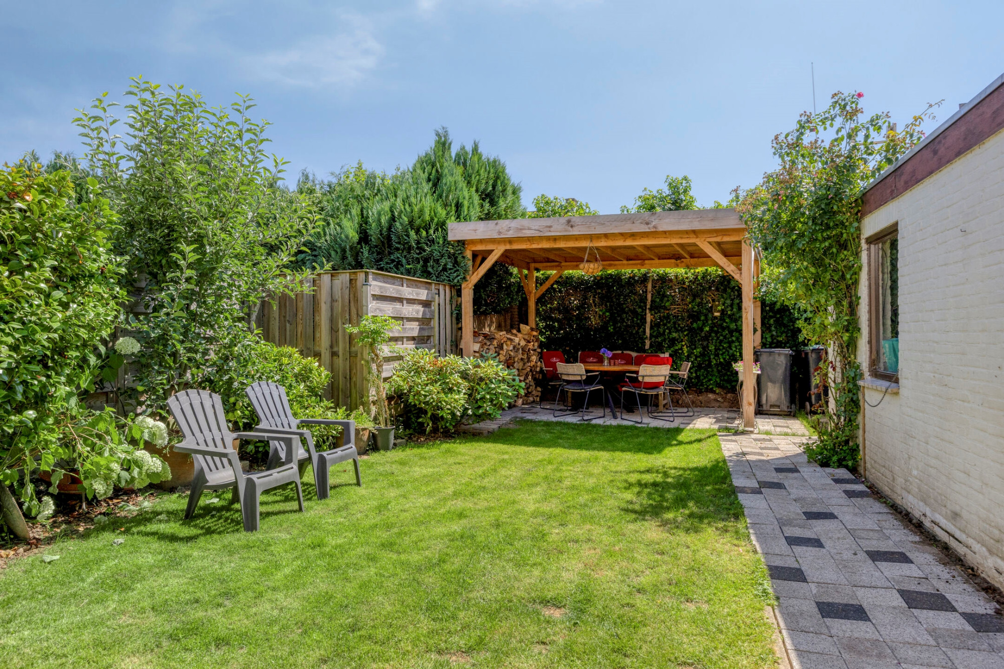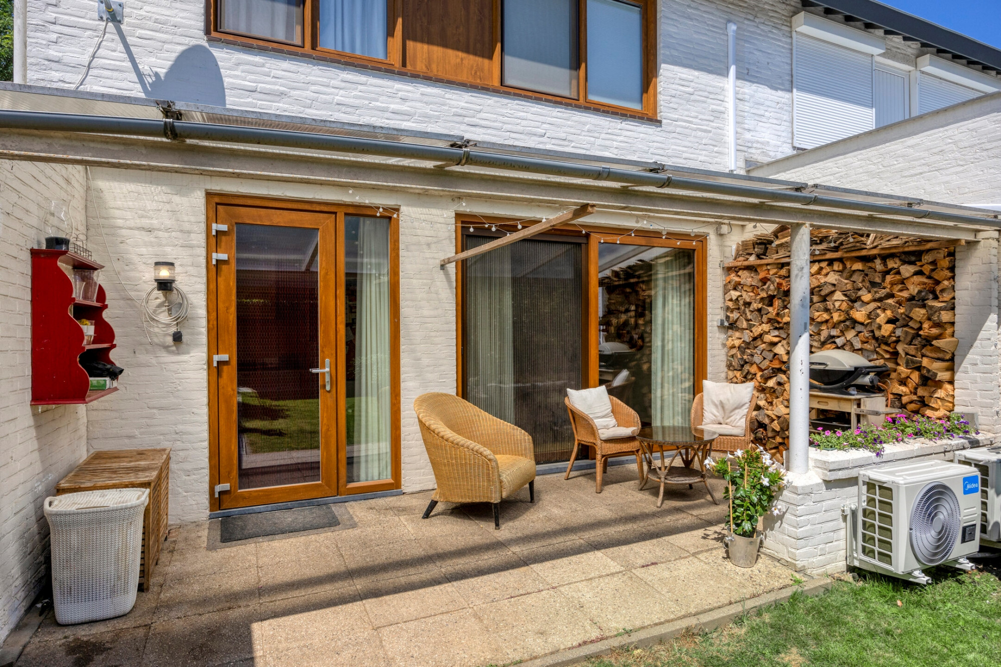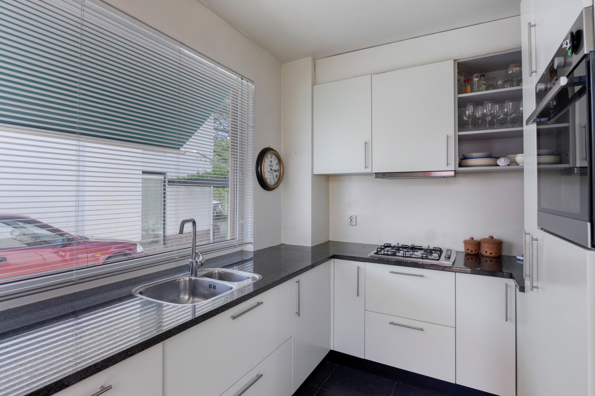 Begane grond: entree met tegelvloer; toilet met fonteintje; moderne meterkast; woonkamer (29m2) voorzien van gashaard, parketvloer en schuifpui naar overdekt terras; keuken in hoekopstelling met granieten aanrechtblad, 4-pits gasfornuis, afzuigkap, koelkast, oven, apothekerskasten en vaatwasser. Via het overdekt terras bereikt men de garage en de tuin.