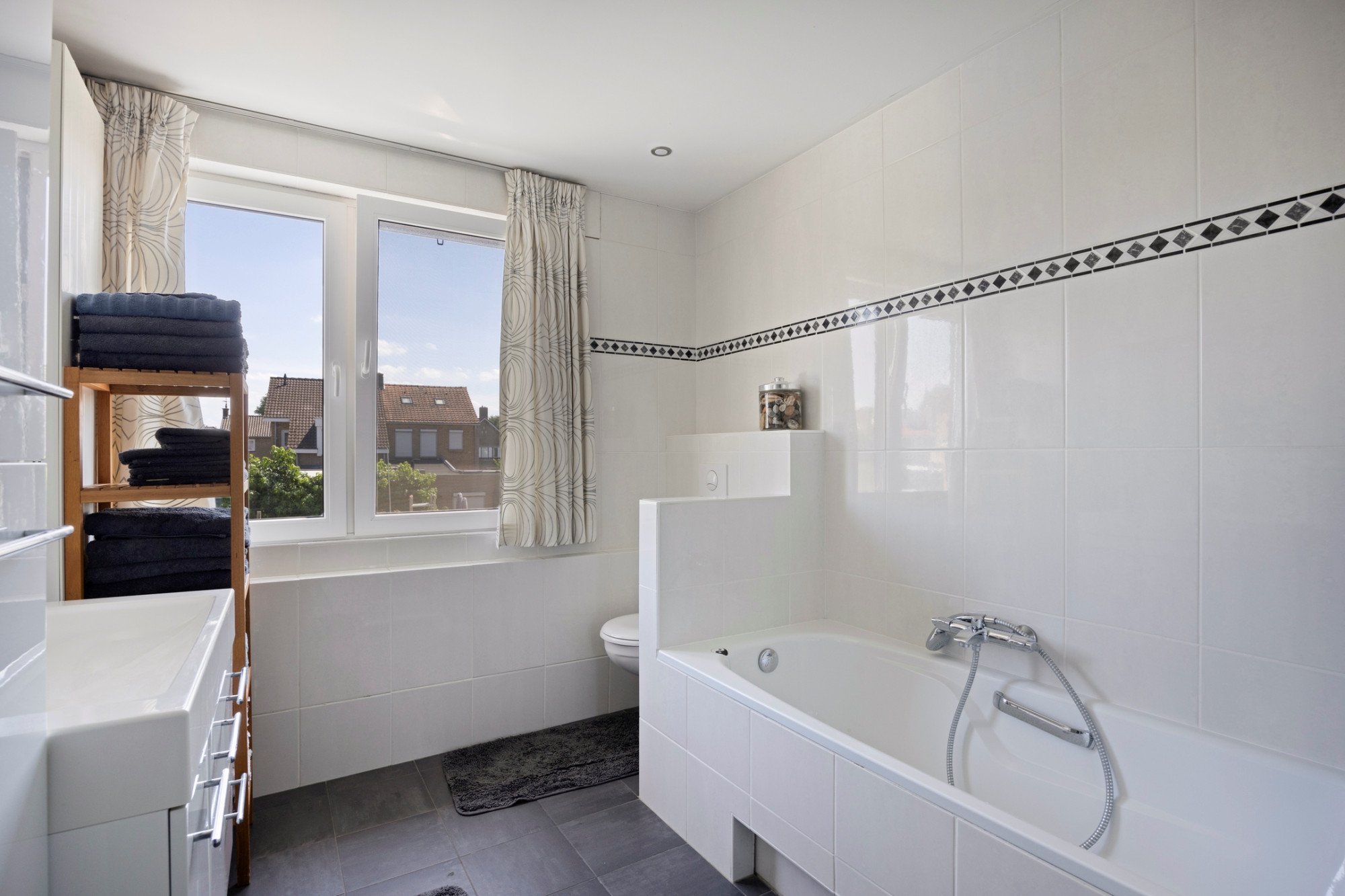 Verdieping: overloop naar 3 slaapkamers (resp.: 13, 11 en 4,5m2); luxe badkamer (8m2) uitgerust met ligbad, douche, 2e toilet, wastafel, inbouwspots en designradiator; wasruimte (3m2) met aansluiting voor de wasmachine en droger.