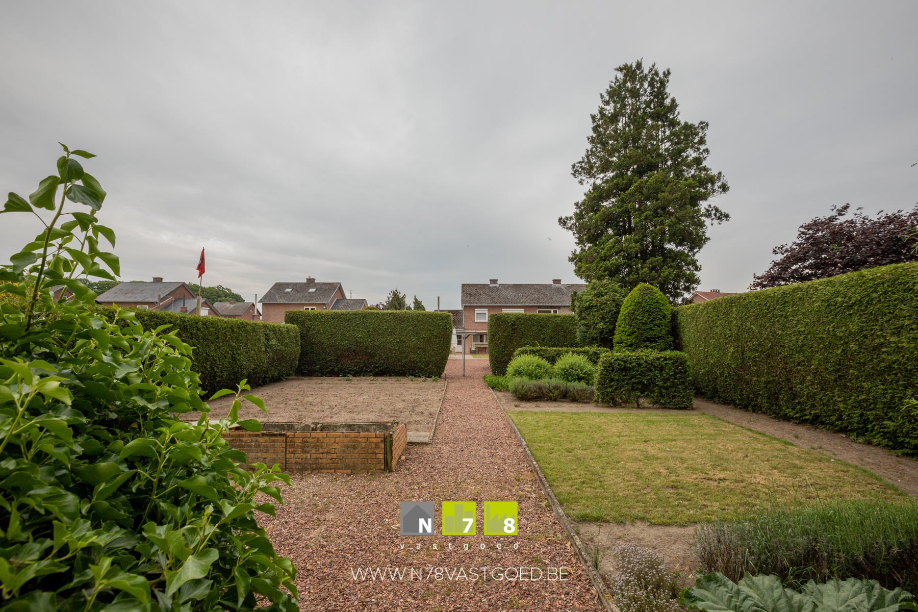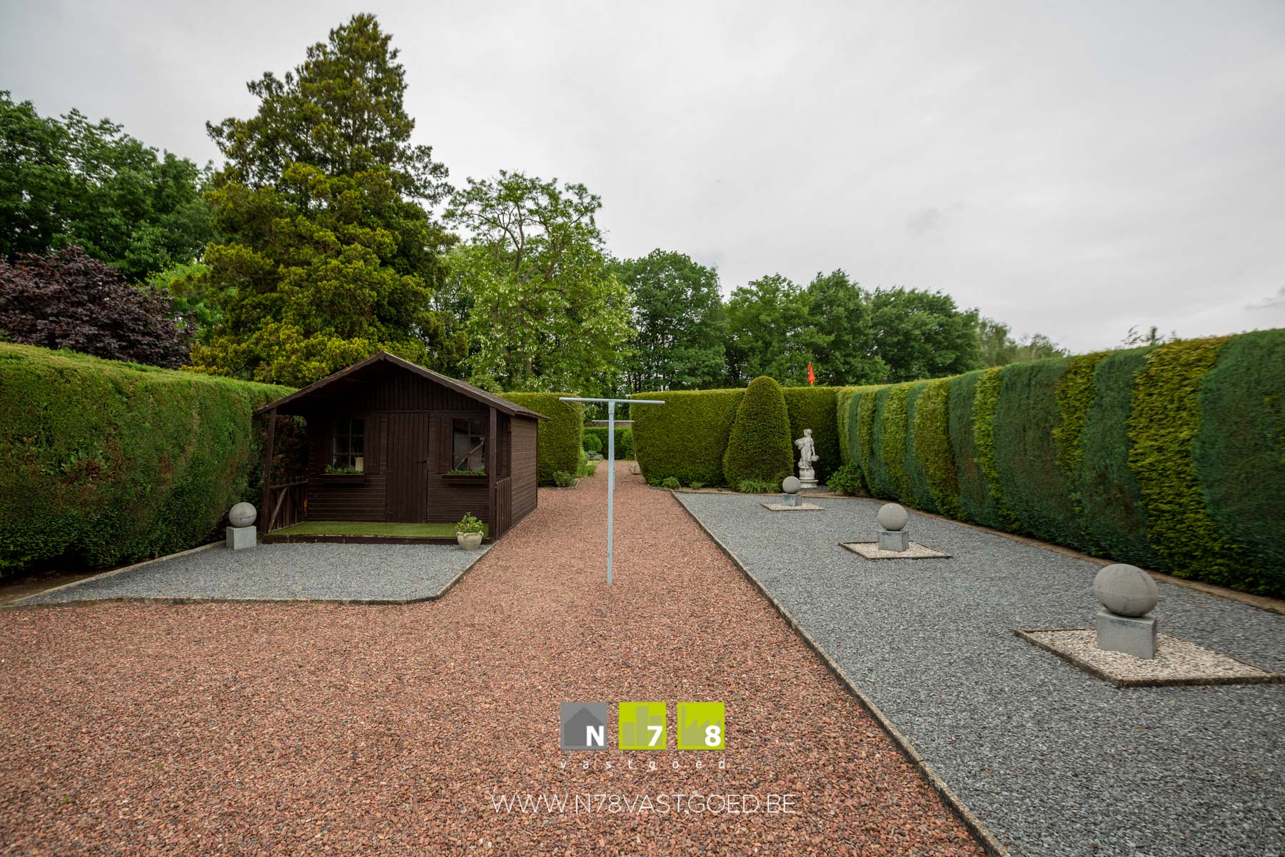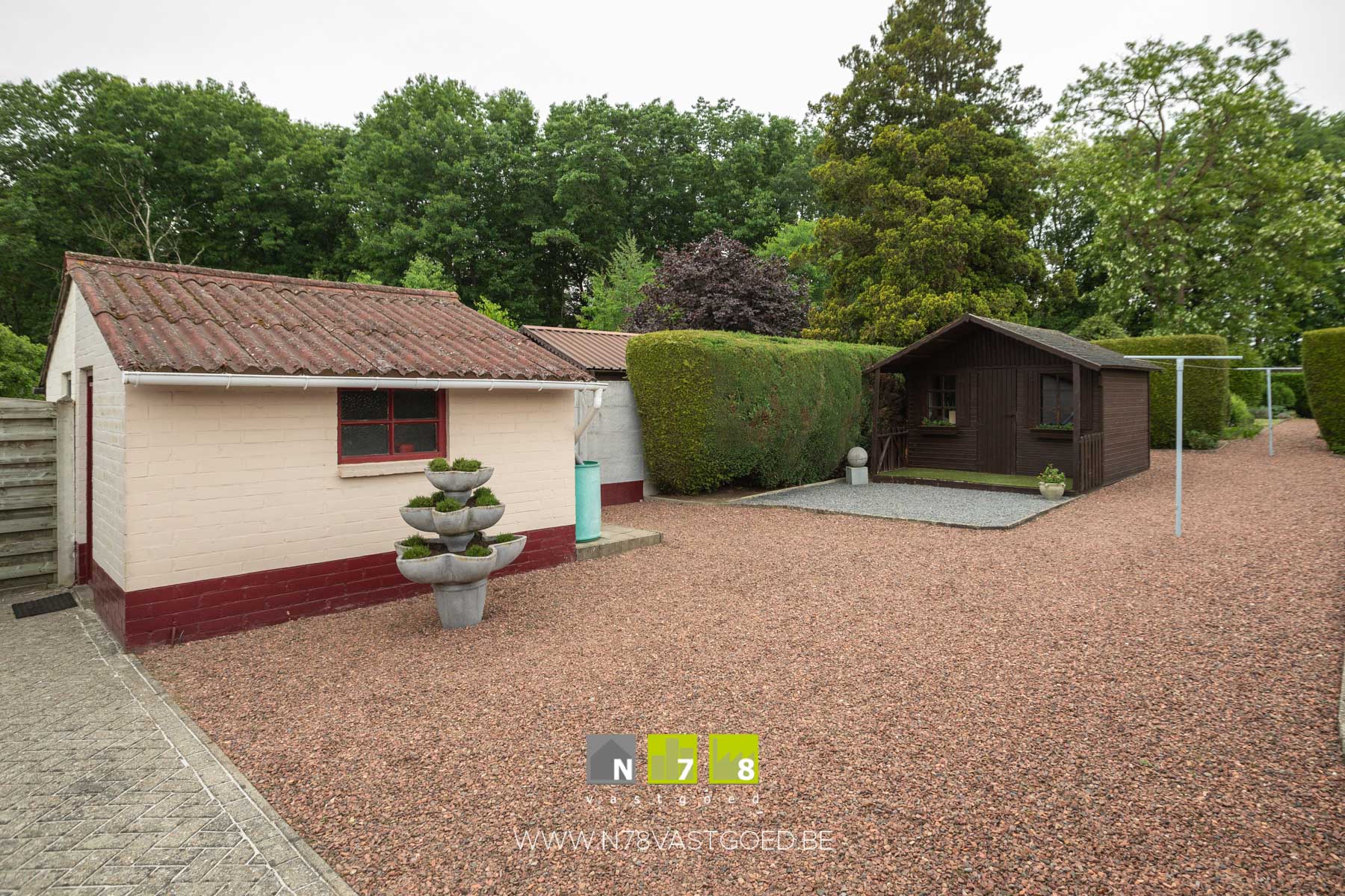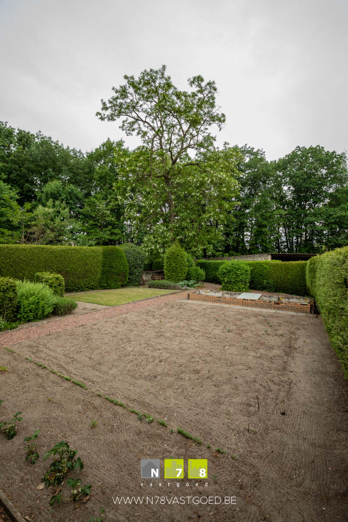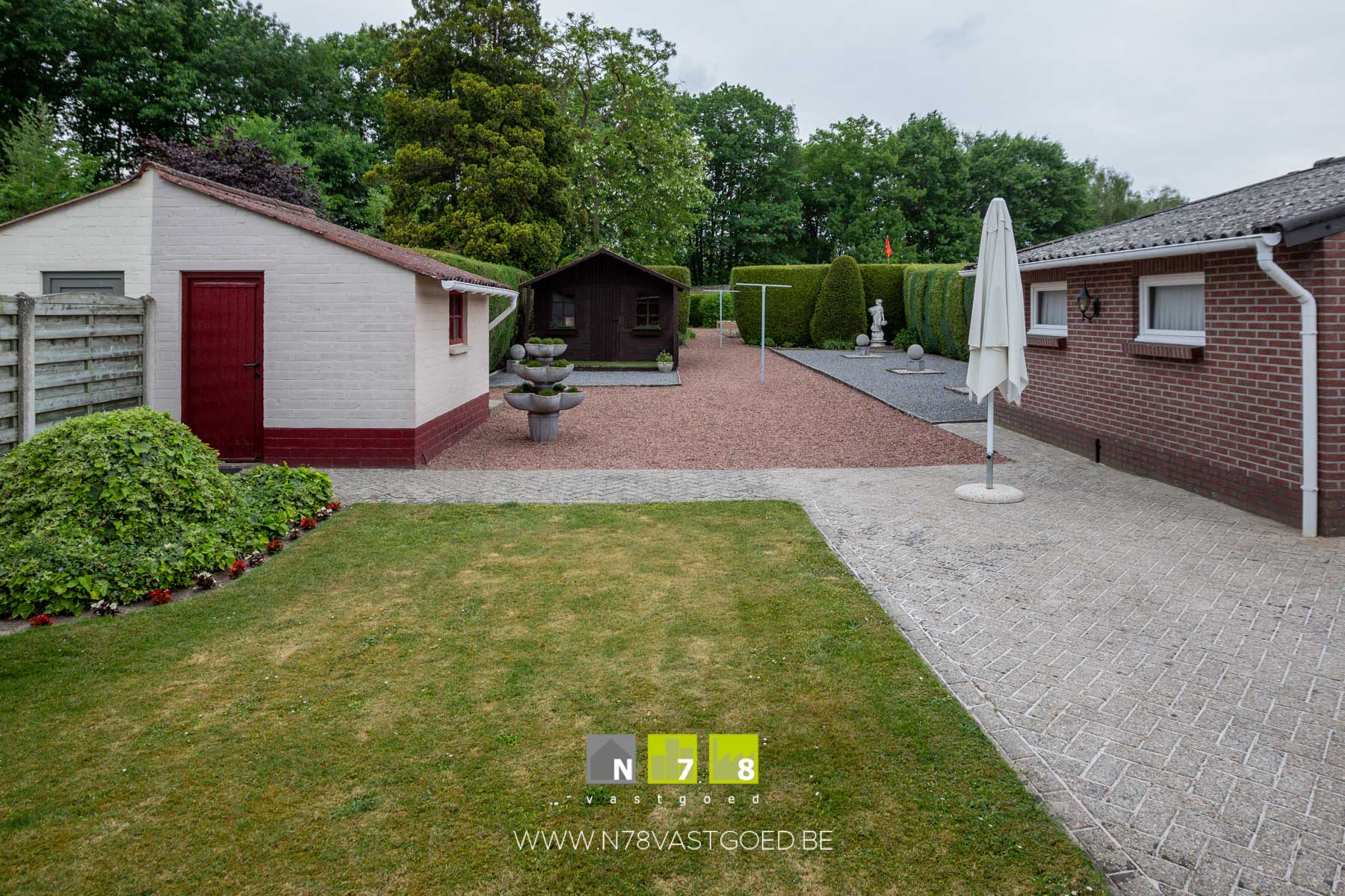 - Tuin: gedeeltelijk gazon, moestuin, wandelpaden in kiezelstenen, gedeeltelijk bekiezeld.