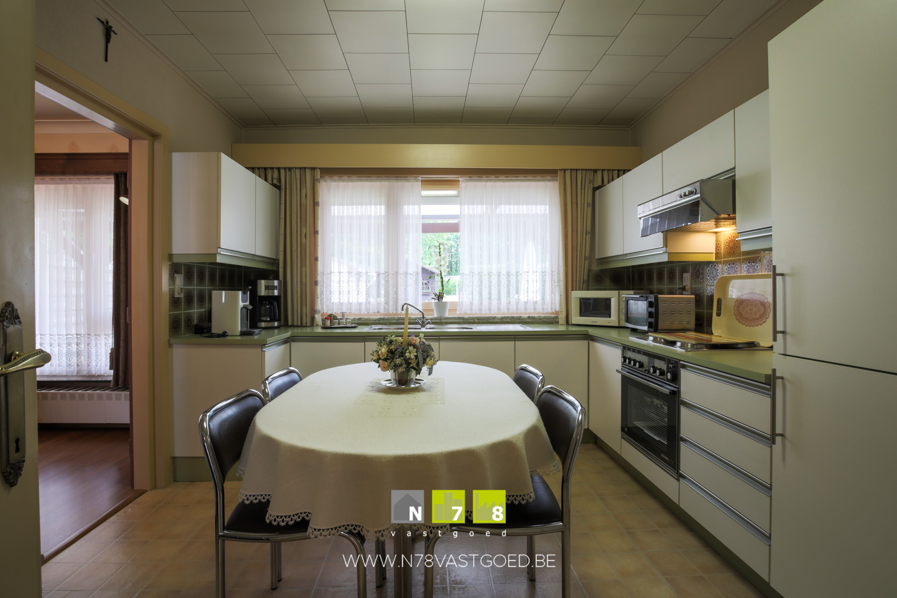 - Keuken (3,80m x 3,30m = 12,54m²): onder- en bovenkasten, dubbele spoelbak, oven, elektrisch fornuis, dampkap, koelkast met diepvries, novilonvloer.