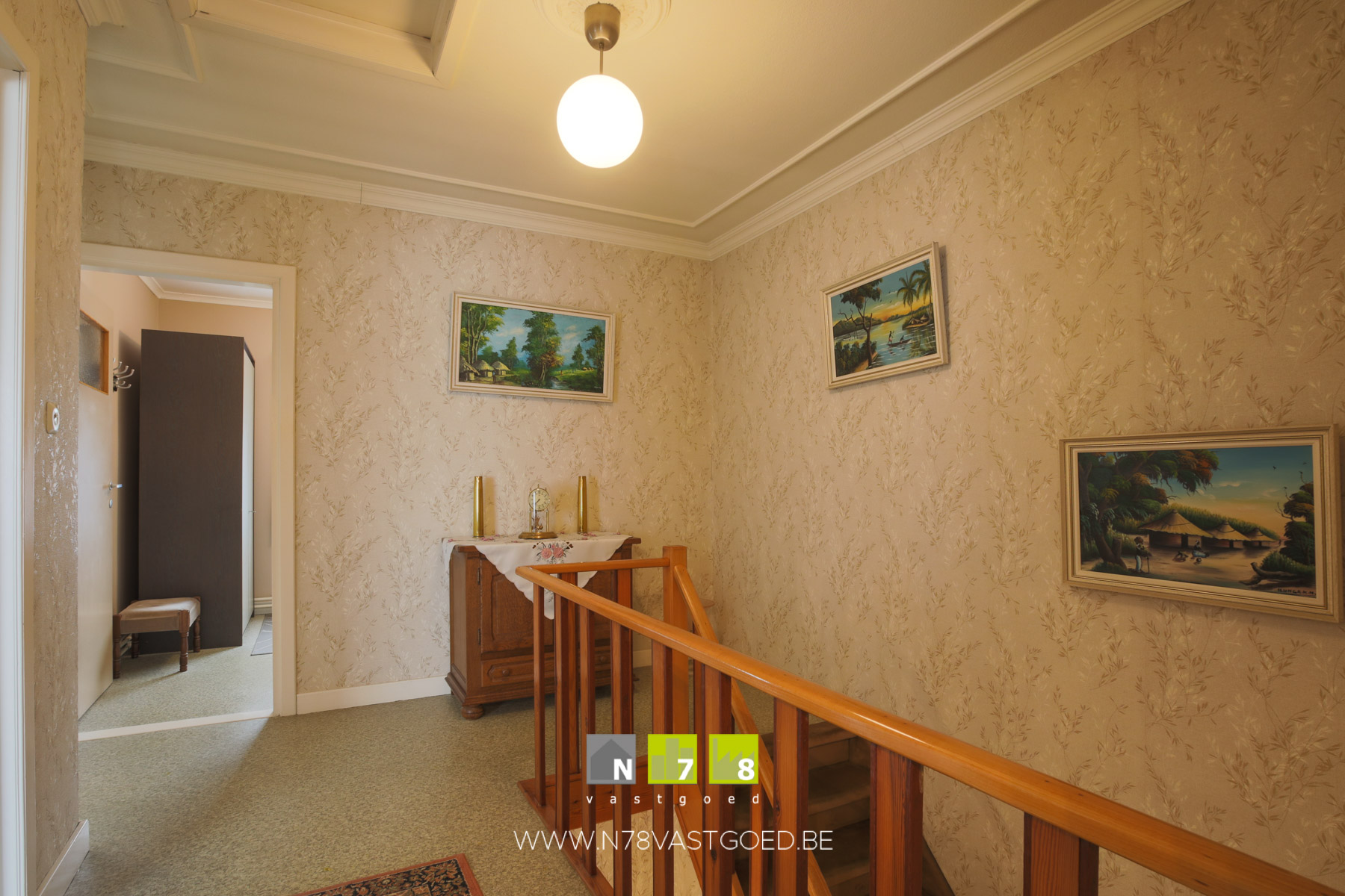- Overloop (3,60m x 1,30m = 4,68m²): luik naar zolder, novilon.