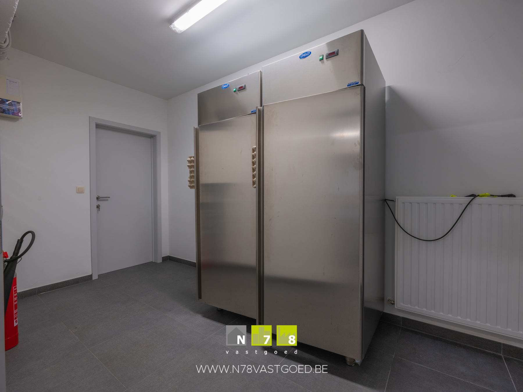 - Horecakeuken (INOX)(5,80m x 3,50m = 20,30m²): ingericht met spoeltafel, professionele vaatwasser, oven, kookplaat, friteuses, dampkap, tegelvloer.