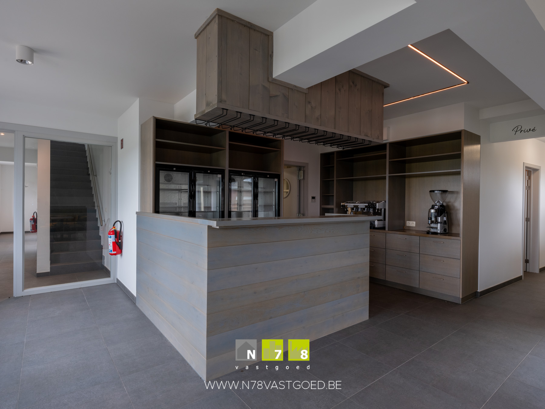 - Verbruikszaal / mogelijke leefruimte ((1,30m x 2,20m) + (9,10m x 6,00m) = 57,46m²): momenteel ingericht met bar, frigo's, inbouwkasten, veel lichtinval, schuifpui naar terras, tegelvloer.
