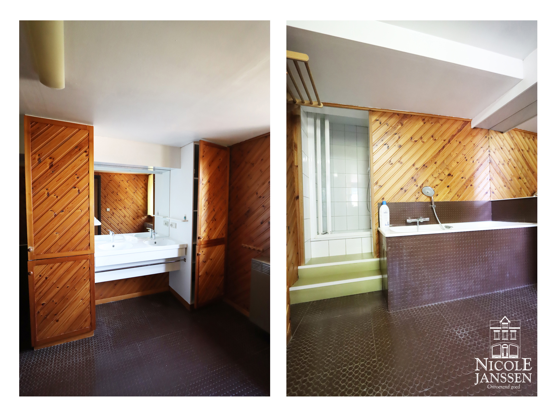 - Badkamer met douche, ligbad en twee wastafels in meubel