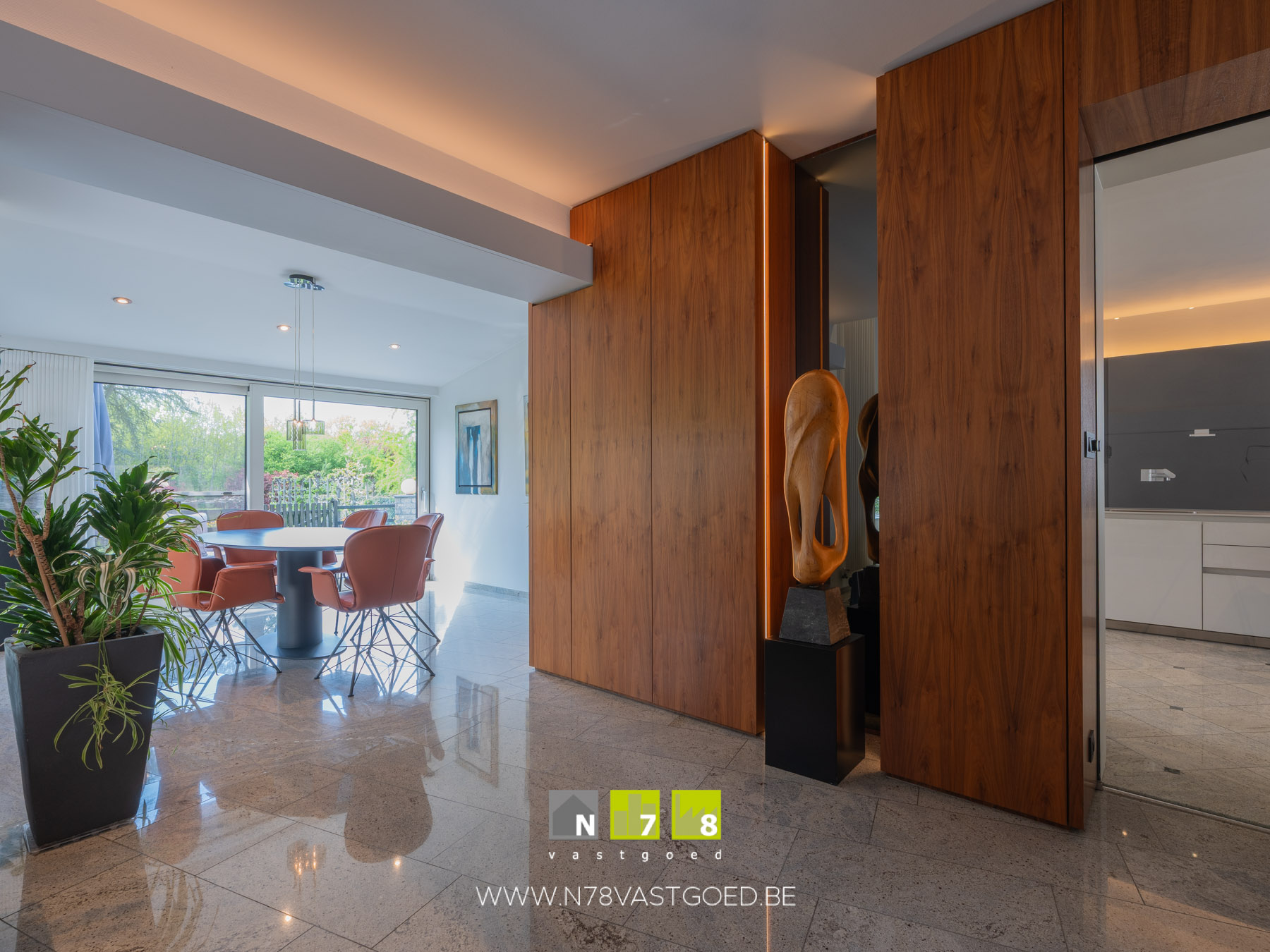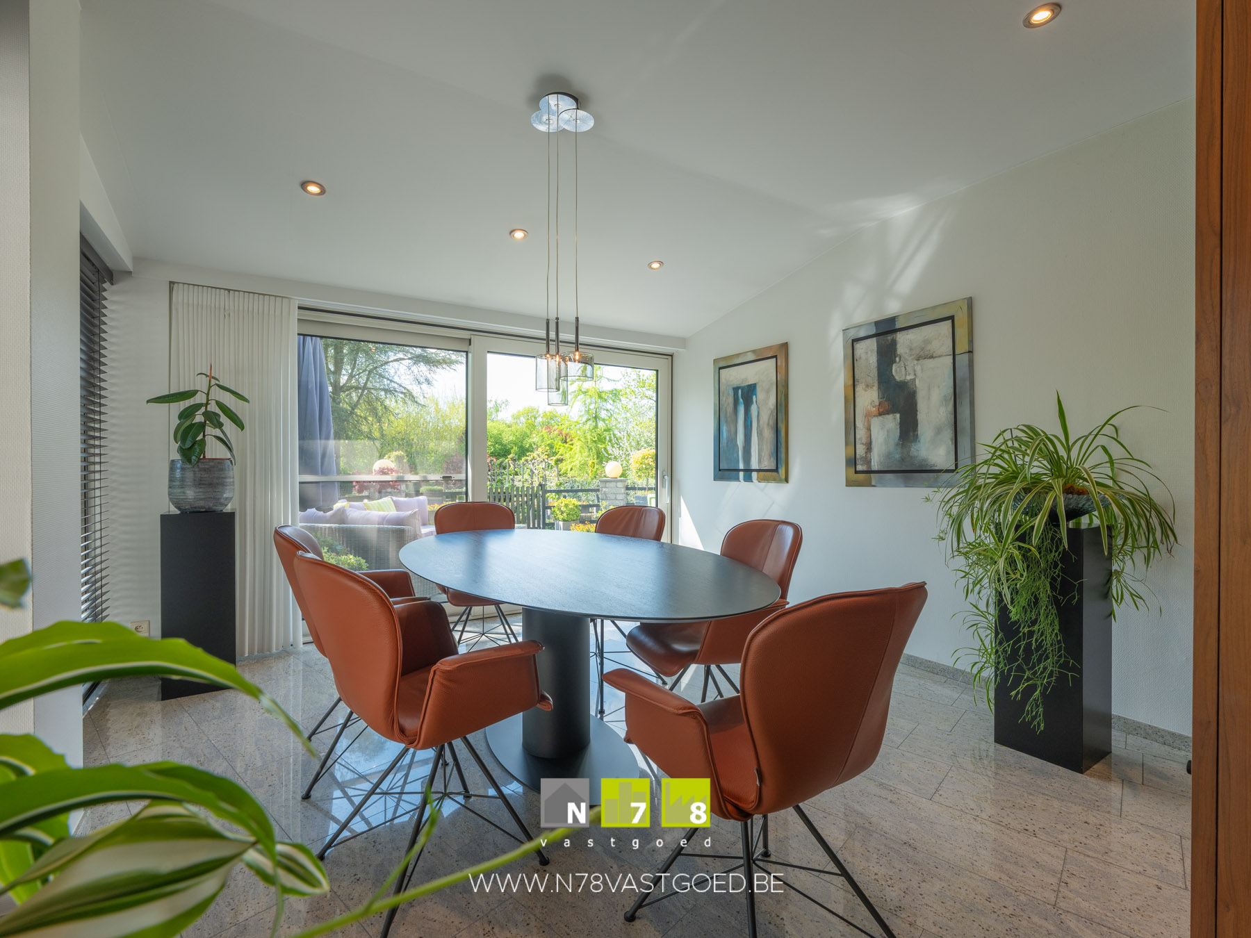 - Eetkamer ((2,60m x 3,60m) + (3,88m x 3,54m) = 23,10m²): ingericht met maatkasten, schuifraam naar terras, veel lichtinval dankzij grote raampartijen, tegelvloer.