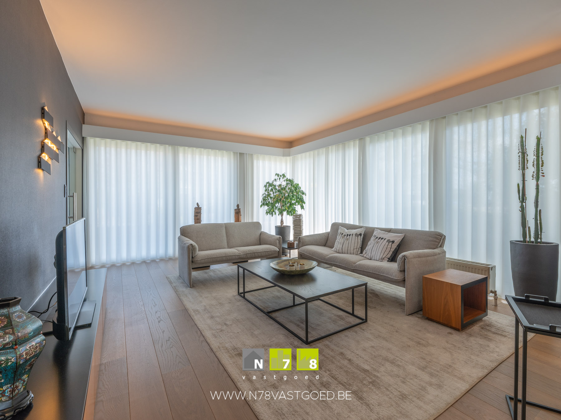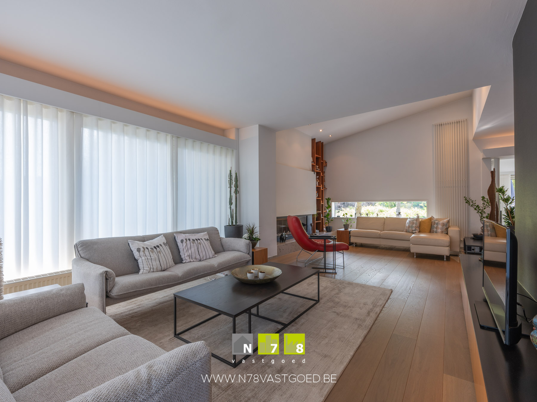 - Woonkamer (9,32m x 4,25m = 39,61m²): stijlvol ingericht met maatkasten, gashaard, veel lichtinval dankzij grote raampartijen, parket.