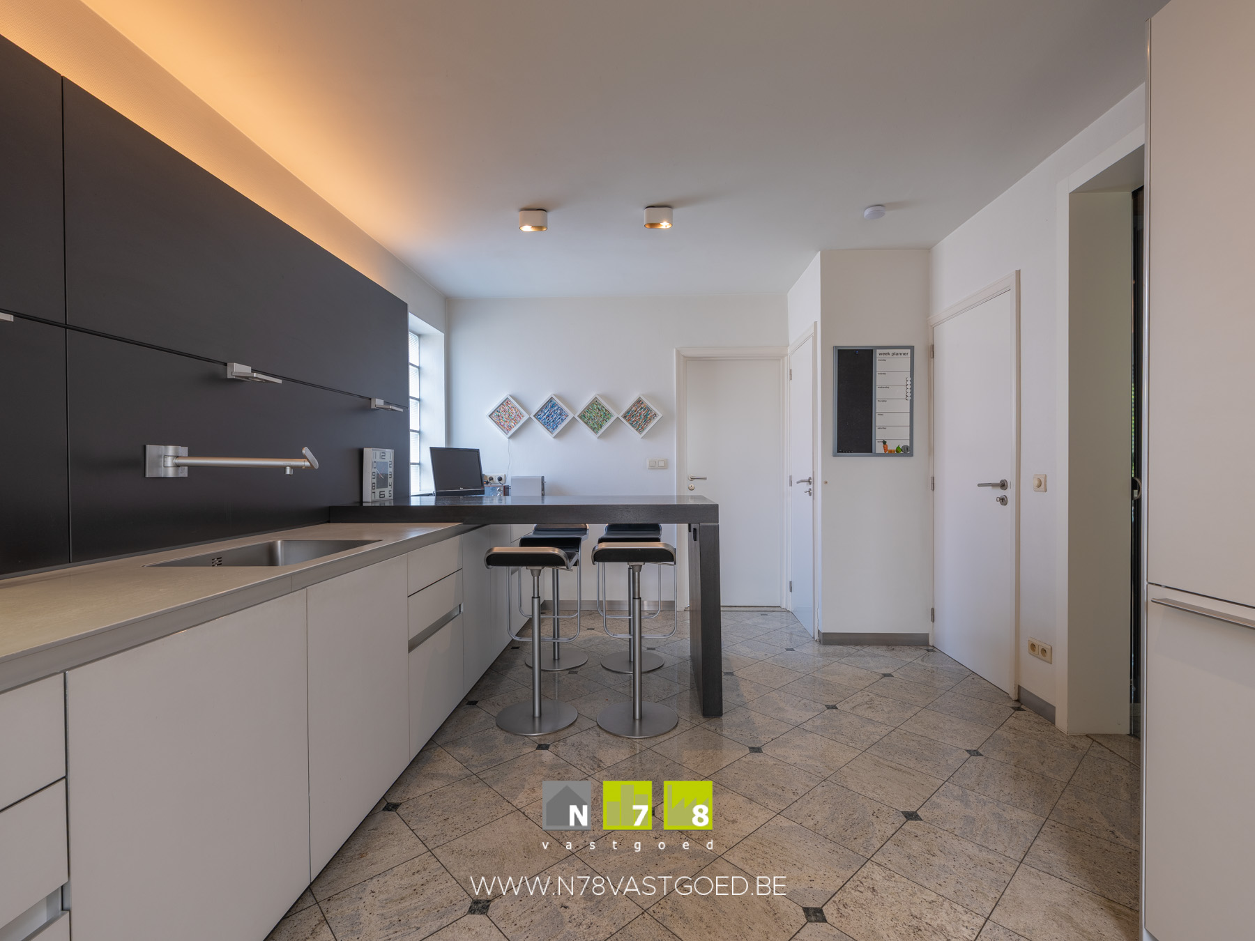 - Keuken (5,36m x 3,57m = 19,14m²): geïnstalleerd met onder-bovenkasten, lades, kolomkast, inductiekookplaat, dampkap, oven, combi-oven, koelkast, vaatwasser; ziteiland, tegelvloer.