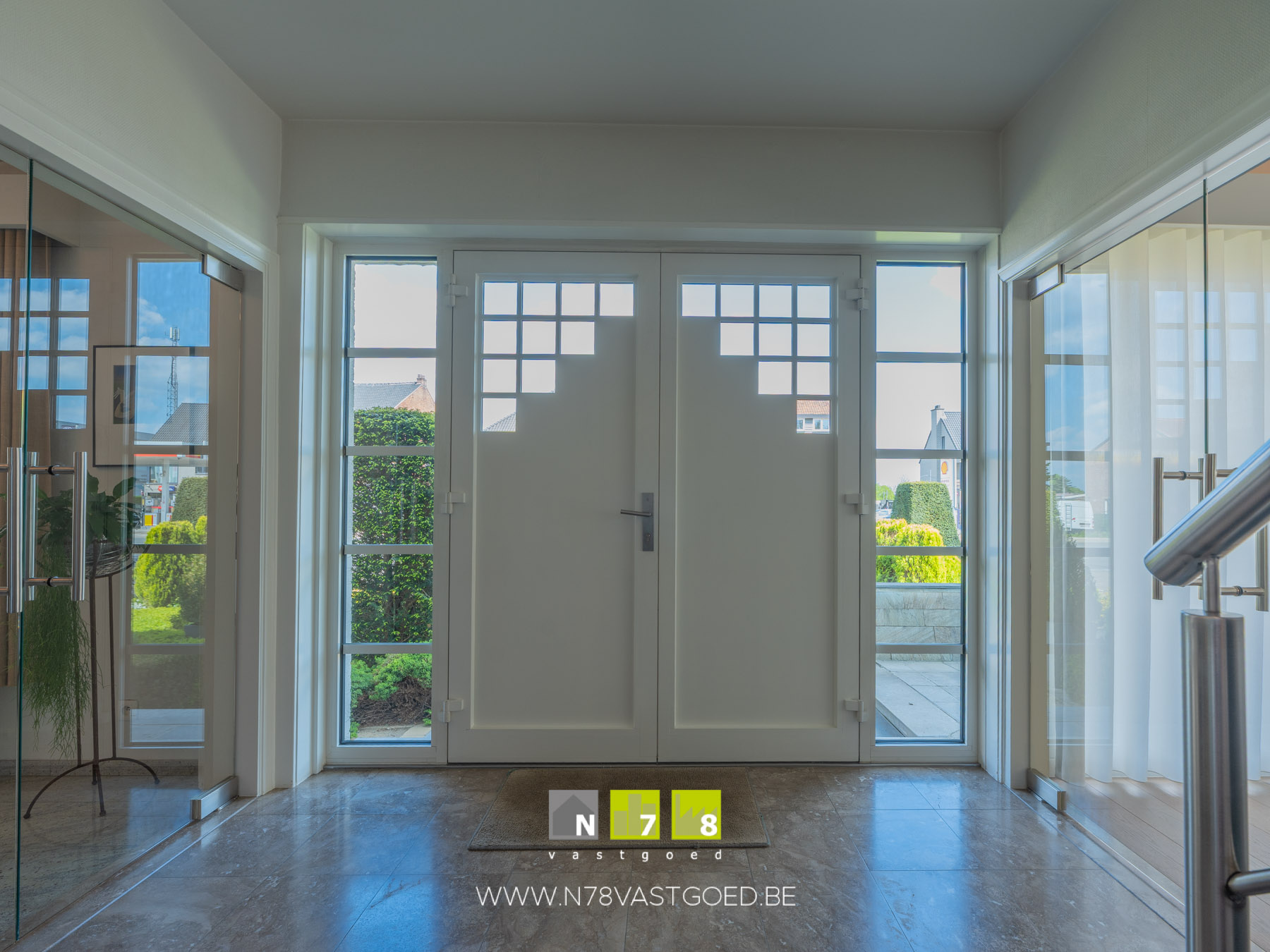 - Inkomhal (2,96m x 3,91m = 11,57m²): maatkasten, trap naar verdieping, tegelvloer.