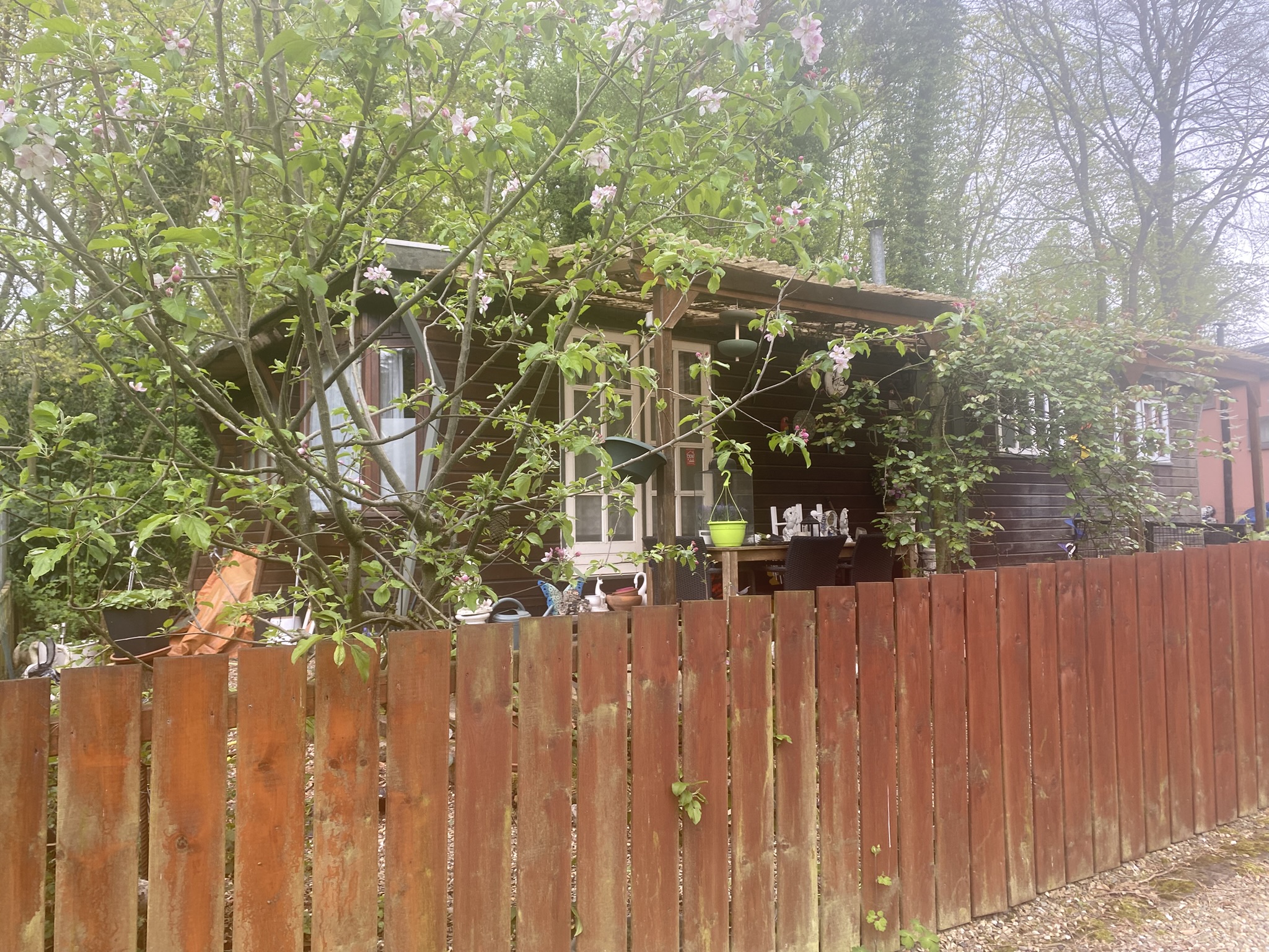 De woonst is een omgebouwde houten caravan. 11,00 m x 3,20 m.