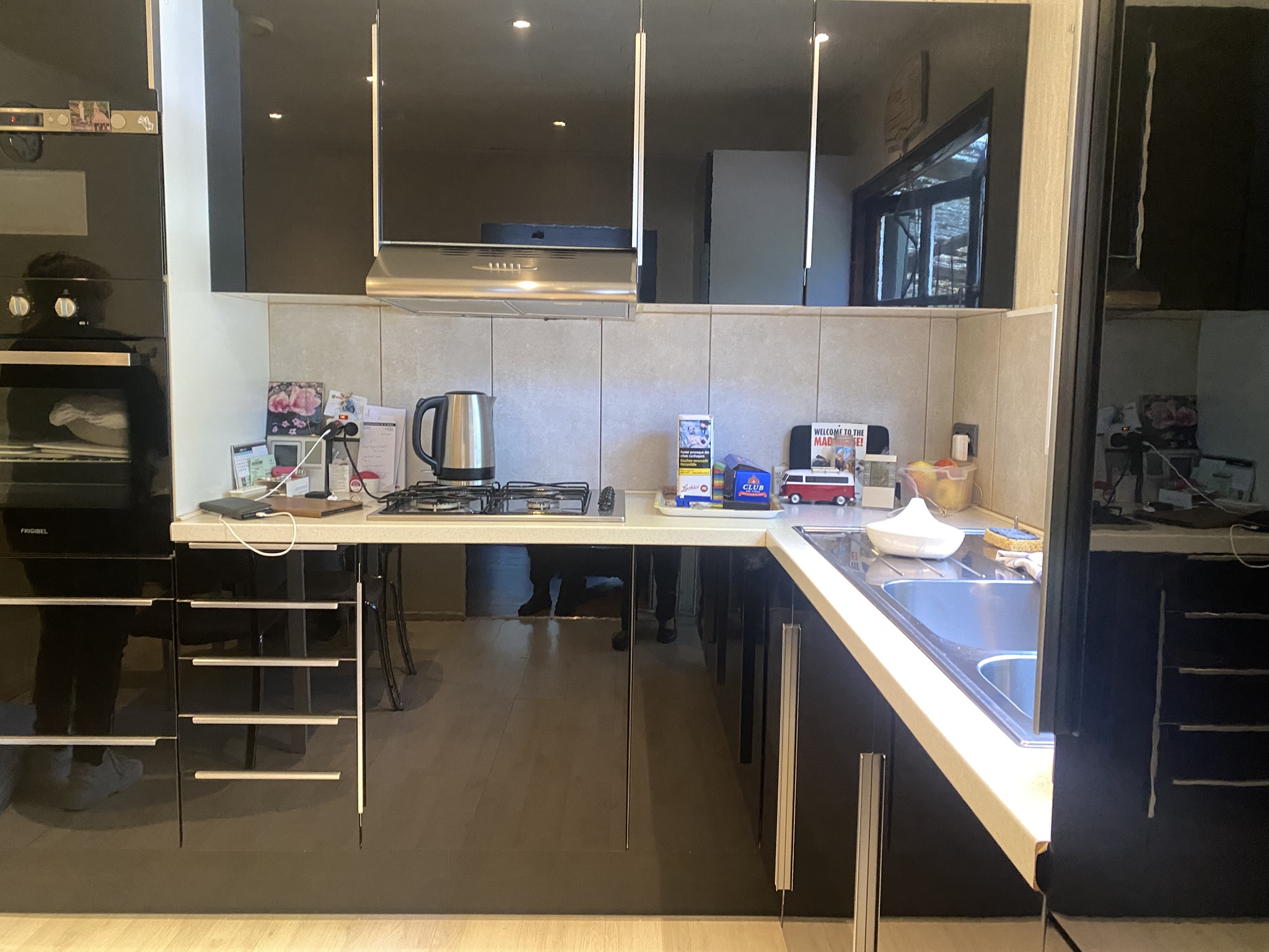 - Keuken: ingericht met inox spoeltafel, gasfornuis en dampkap, 2 ovens, frigo.
