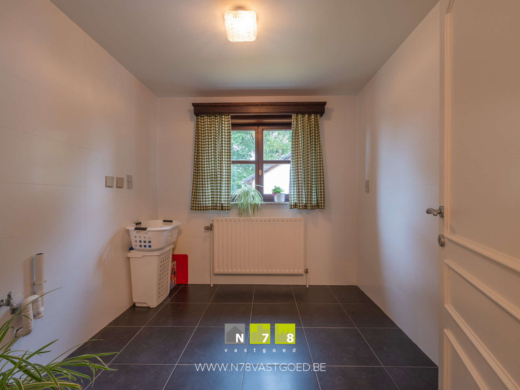 - Wasplaats (2,80m x 2,60m = 7,28 m²): aansluiting wasmachine en droogkast, wandbetegeling, tegelvloer.