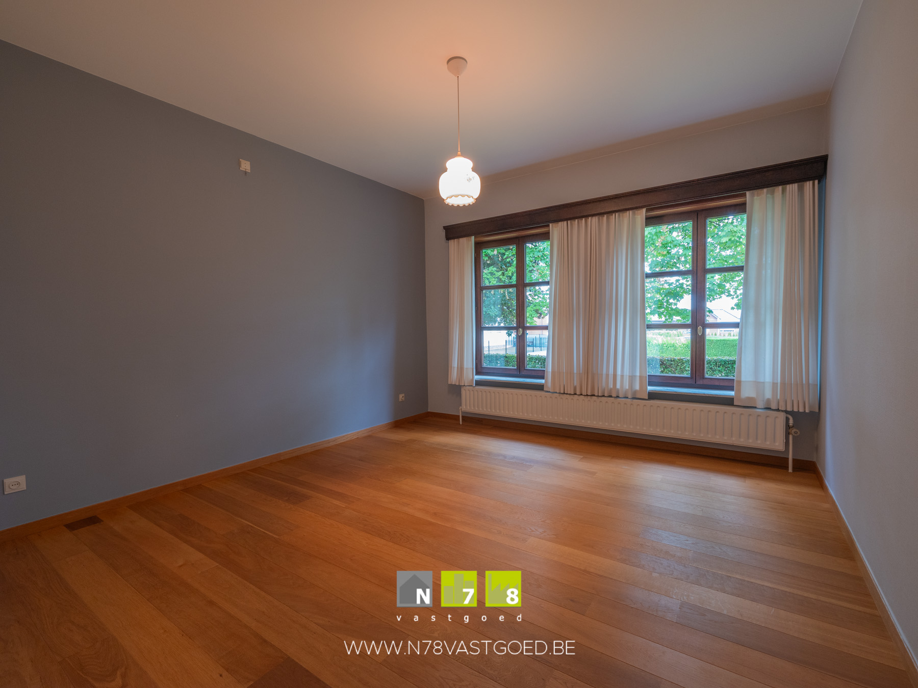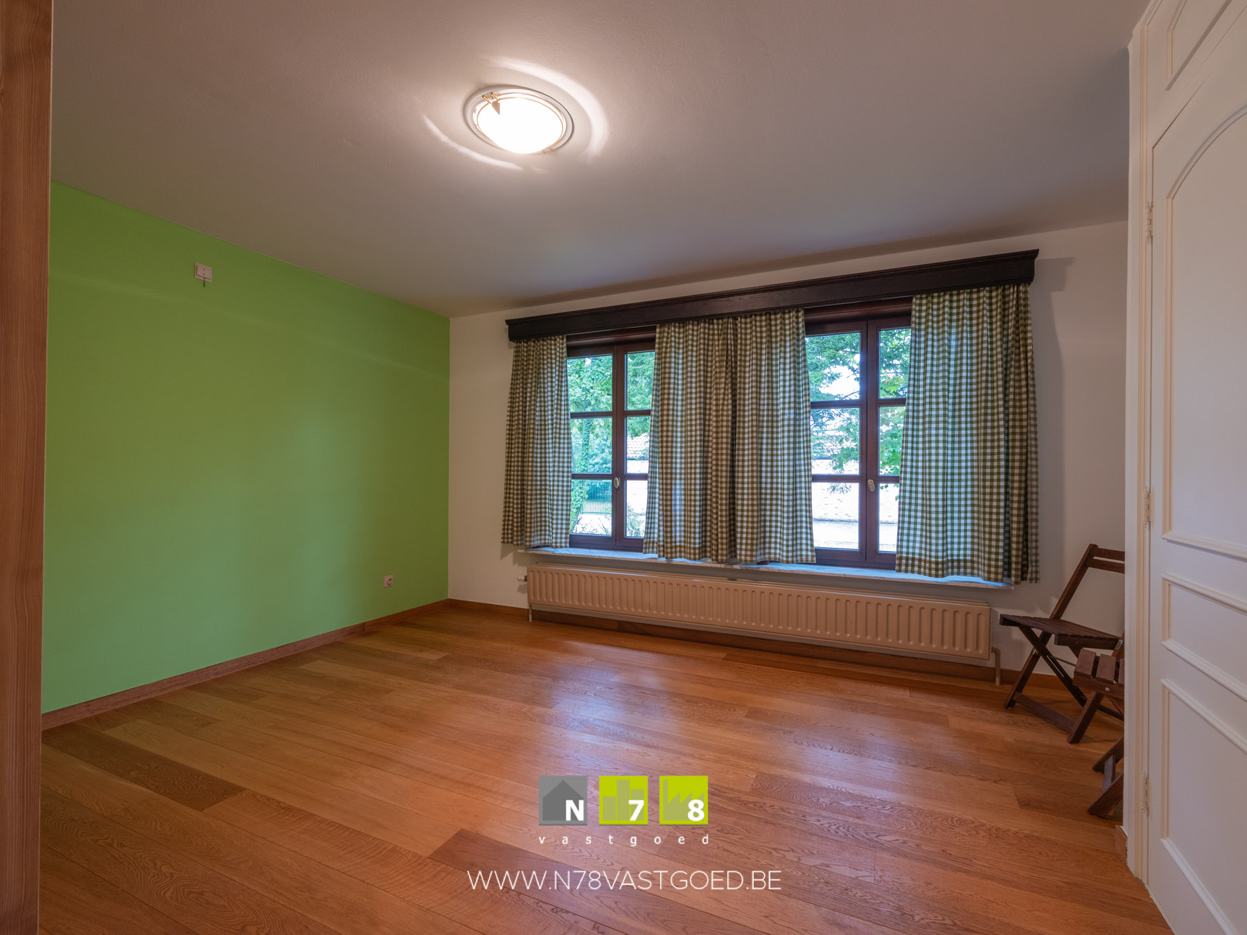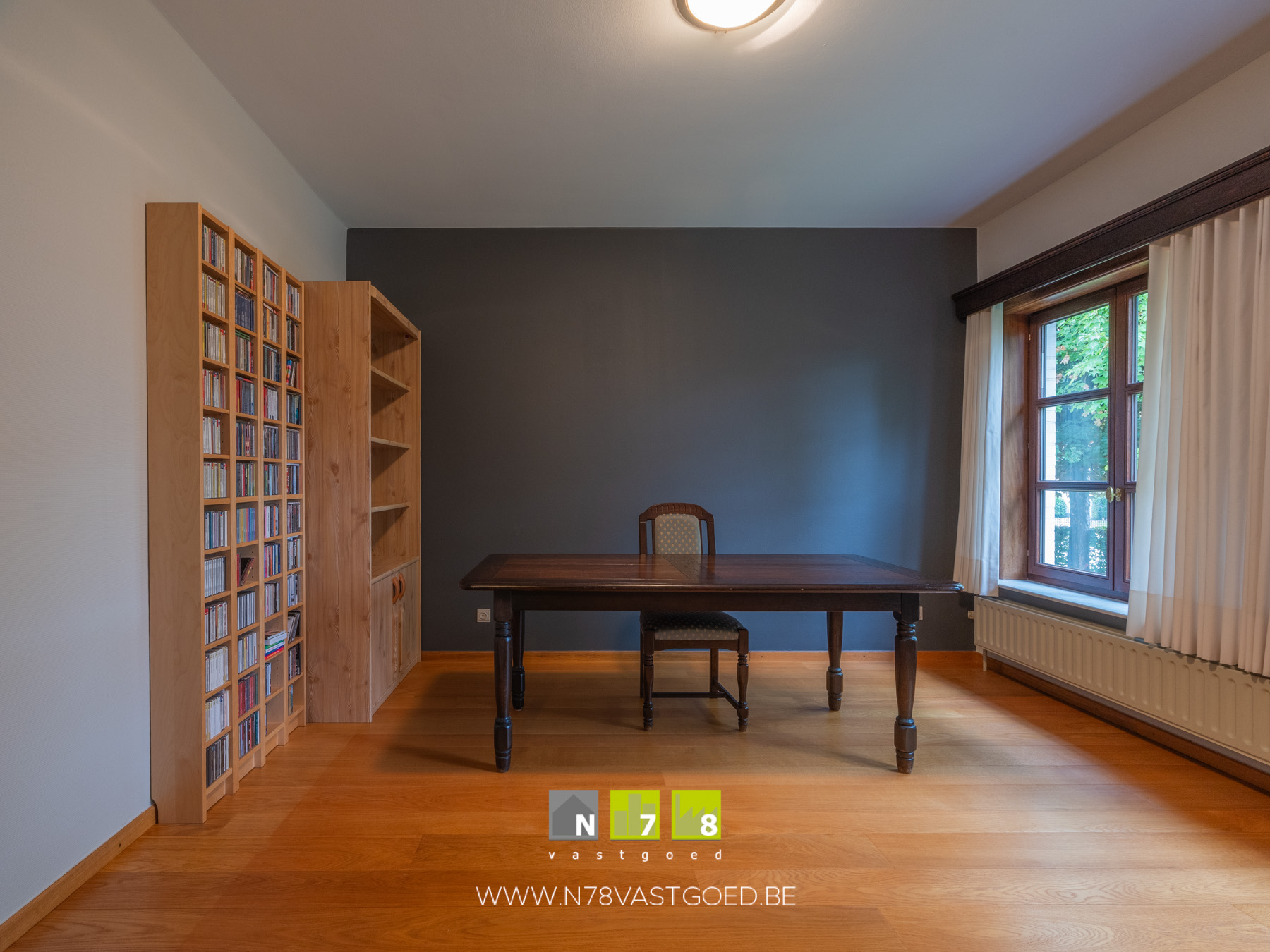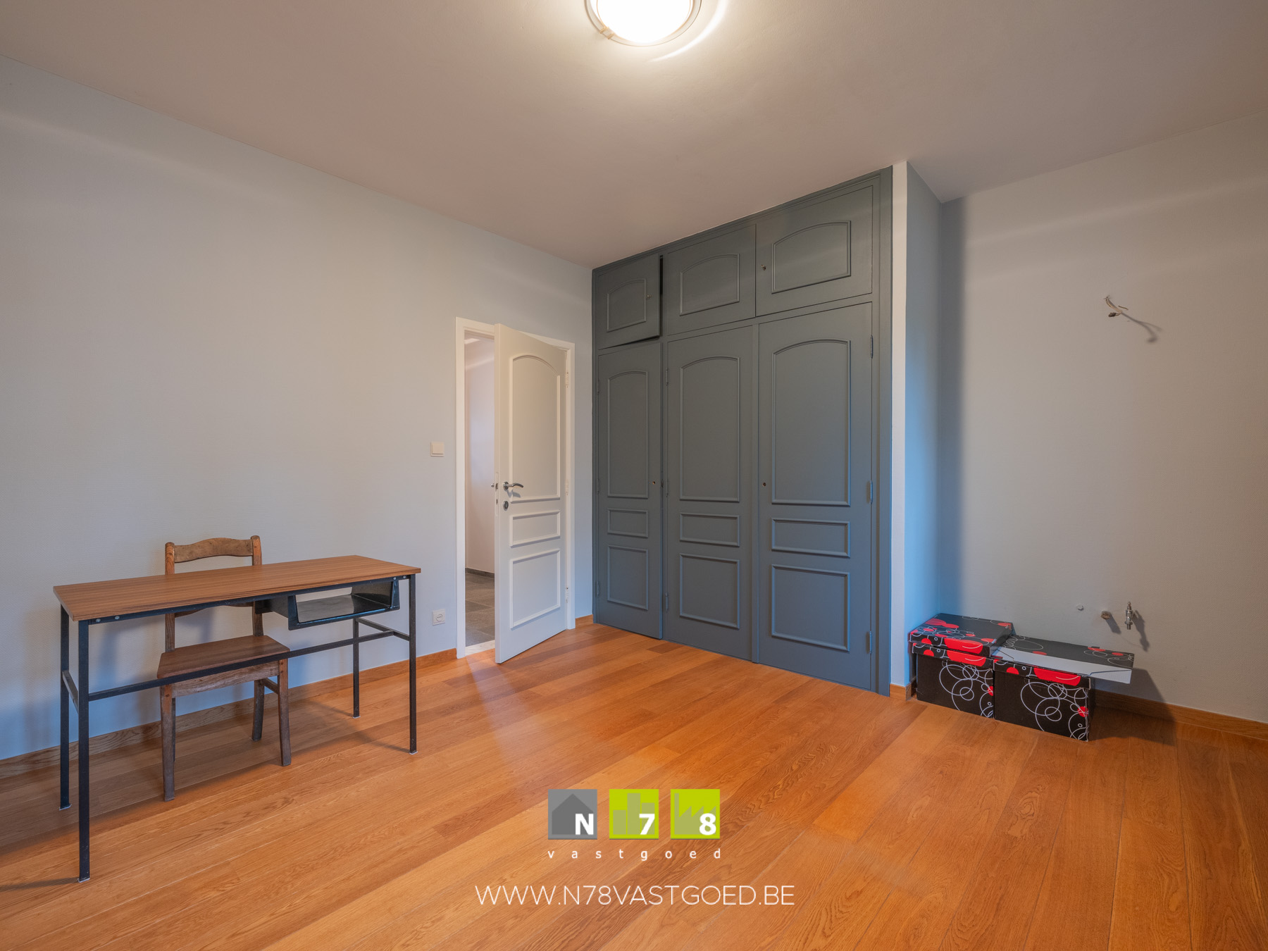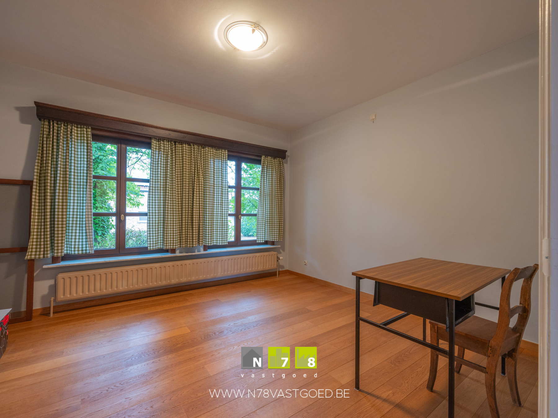 - Bureau/slaapkamer 1 (3,75m x 3,90m = 14,63 m²): parketvloer.