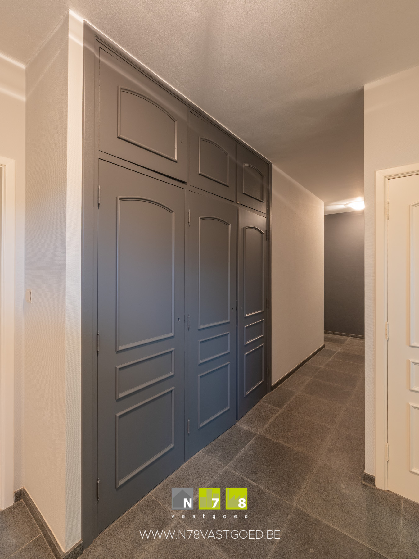- Achterinkom (2,60m x 3,30m = 8,58 m²): inbouwkasten, trap naar kelder, tegelvloer.