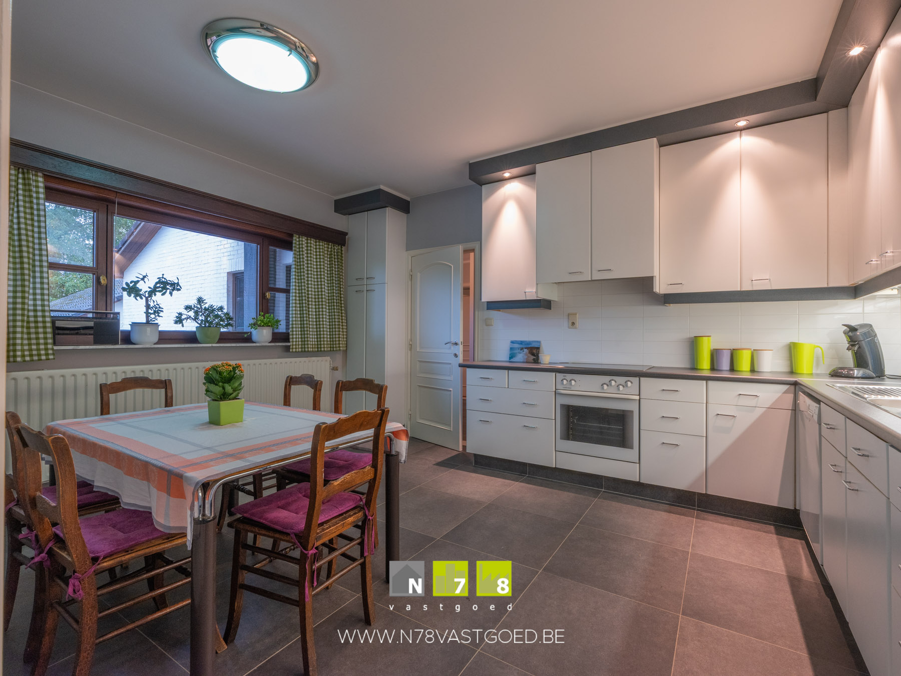 - Keuken (3,60m x 4,70m = 16,92 m²): onder- en bovenkasten, oven, keramische kookplaat, dampkap, vaatwasser, koelkast, tegelvloer.