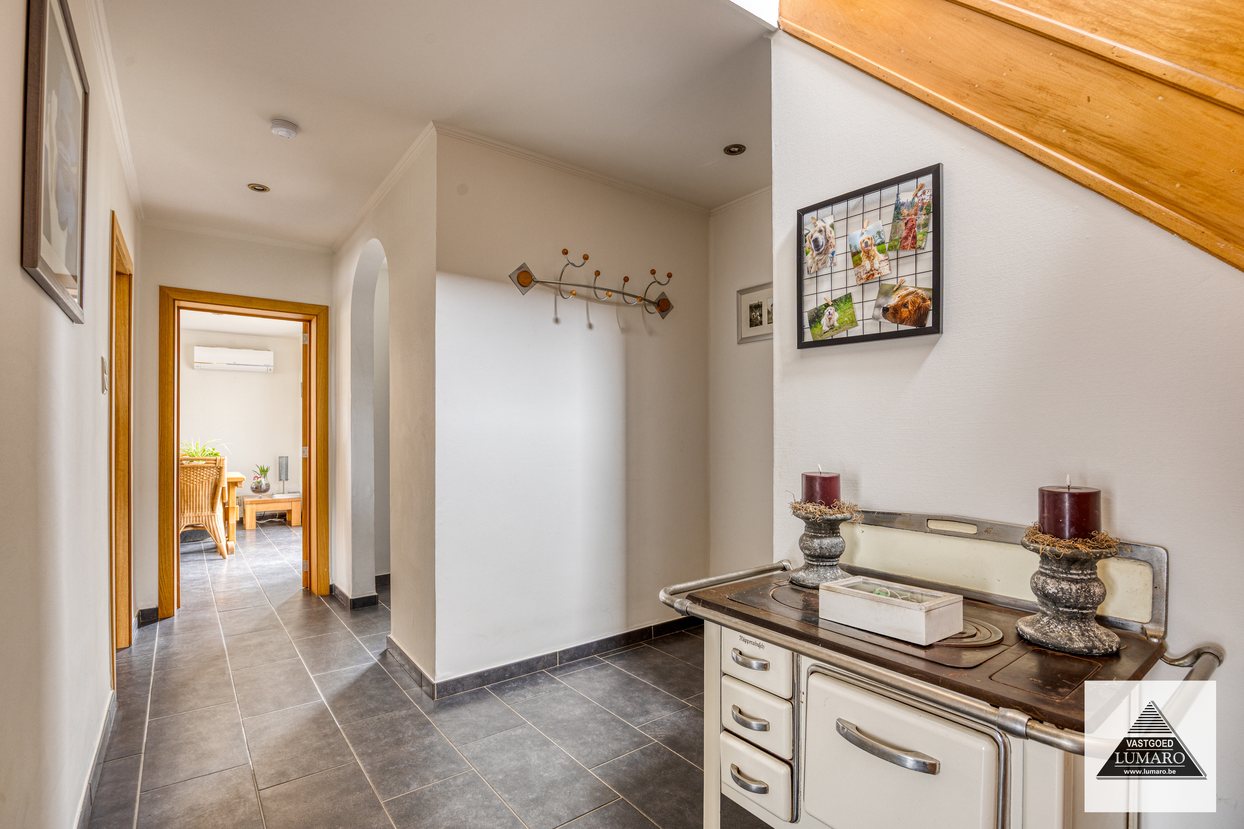 - Inkom: (17 m²) – tegels – centrale inkom die alle ruimtes gelijkvloers verbindt – toegang naar de verdieping – inbouw bergkast met schuifdeuren, plafondhoogte.