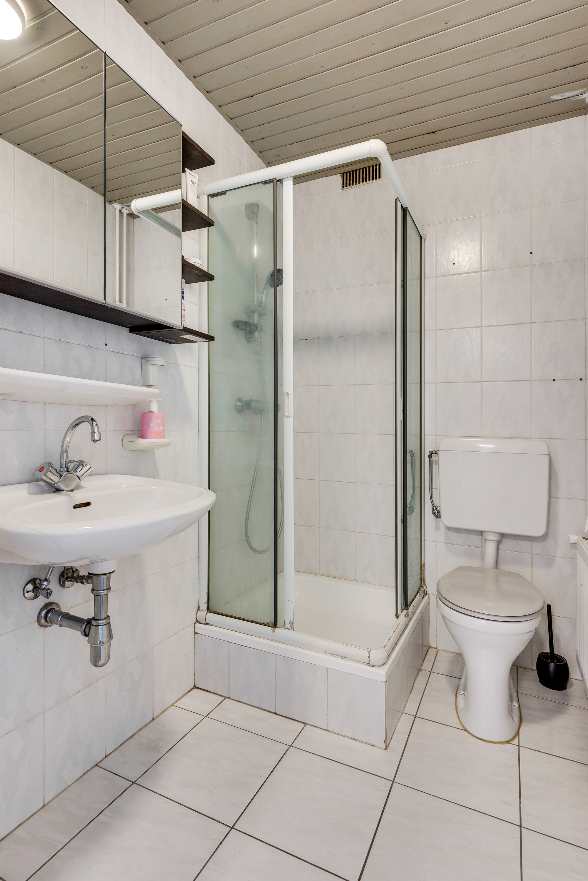 De ruime overloop geeft hier toegang tot de 3 slaapkamers, een tussenkamer en de badkamer. De badkamer beschikt over een douchecabine, een toilet en een wastafel met spiegelkast. De overloop en de slaapkamers zijn voorzien van één vinylvloer.