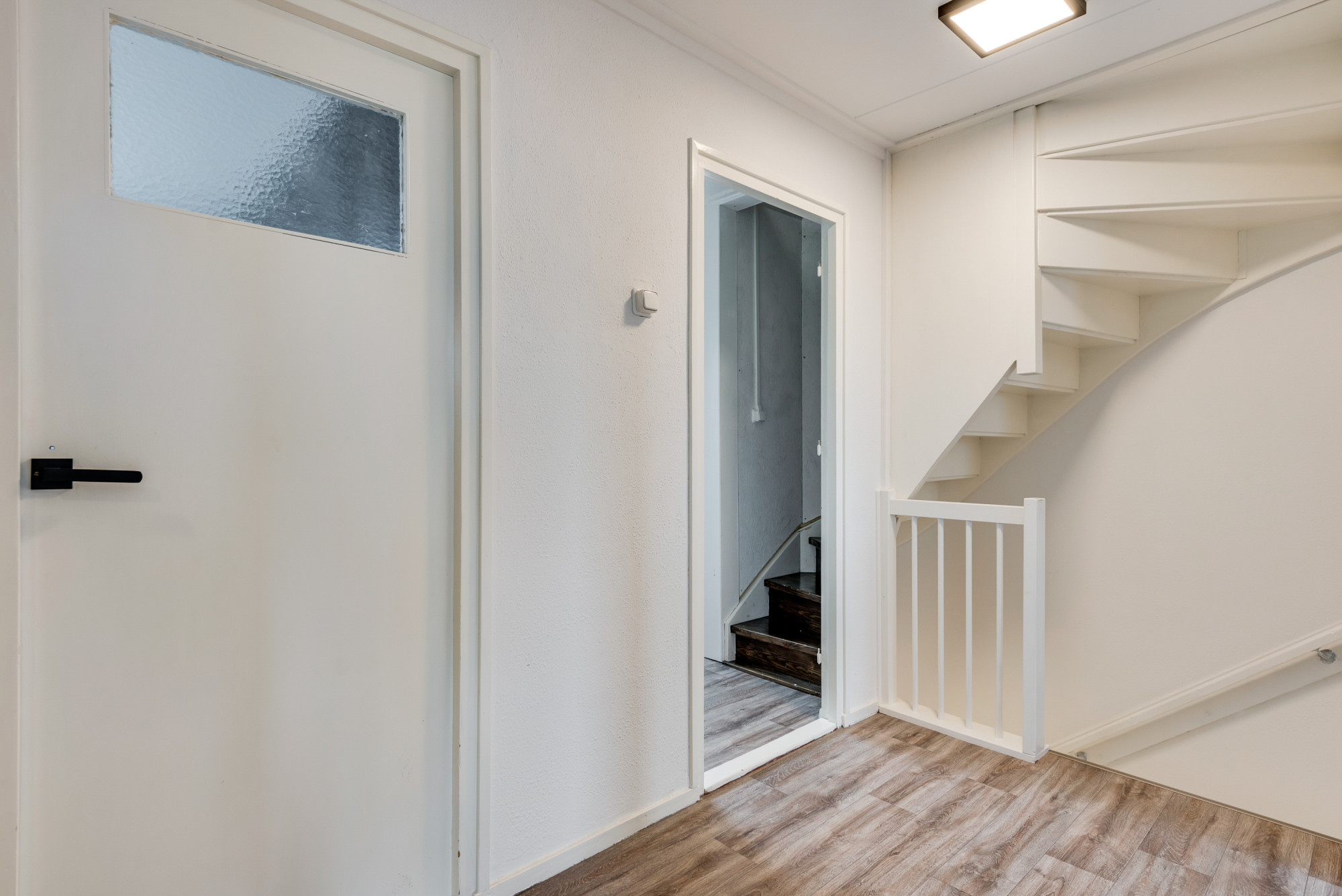 De hal/entree met pvc vloer biedt hier toegang tot de vernieuwde meterkast, de moderne toiletruimte met zwevend toilet en fonteintje, de trapopgang naar de eerste verdieping en de woonkamer. De woonkamer is tevens voorzien van een pvc vloer en heeft veel lichtinval door de grote raampartijen. Via de open keuken is de woonkamer bereikbaar, deze is ook voorzien van dezelfde pvc vloer. De keuken is voorzien van een moderne keukencombinatie met inbouwapparatuur; inductiekookplaat, afzuigkap, koelkast, combimagnetron en vaatwasser. De moderne keuken biedt toegang tot een praktische provisiekelder en de achtertuin met overkapping en berging.
