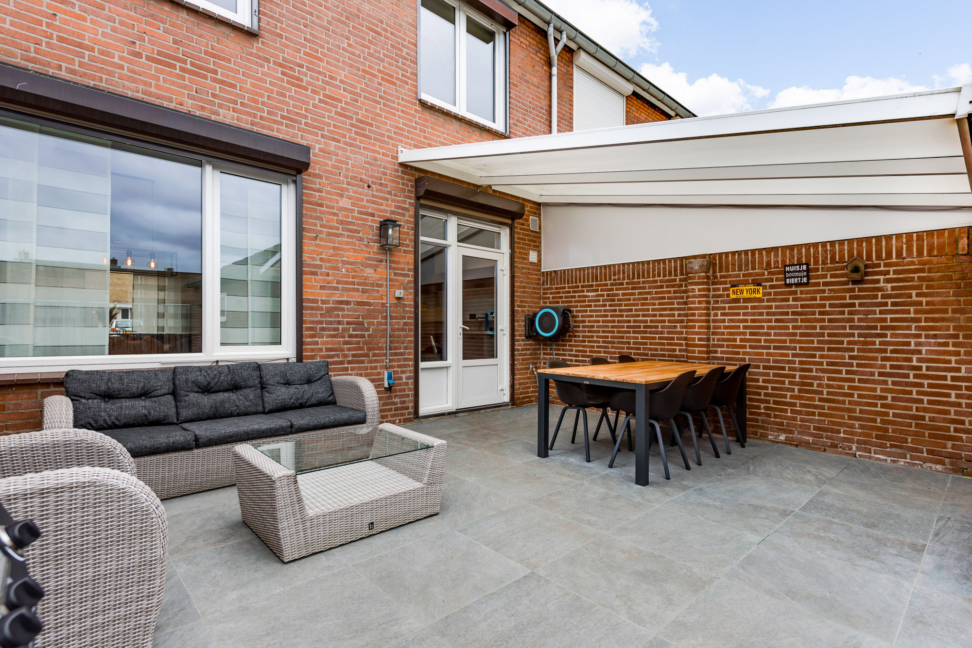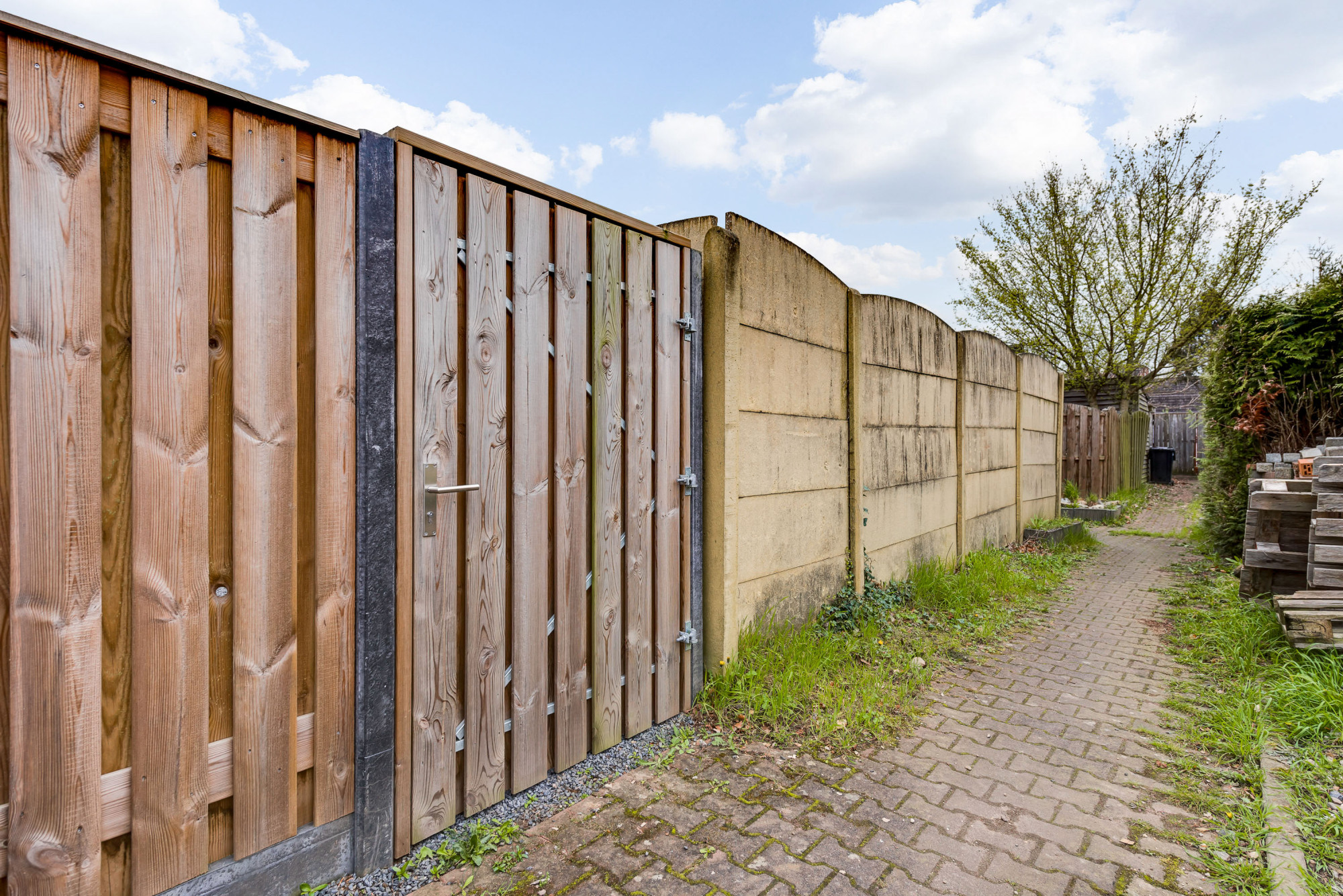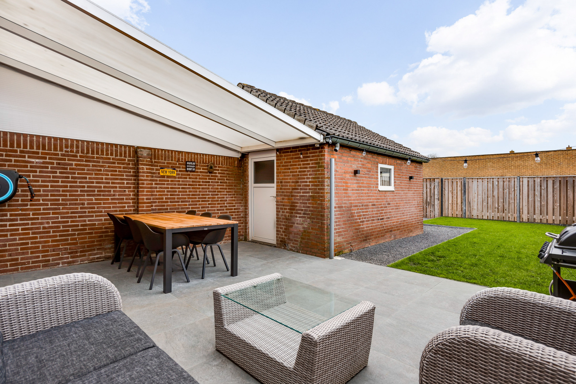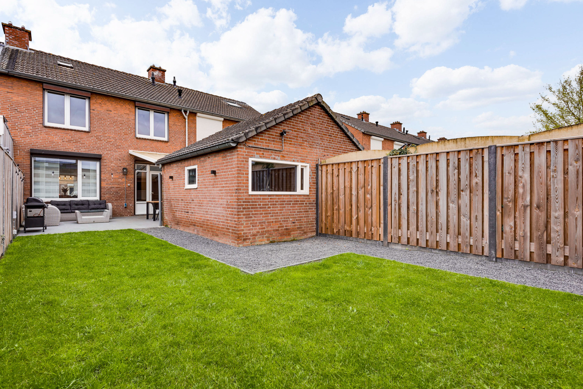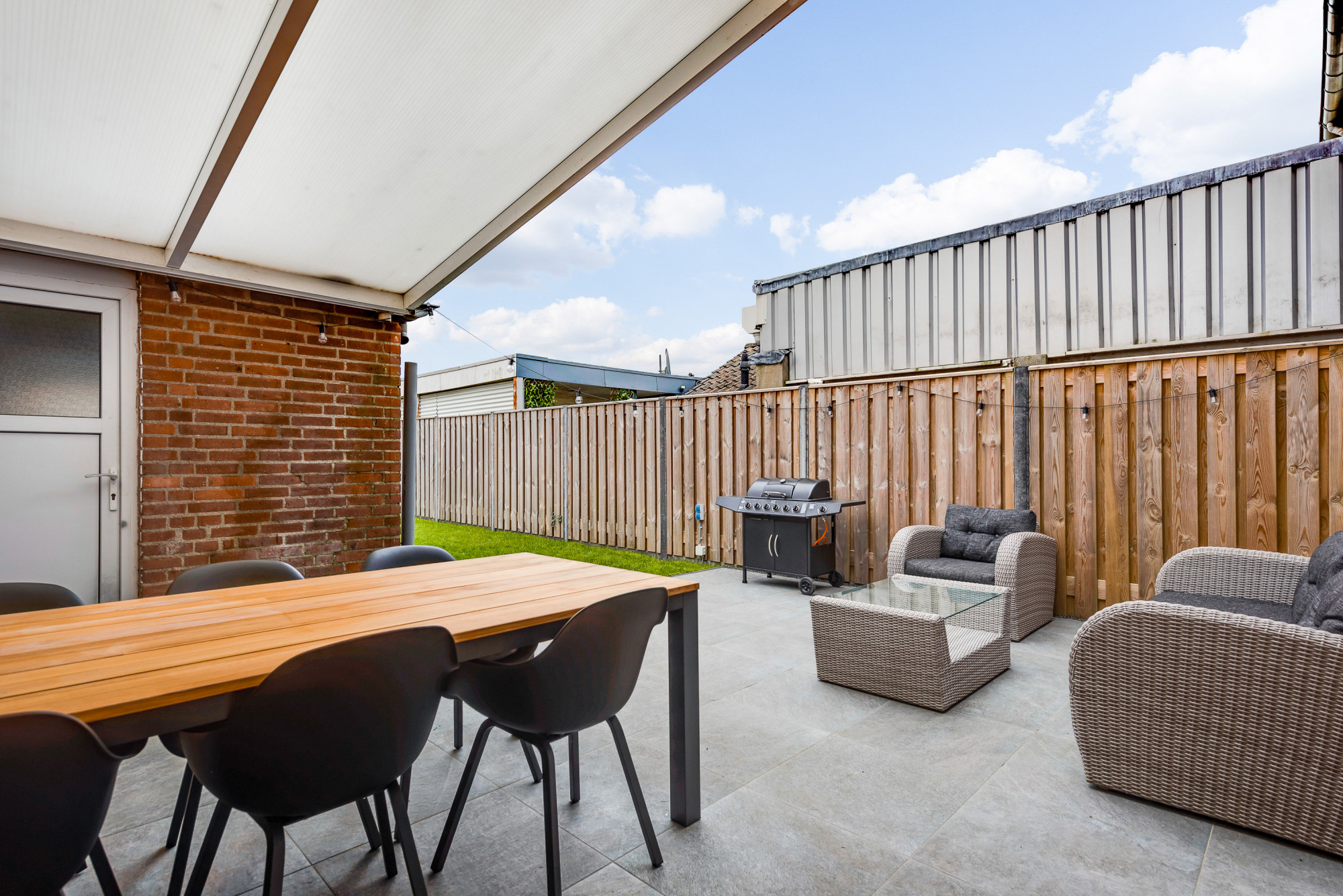 De achtertuin heeft de beschikking over een overkapping, terras, gazon, een achterom en een vrijstaande stenen berging.