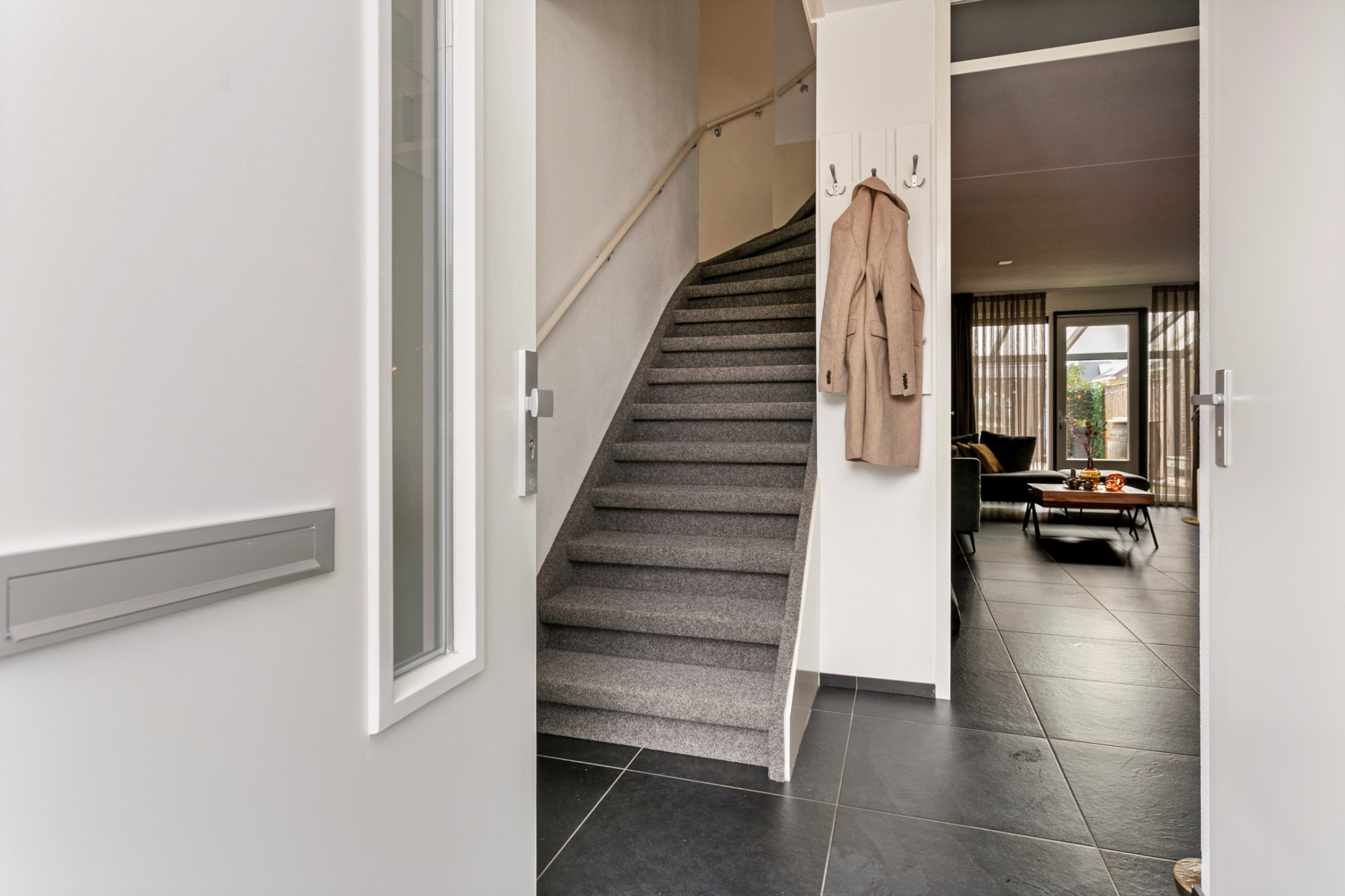 Entree / hal met meterkast en het toilet. Het toilet is voorzien van wandcloset en fonteintje. De ruime sfeervolle woonkamer (34m²) is voorzien van een trapberging en biedt toegang naar de tuin. De woonkamer beschikt over een sfeervolle ingebouwde gashaard. De moderne open keuken is vanuit de woonkamer te bereiken. De keuken is voorzien van inrichting in hoekopstelling en beschikt over de volgende apparatuur: afzuigkap, 4 pits inductie kookplaat, combi magnetron, vaatwasser, koelkast. De gehele begane grond is voorzien van een plavuizen vloer.