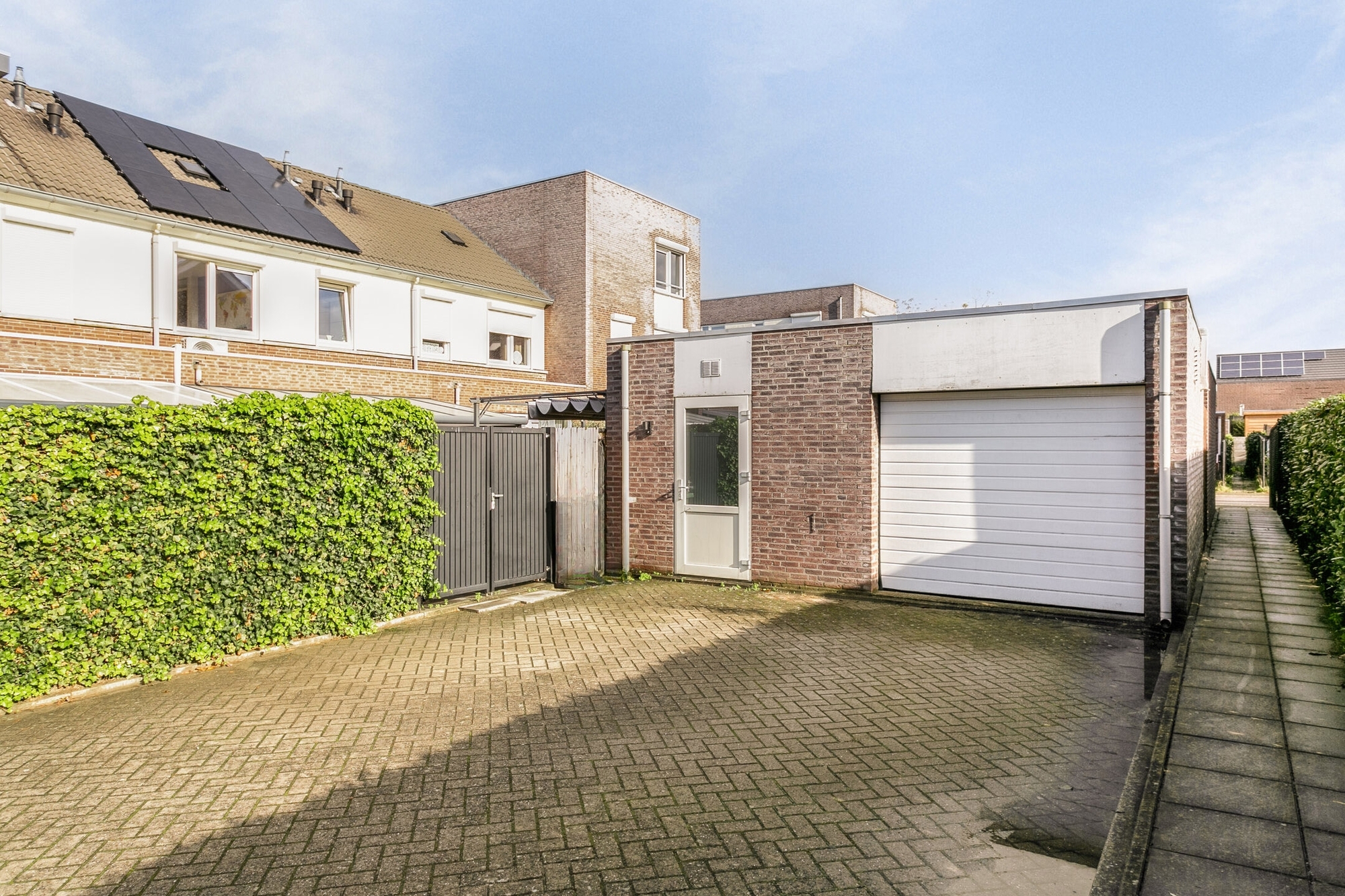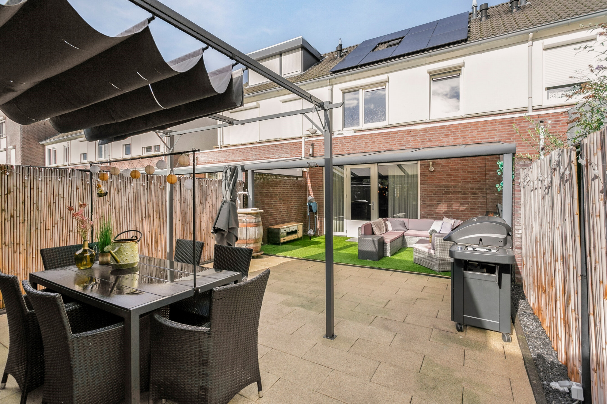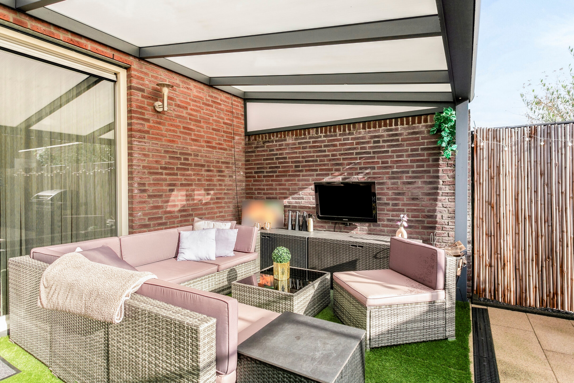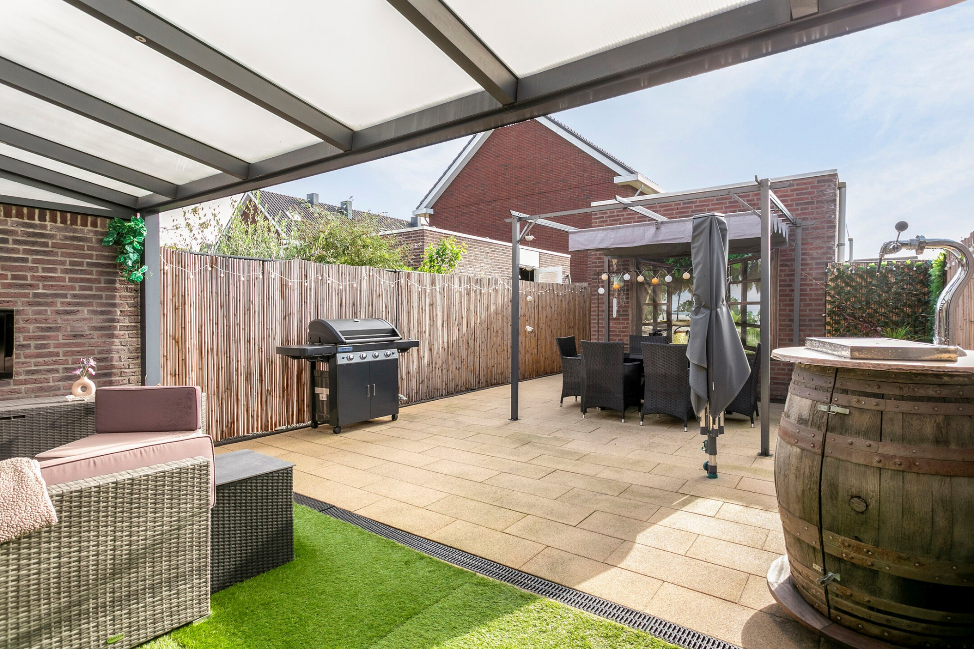 De achtertuin is gelegen op het zuidwesten en beschikt over een ruime terrasoverkapping waar het heerlijk vertoeven is. Aan de achterzijde van de woning heeft men vanuit de tuin toegang naar de volledig geïsoleerde garage welke tevens is voorzien van een elektrische sectionaal poort