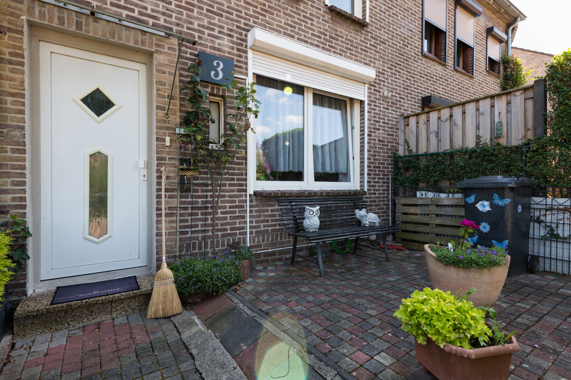 De voortuin is netjes onderhouden. De achtertuin, welke buitenom is te bereiken via een brandgang, grenst rechtstreeks aan de naaste en achterburen. In deze tuin is ook de extra ingang (buitenom) naar de kelder.