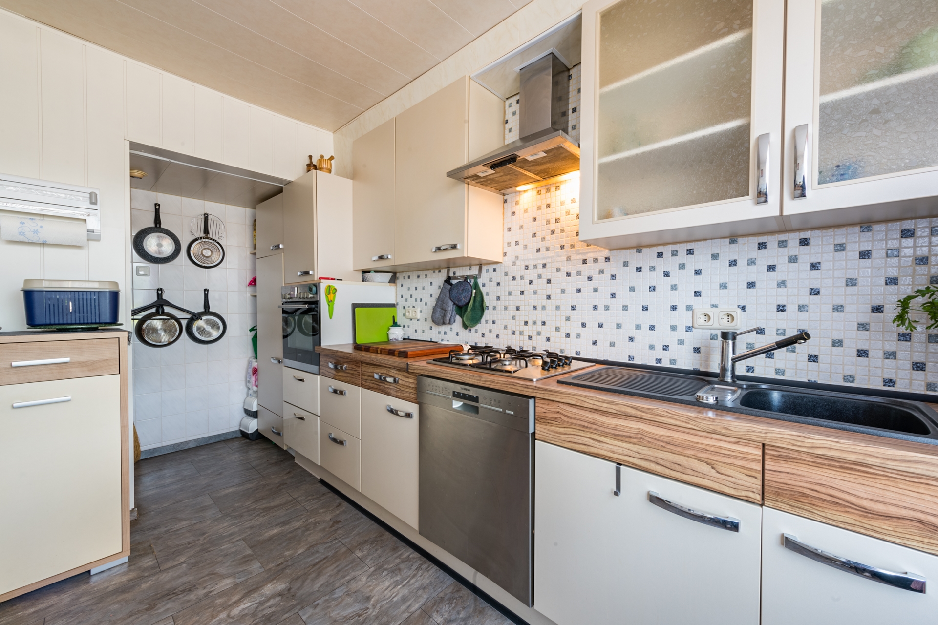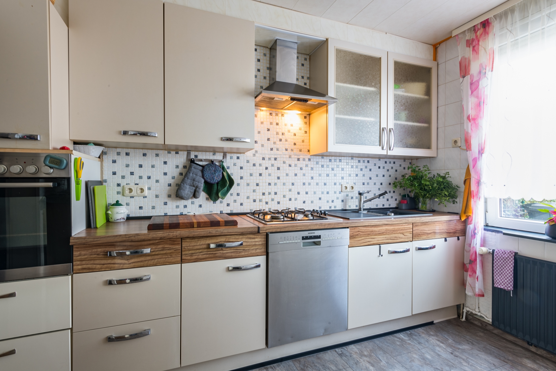 gaskookplaat, oven, afzuigkap, vaatwasmachine en koelkast.