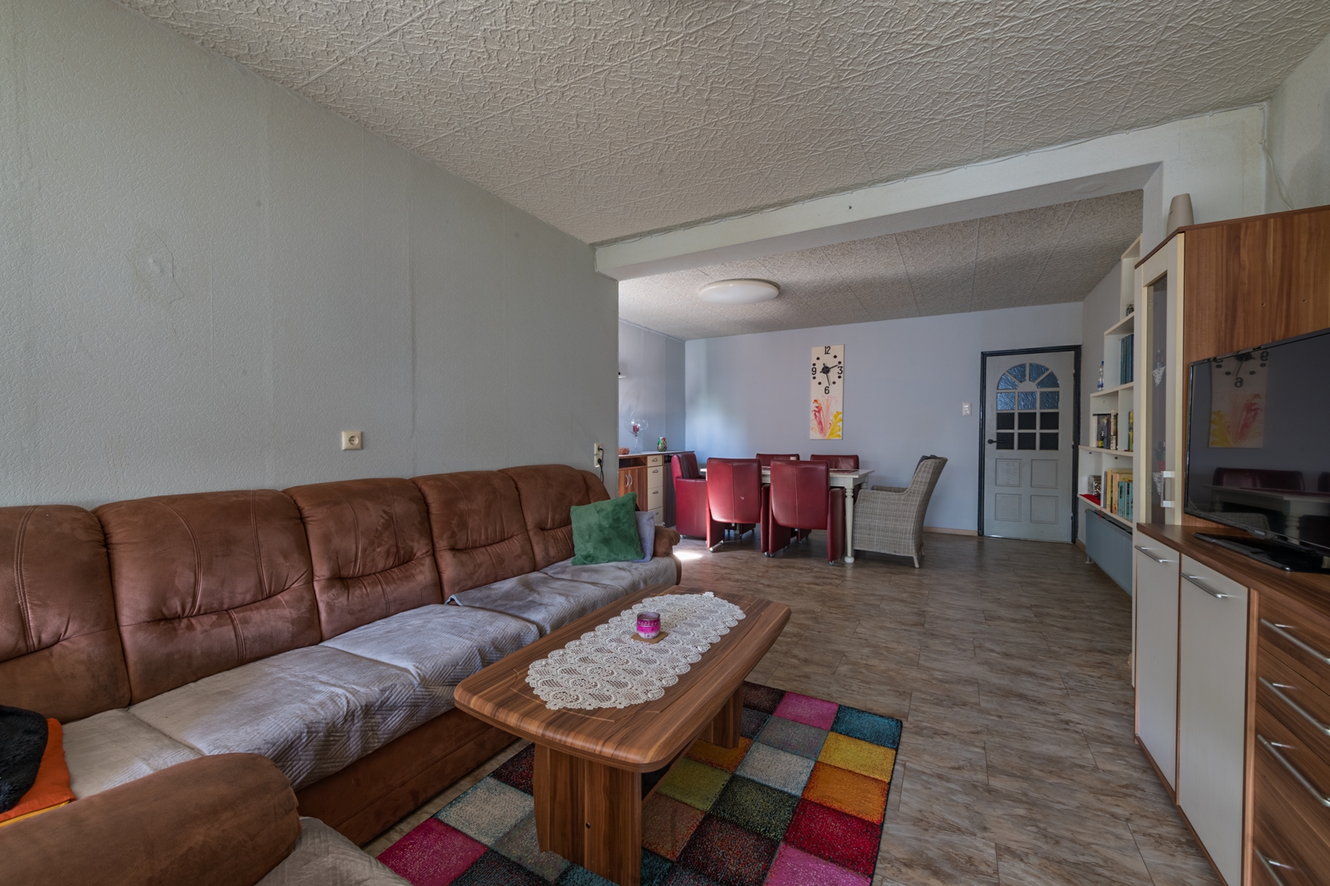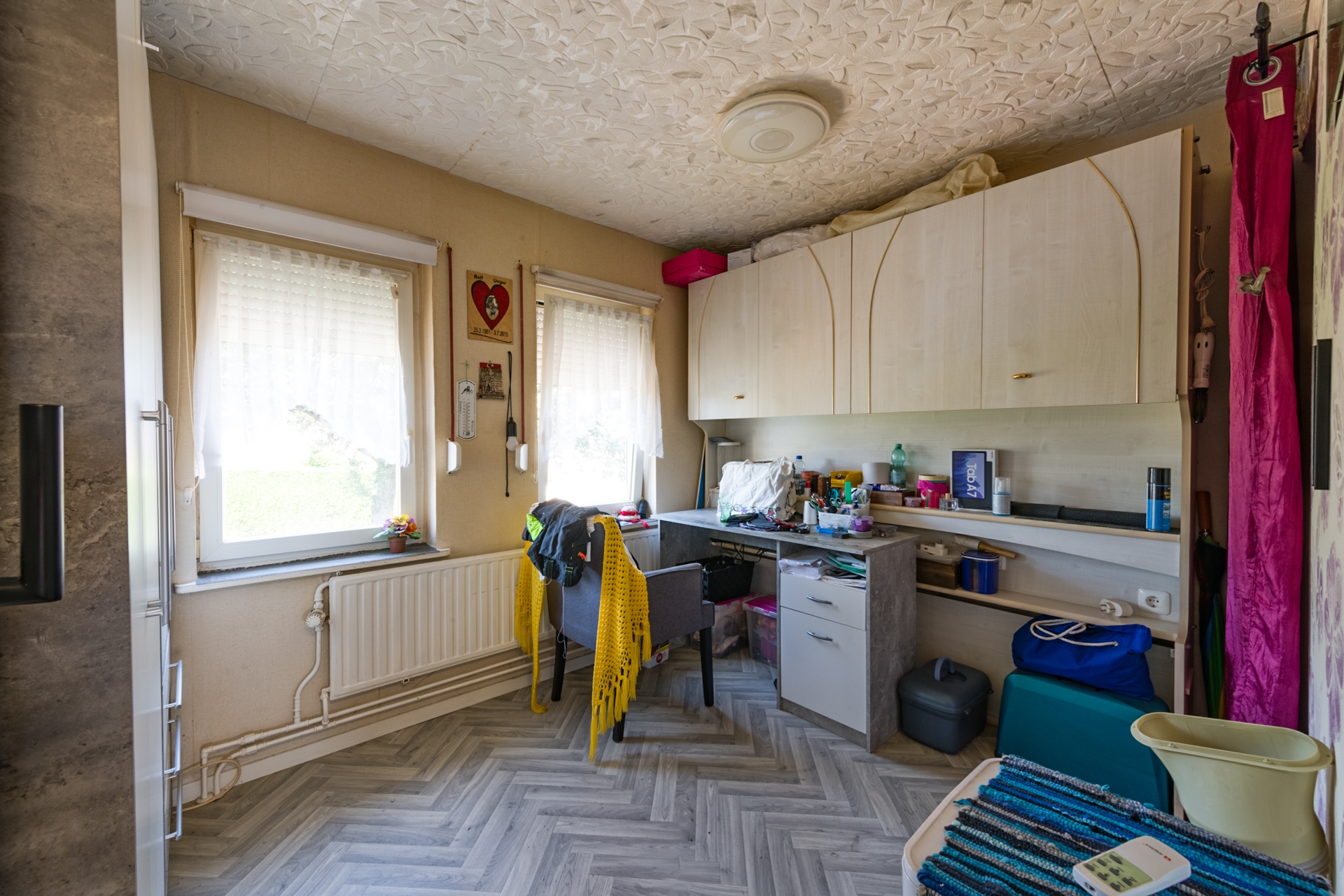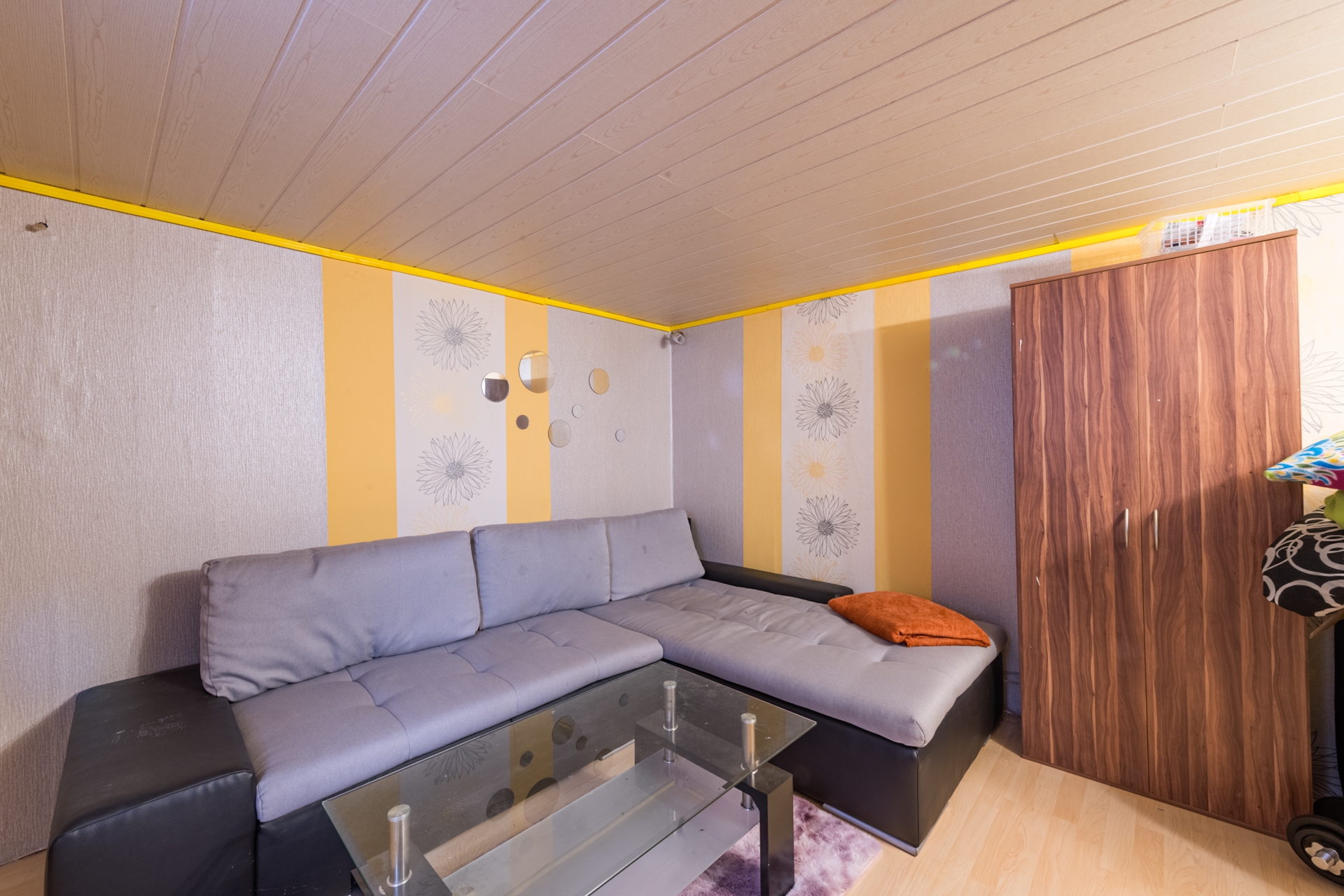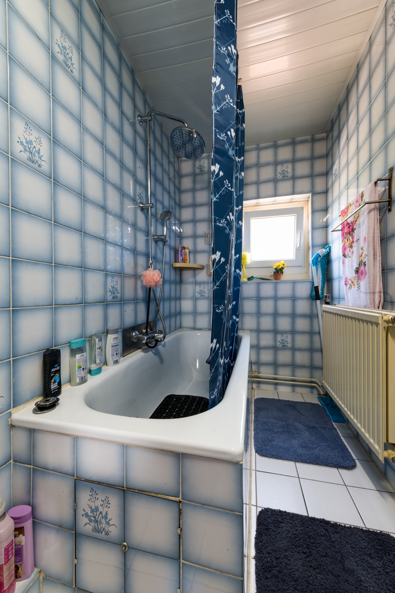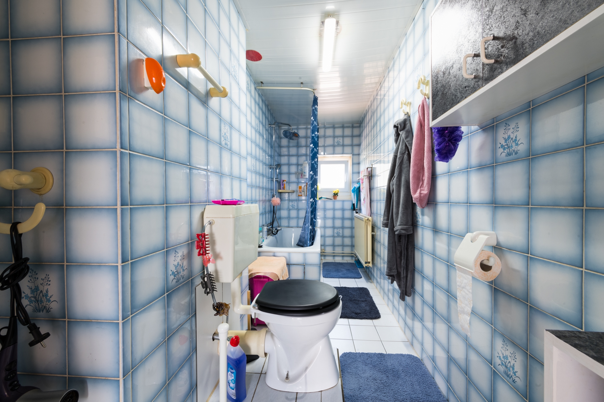 Ook hier ligt een laminaat op de vloer en zijn de wanden betegeld of met kunststof platen bekleed.