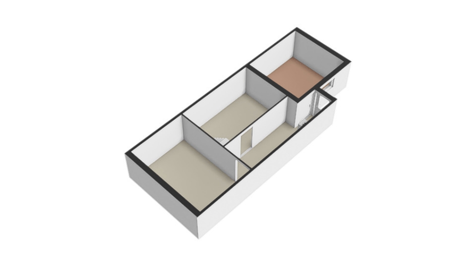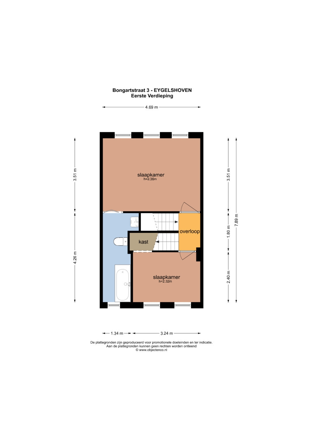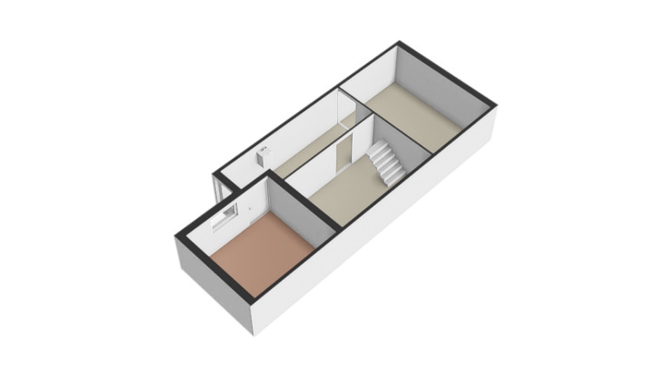 Met een vaste trap komen we op de overloop waaraan de 2 slaapkamers grenzen. Een slaapkamer aan de voorzijde (324 x 240 cm) en een over de gehele breedte van de woning (469 x 351 cm) aan de achterzijde.